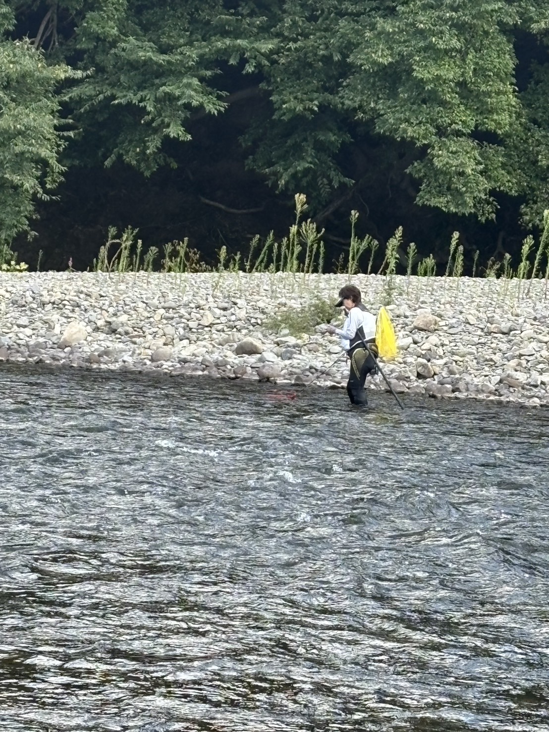 昼からは花田さんに狙う石の色や、囮の操作や穂先が曲がらないように0を保ってもらうように声を掛け、花田さんの上へ入り、昼からは胴調子の竿でポツポツ掛かります。花田さんにも待望の鮎が♪