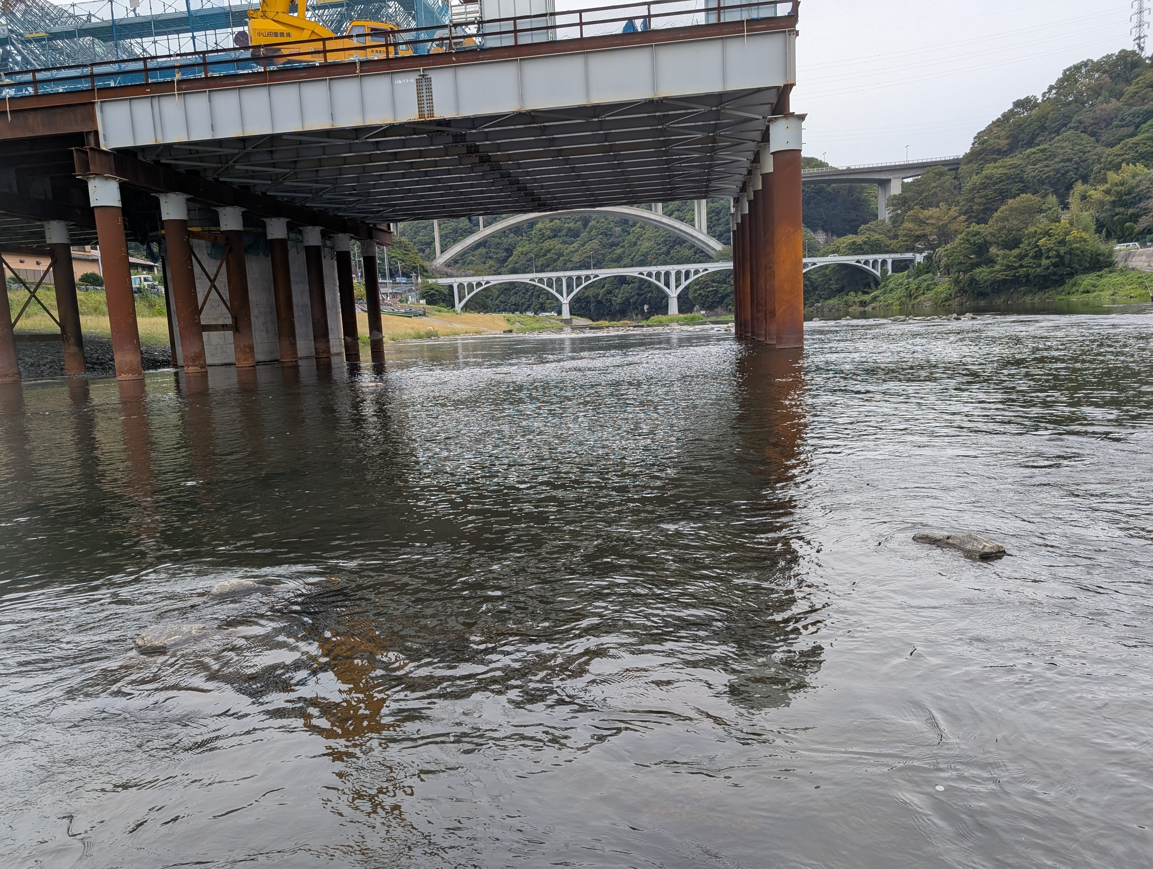 今回は、先日30.1cmが釣れたと話題になっていた相模川上大島地区へ釣行。12時過ぎにいつもの「高田橋友鮎販売所」でオトリを購入して情報を聞いてみると、瀬ではあまり掛からなくなってきて、「リニア下」のトロ場で大きいのが掛かるとのこと。早速上大島地区へ行ってみると以前より釣り人も減ってまばらで「リニア下」のトロ場(トロ瀬?)にも入れそうなので、釣り人を避けて大きく迂回しながらポイントまで川の中を移動。竿を出せたのは13時過ぎでした。