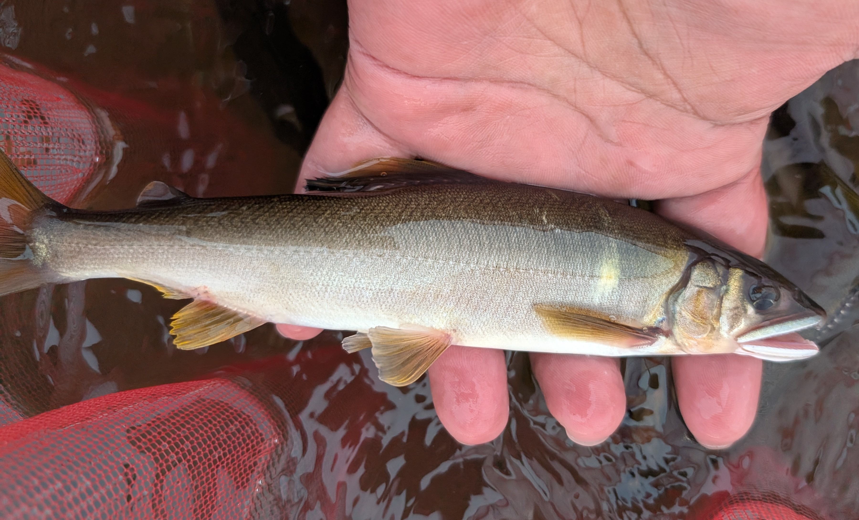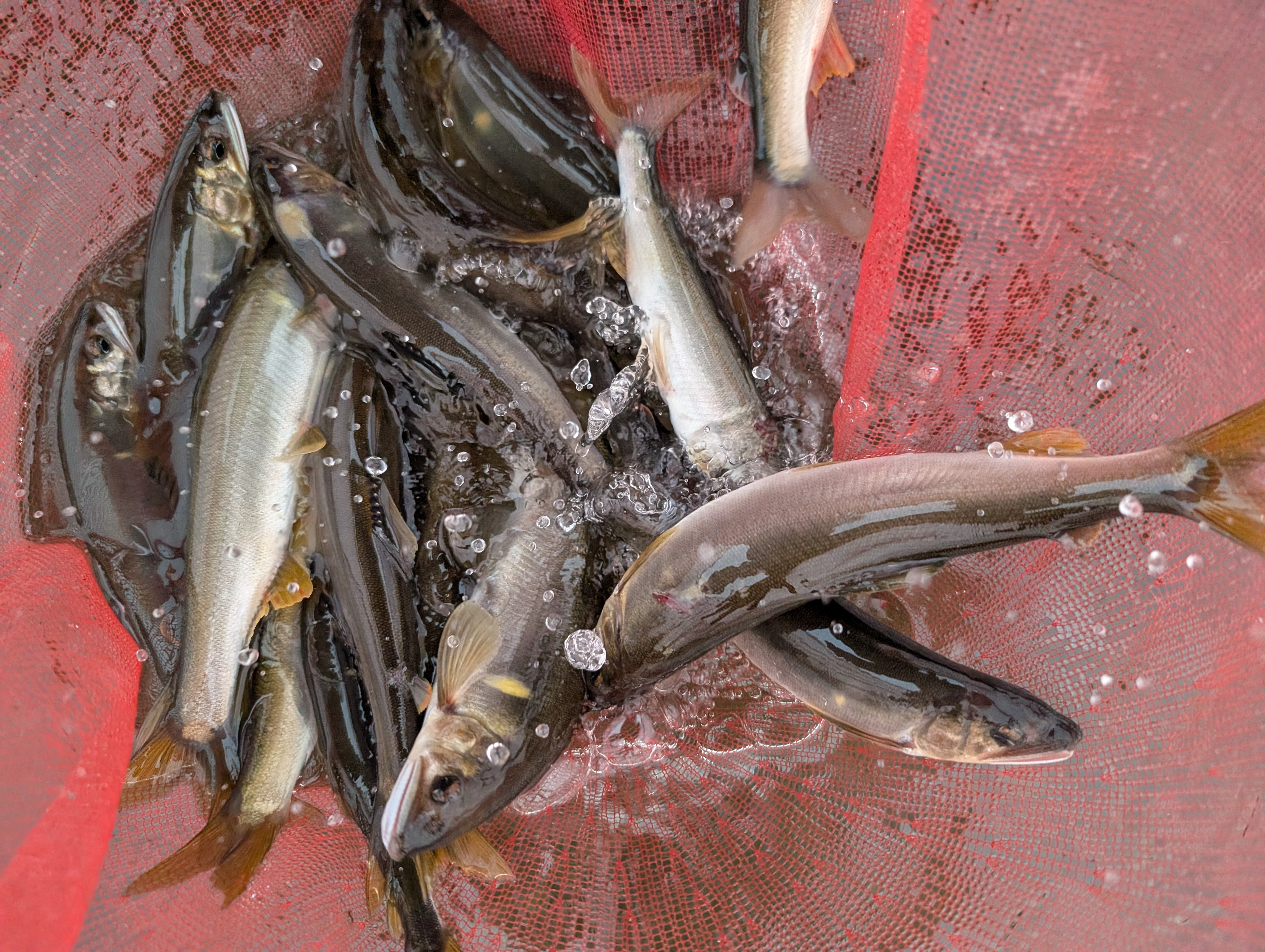 水深が膝からお腹ぐらいまでのトロ瀬を泳がせで広範囲に攻めてみると、ポツリポツリと掛かりますが、サイズは20cm以下が多くオトリにならないサイズも掛かってきます。たまに20~23cmが掛かりますが、大きい鮎は落ち始めているのか小型の若い鮎中心です。