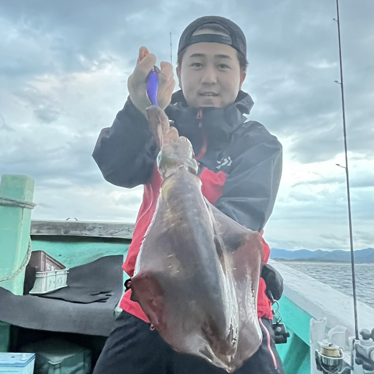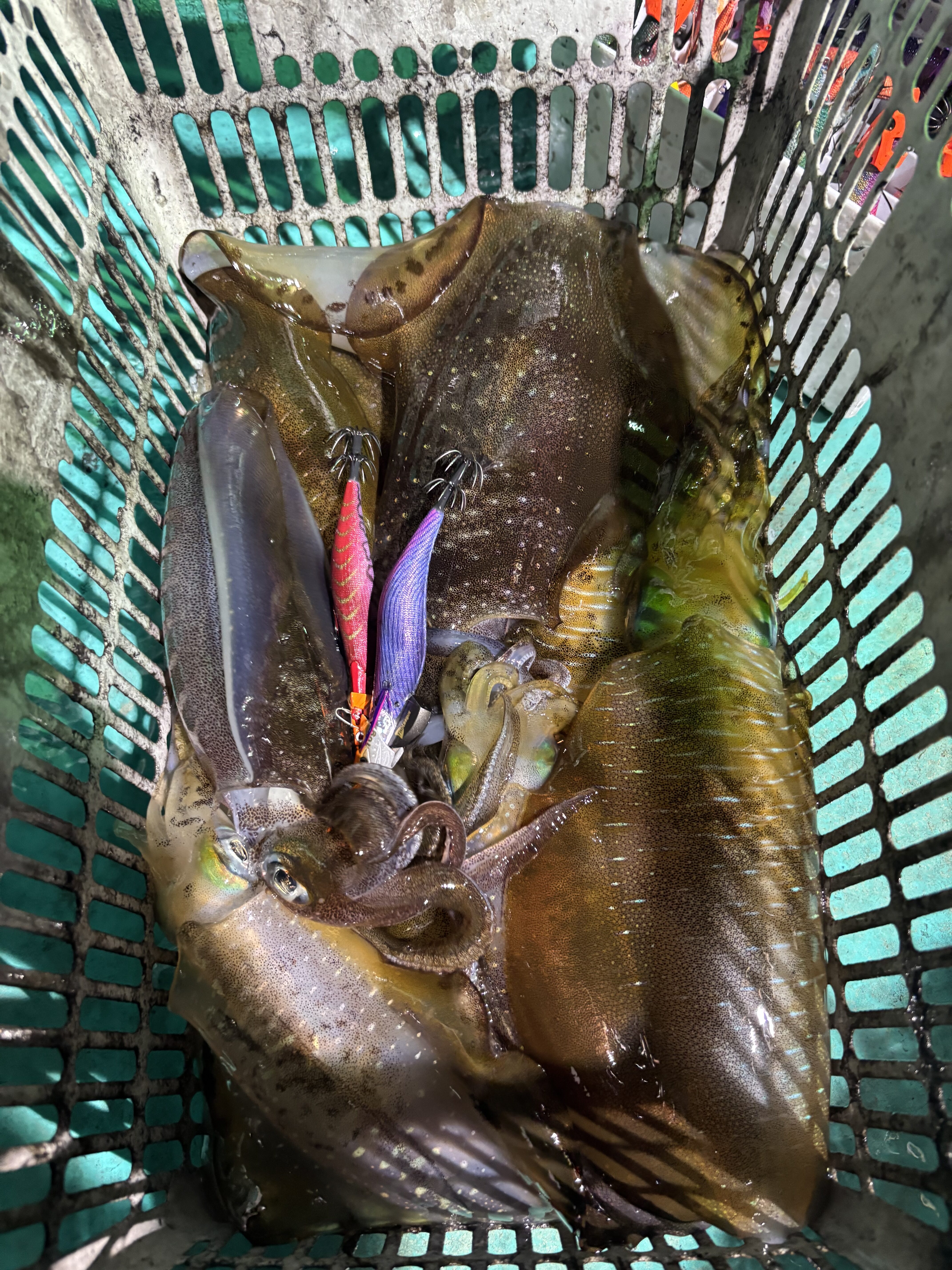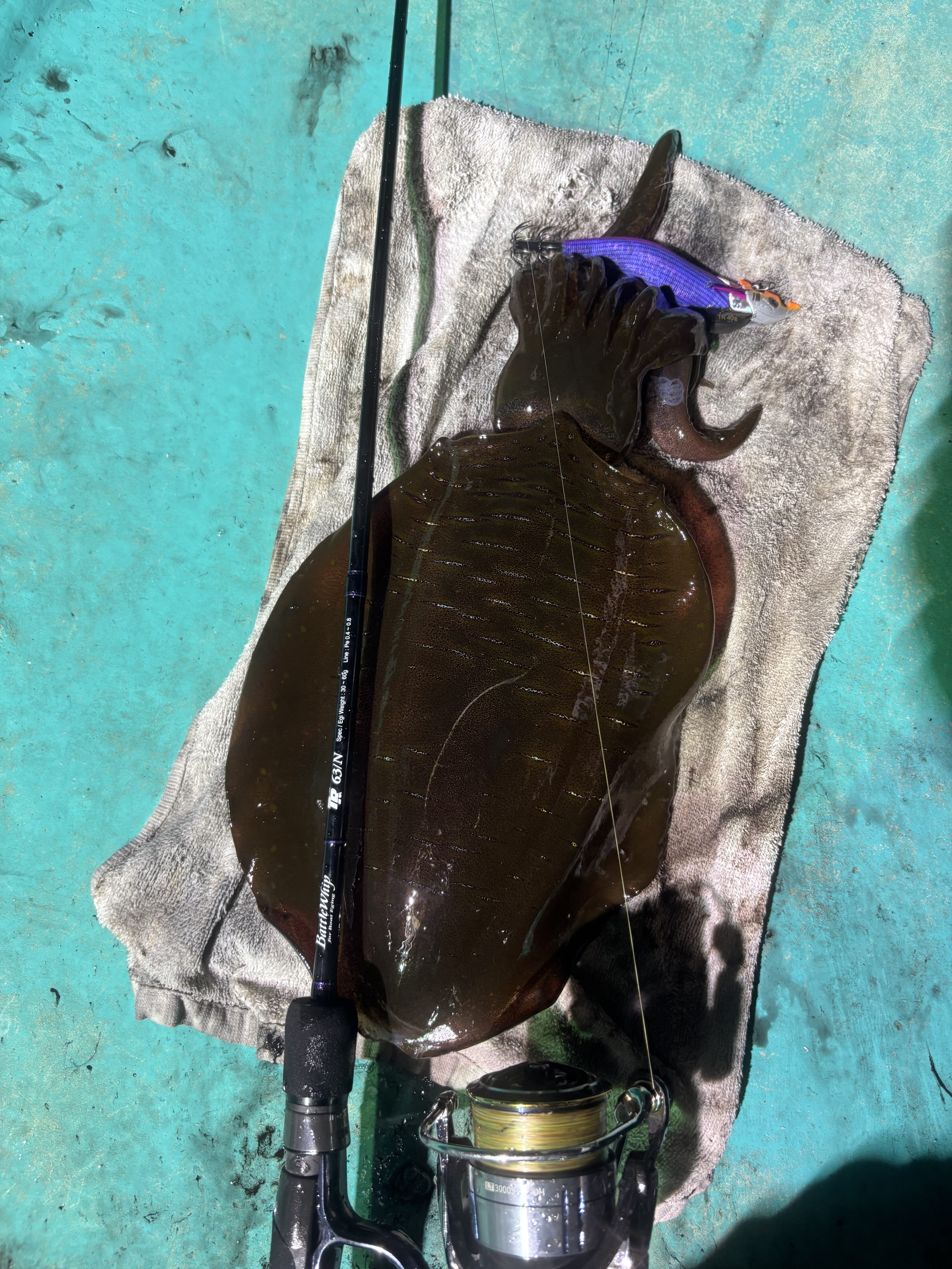 2025.10.06 印刷する さざなみ丸にてティップラン🦑 魚種 アオリイカ サイズ 800gまで 数 アオリイカ/22杯 釣り方 ☆ティップラン 場所 京都府 天候 曇り スタッフ 土橋潤也 店舗 大津店 釣行日 2025.10.04 コメント 大津店土橋です。 今日は京都久美浜にあるさざなみ丸さんにチャーターで乗りティップランに行ってまいりました。 風速が7〜8mありうねりもありなバッドコンディションではありましたが、開始早々後ろがヒット‼️ 続けて僕にもヒット❗️おNEWのロッドがグイーンっと曲がりドラグがジージー上がってきたのは800くらいのアオリイカ🦑行き道で500くらいが釣れたらいいなぁと言ってたので予想外のサイズで大盛り上がり! そのあとポツポツ釣れるも続かず、残り2時間の時にバーチカルからドテラ流しに変えて再スタート❗️両舷に人が乗っていたため僕の立ち位置は向かい潮になりましたが、ショアエギングの経験を活かしてキャストし、シャクリを入れてゆっくり巻きを入れるやり方でラッシュ💨 今日は爆風でやりにくいのもあり22杯止まりでしたが、800を筆頭に4.500のがよく釣れてくれたので、とても満足でした❗️ 使用した釣具 ロッド ヤマガブランクス バトルウィップTR 63N リール ダイワ 19セルテート2500