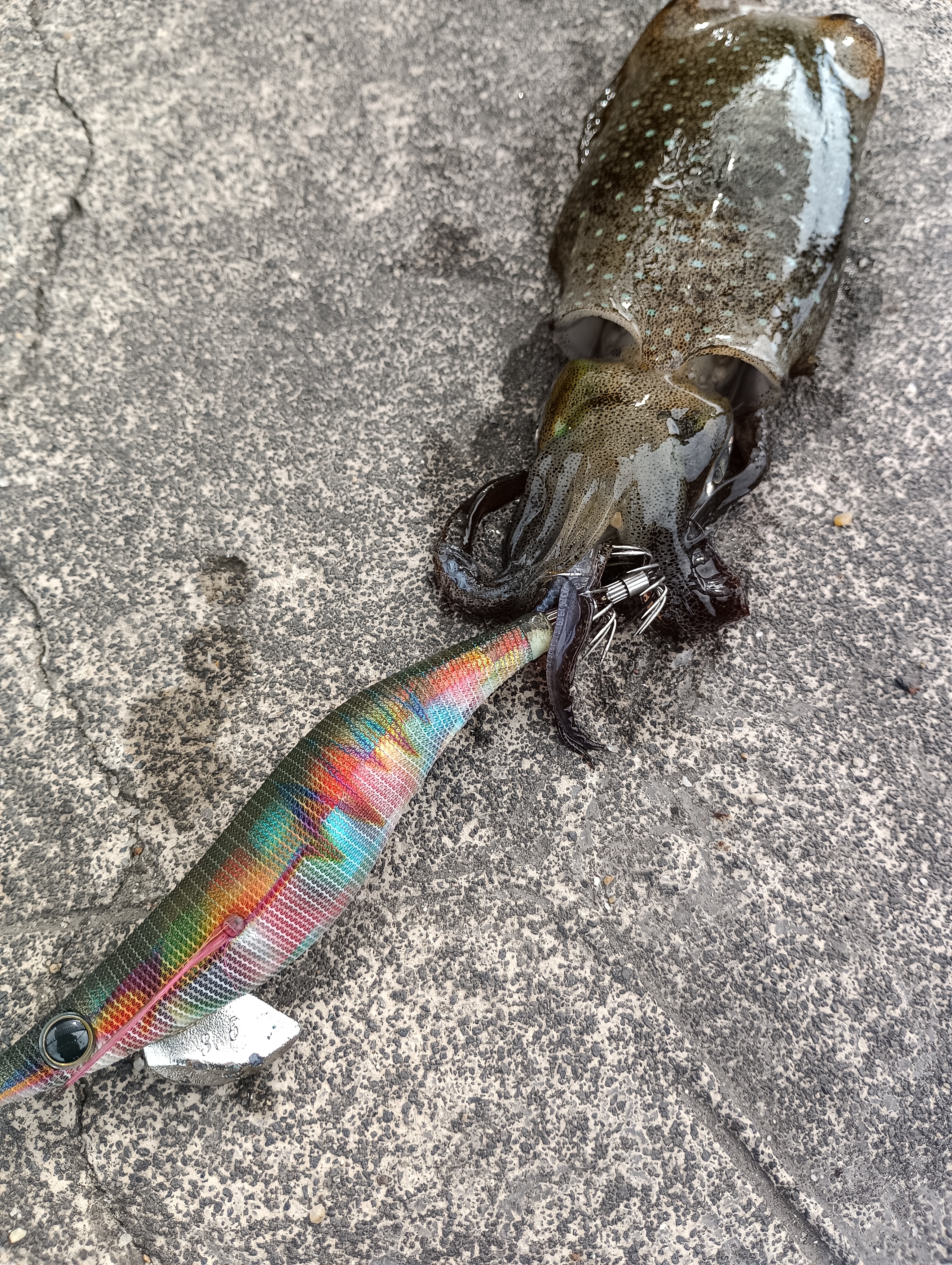 何やっても反応薄いので、あまり使っていなかったたまたま手持ちであったエギ王3.5号ライブサーチをチョイスし遠投し、探り歩いていると、やはり地形変化あるポイントでは、沖よりイカのチェイス確認でき、活性高い個体は3.5号サイズでもそのまま乗ってきて確保できましたが、3.5号で乗らないサイズは2.5号に落として乗せることで、ポツポツ釣れました。