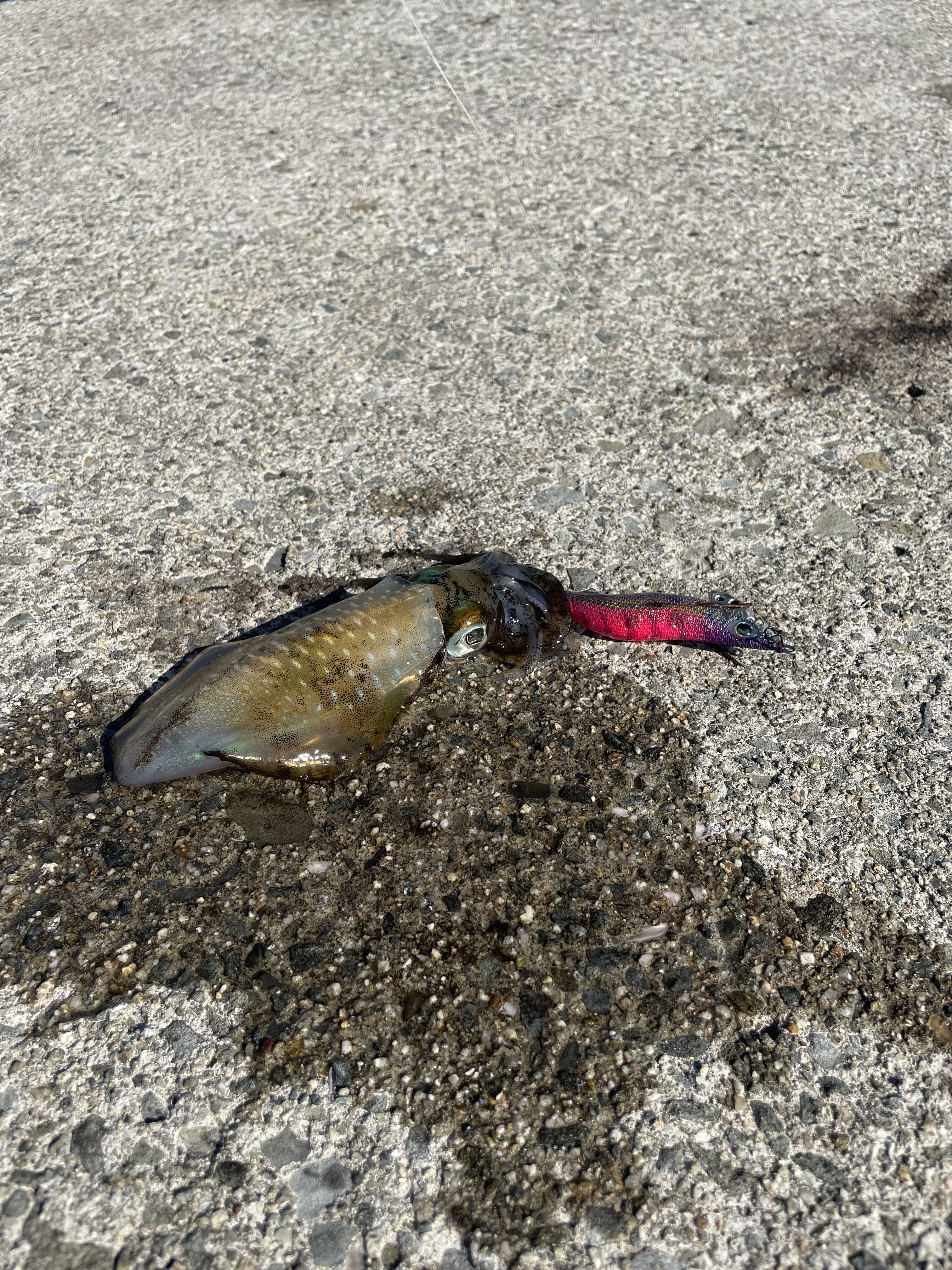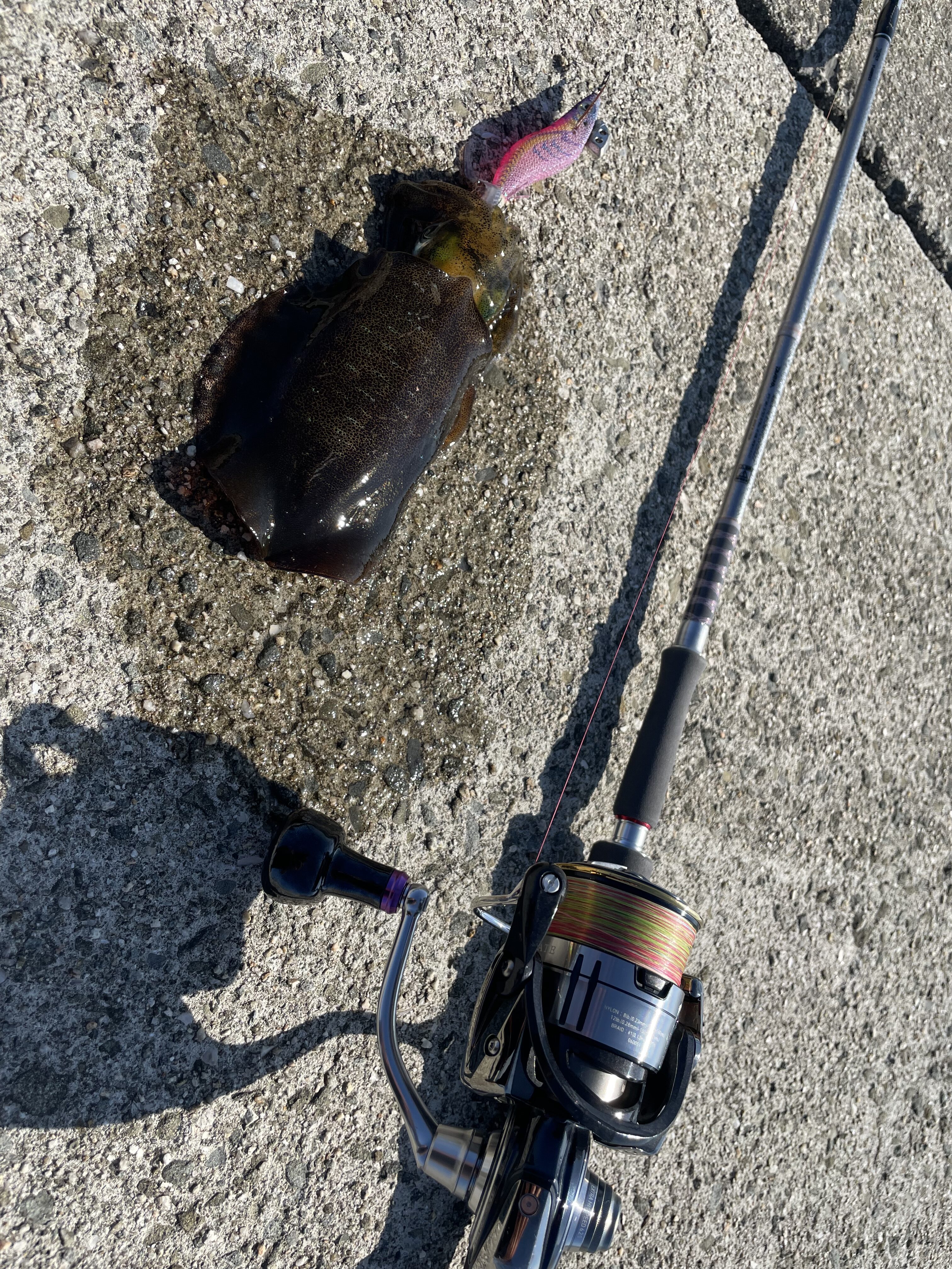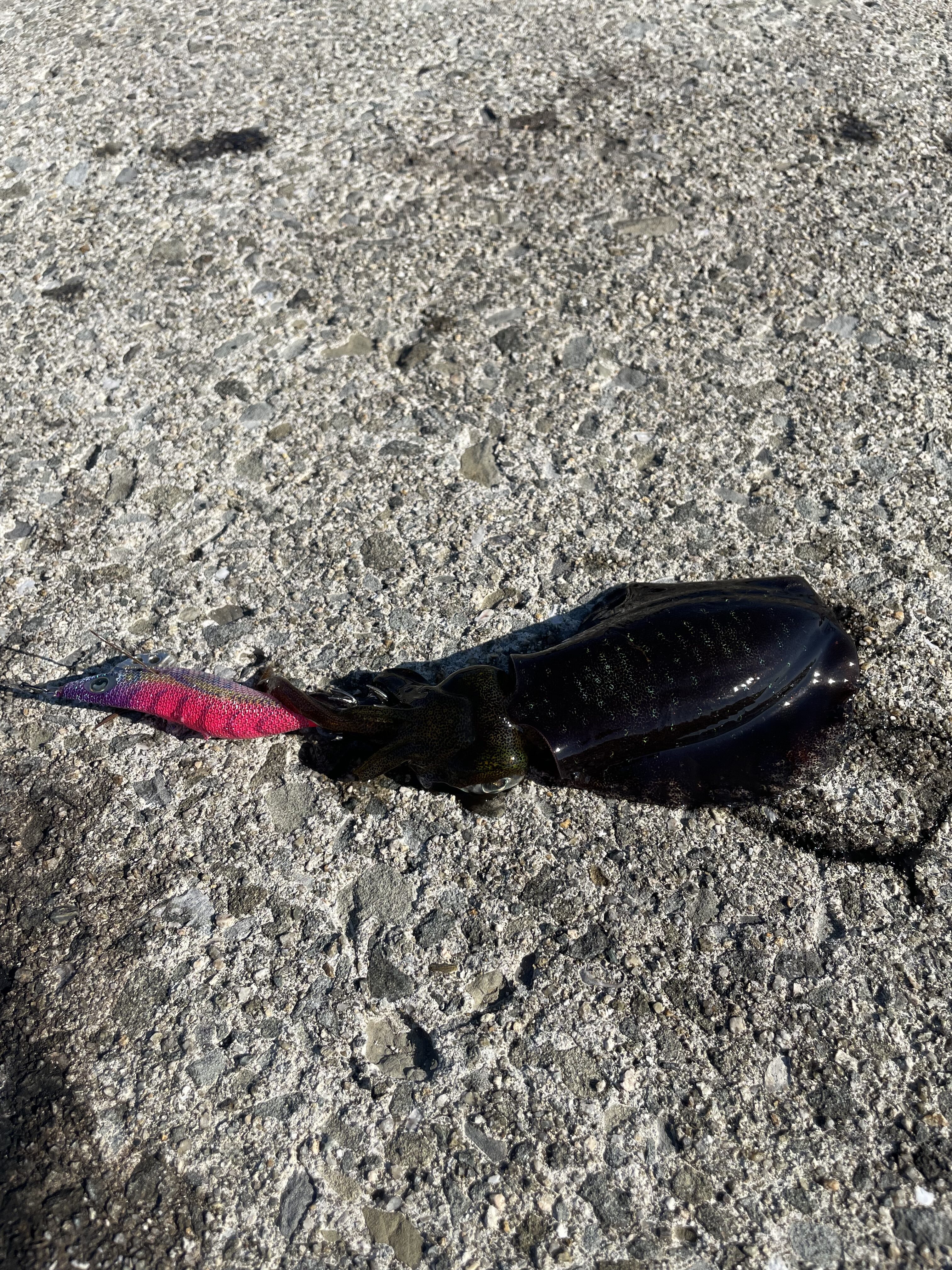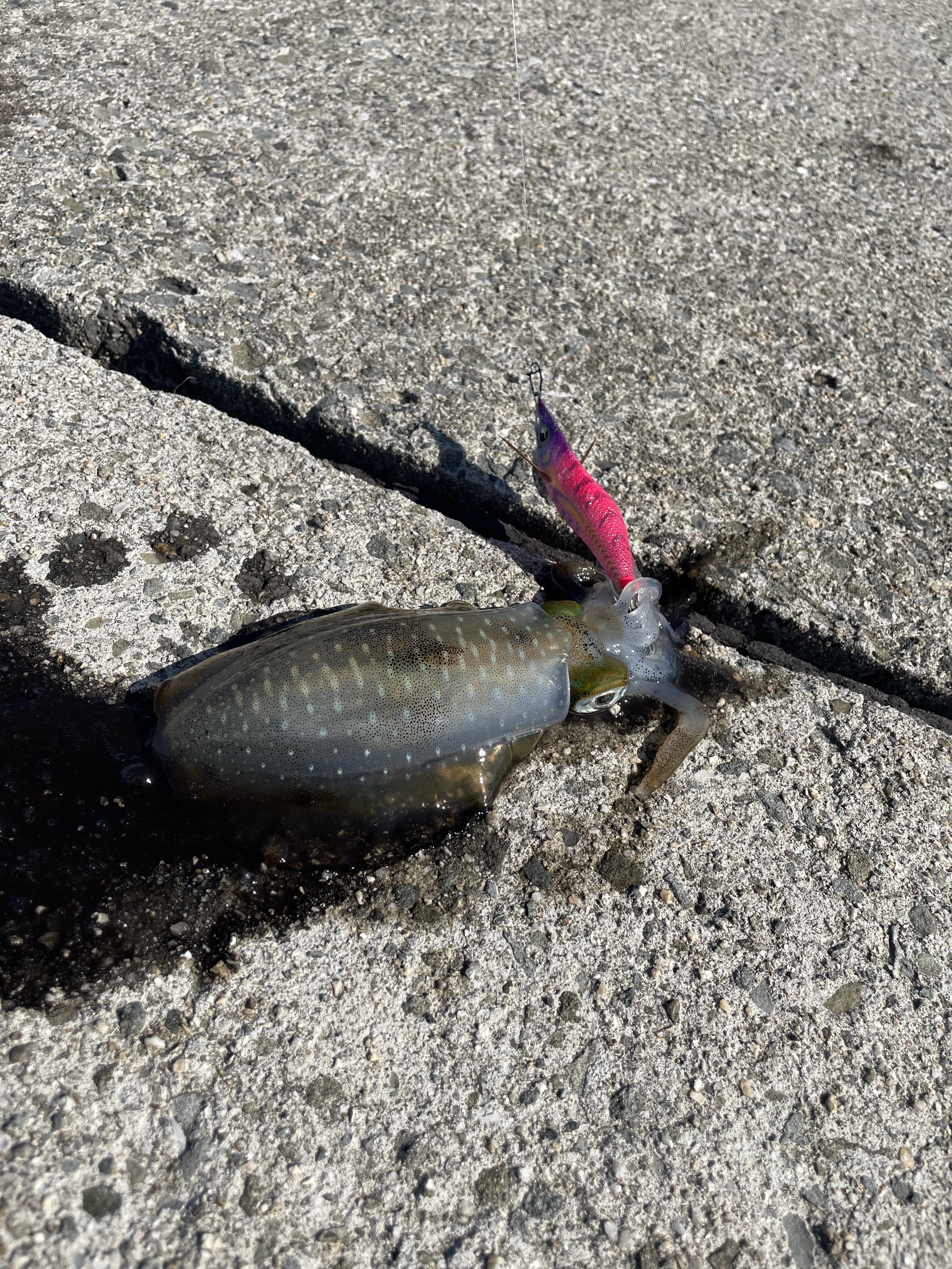 投げた飛距離の半分をタダ巻き、残りをしゃくりアピールの組み合わせで各レンジ探ぐりました。すると、中層から誘ってピックアップ時、足元のテトラ際で黒い影🦑がスーッと寄ってくるのを発見👀再度キャストして足元で丸見えバイト‼️💥なんとか1杯目キャッチです💪