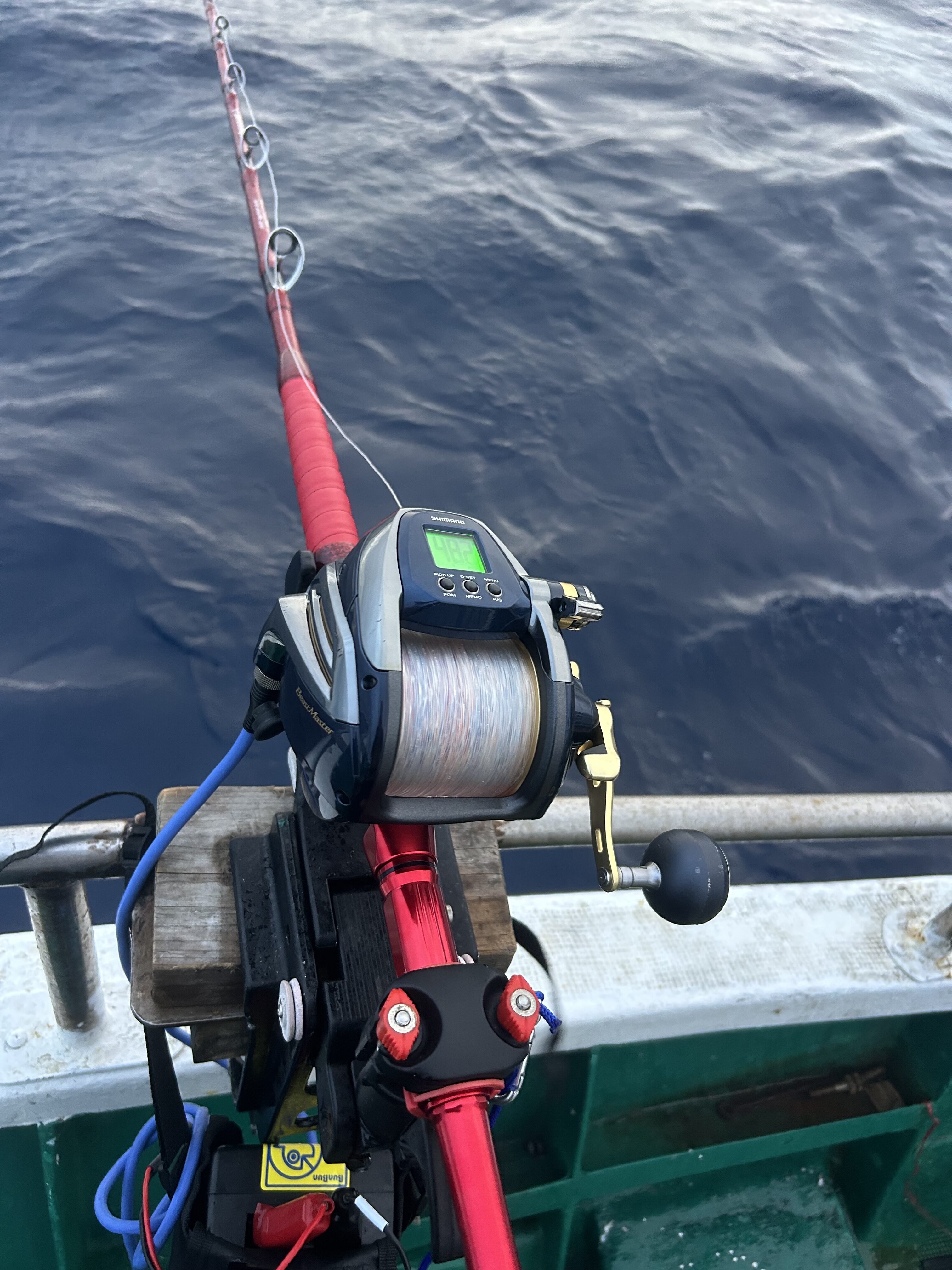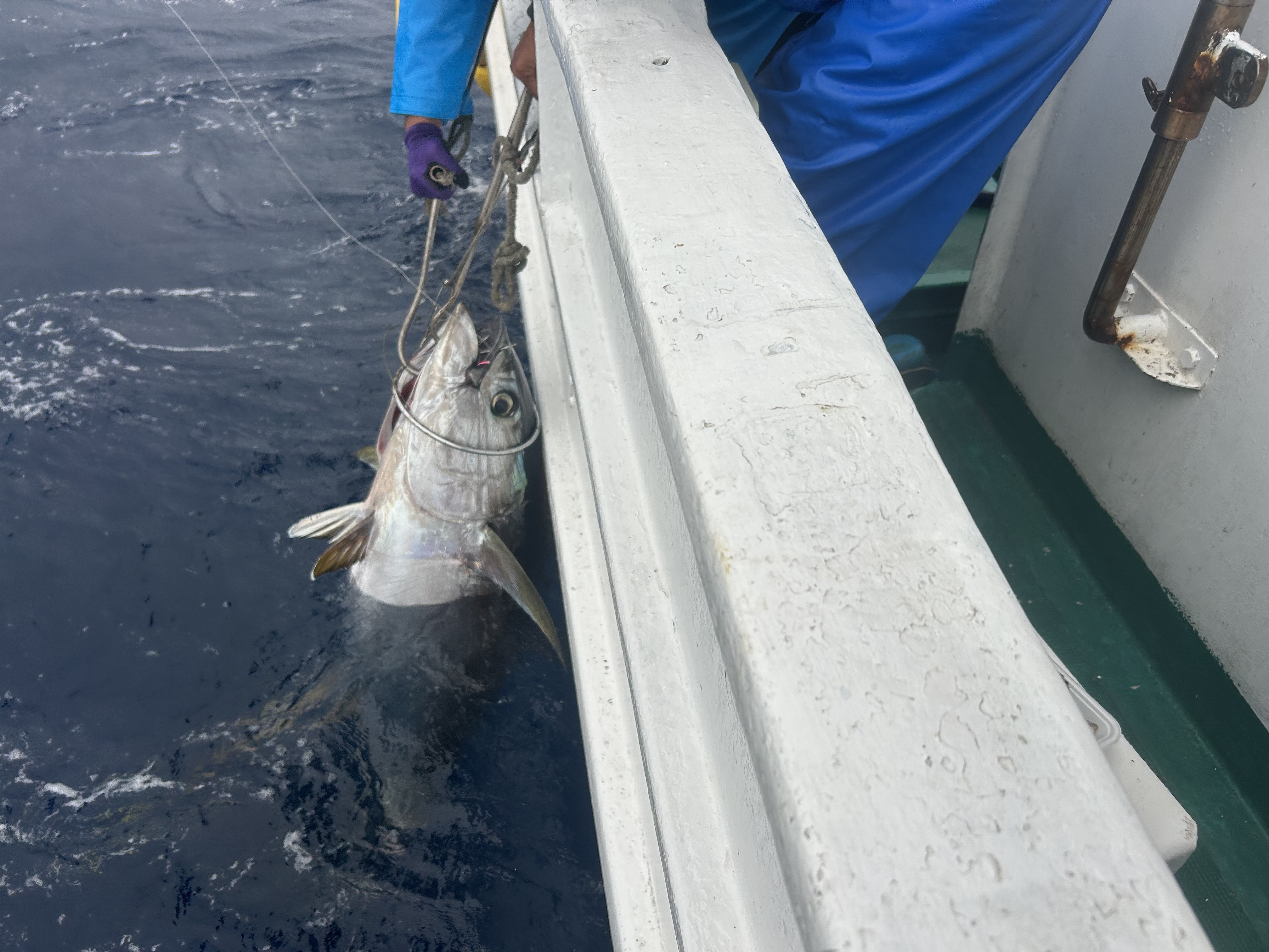 途中糸が走る当たりがありましたが、これはシイラでした。そんな中、同船していたお客様に何やら大物がヒット!97mでヒットし、160mまで走られたようで、ここから慎重にやり取りがはじまします。