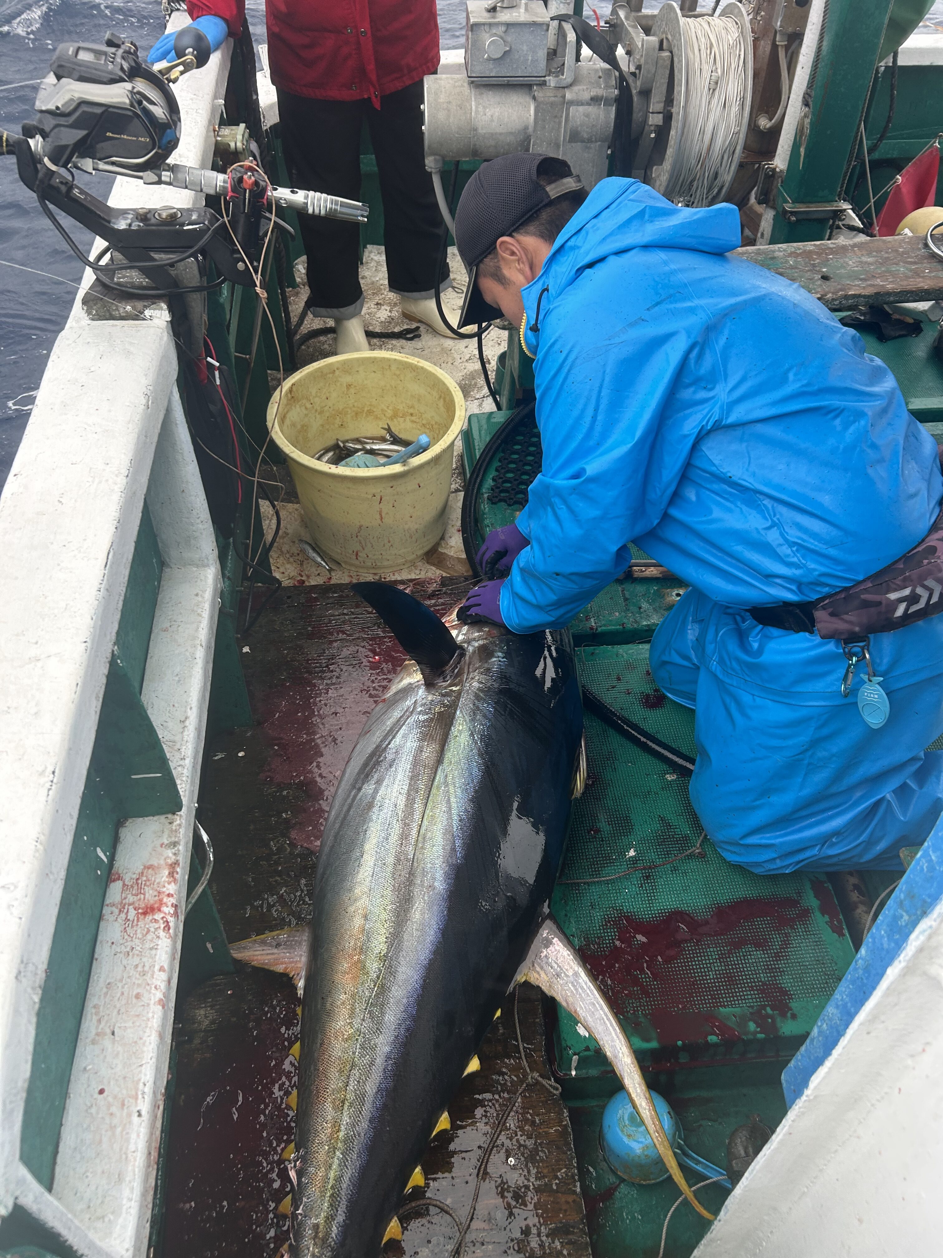 2025.10.13 印刷する キハダマグロふかせ 魚種 キハダマグロ 釣り方 ☆その他海釣り 場所 和歌山県 天候 雨 スタッフ 森下章広 店舗 関西 本社 釣行日 2025.10.12 コメント 今日はキハダマグロのふかせ釣りにチャレンジです。 見よう見まねで道具を揃え、時期がくれば定期的に通いたいと思っています。 今日は生憎の空模様で、釣りの最中に雨が降る予報です。 早速道具を用意し開始です。 まずはイワシを撒き、それに同調させるように仕掛けを流していきます。 途中糸が走る当たりがありましたが、これはシイラでした。そんな中、同船していたお客様に何やら大物がヒット!97mでヒットし、160mまで走られたようで、ここから慎重にやり取りがはじまします。 苦労の末に上がってきたのは、でっぷり太ったキハダマグロで本命です。 途中急に軽くなったということでしたが、あがった魚は尻尾がサメに喰われていて、途中で尻尾が無くなったので、急に軽くなったとのこと。 一緒に行っていた高井田店奥代店長が取り込みから絞め、えら、内臓の取り除きを全てやってあげ、手慣れた様子にお客様も大変感謝されていました。本当に頼もしい限りです。 結局この日はこの1本に終わりましたが、また機会を見てフカセにチャレンジしたいとおもいます。 使用した釣具 竿 バトルシップ 200ー400 2m リール シマノ ビーストマスター6000