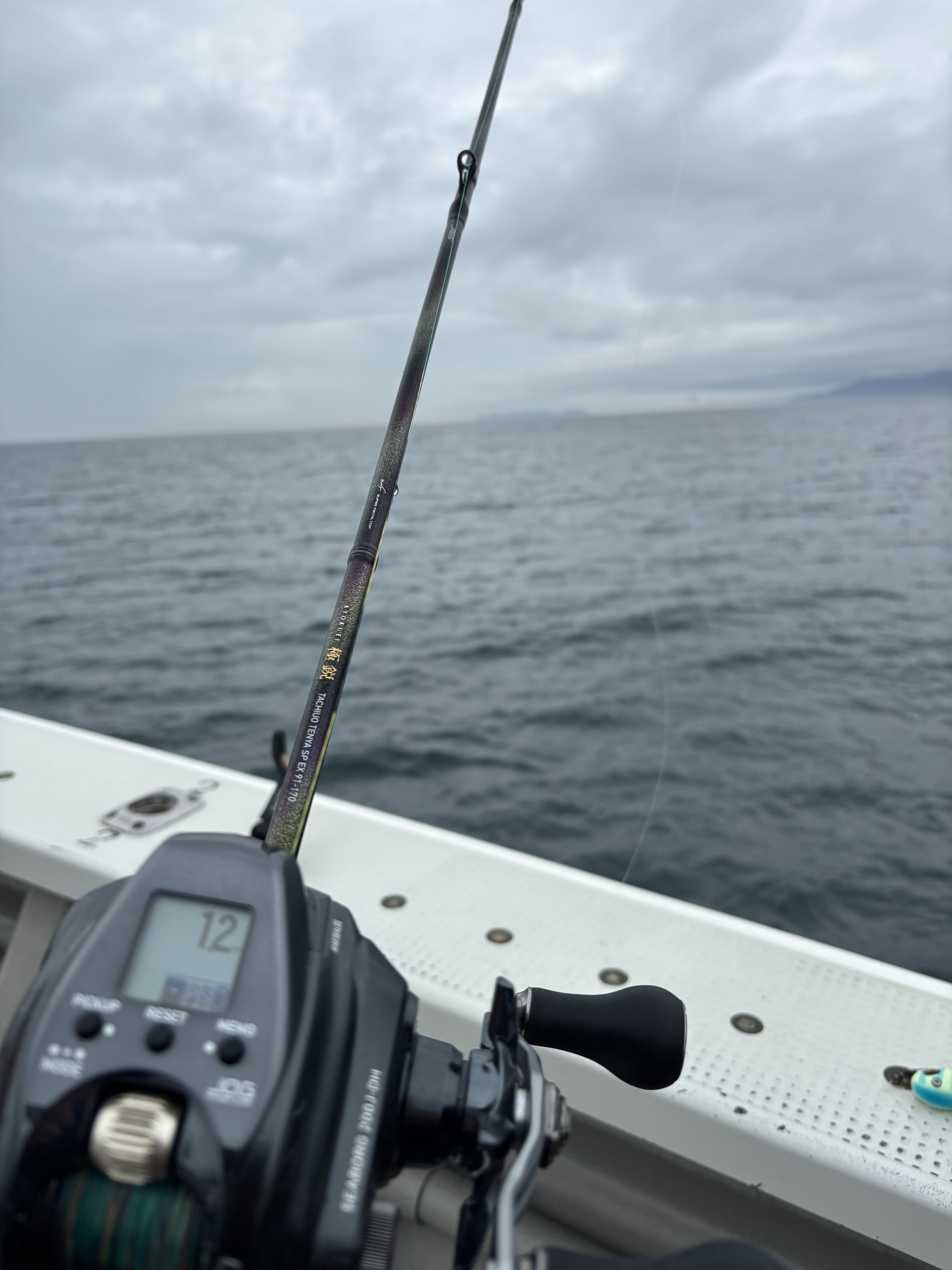 開始2投目で何とか1匹目をキャッチしましたが、魚探の反応は少なく、仕掛けが3m以上上下してアタリも取りづらい厳しい展開。当たっても追いがなく、即掛けを狙うもバラシが多発。船酔いでダウンする方も出る中、2時間ほど修行の時間が続きました。