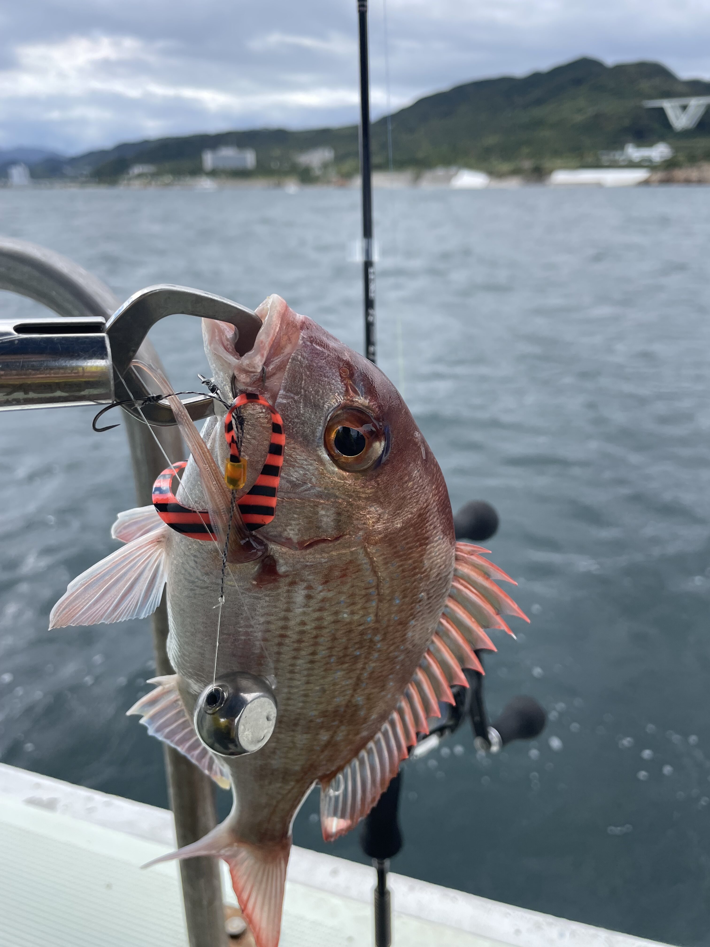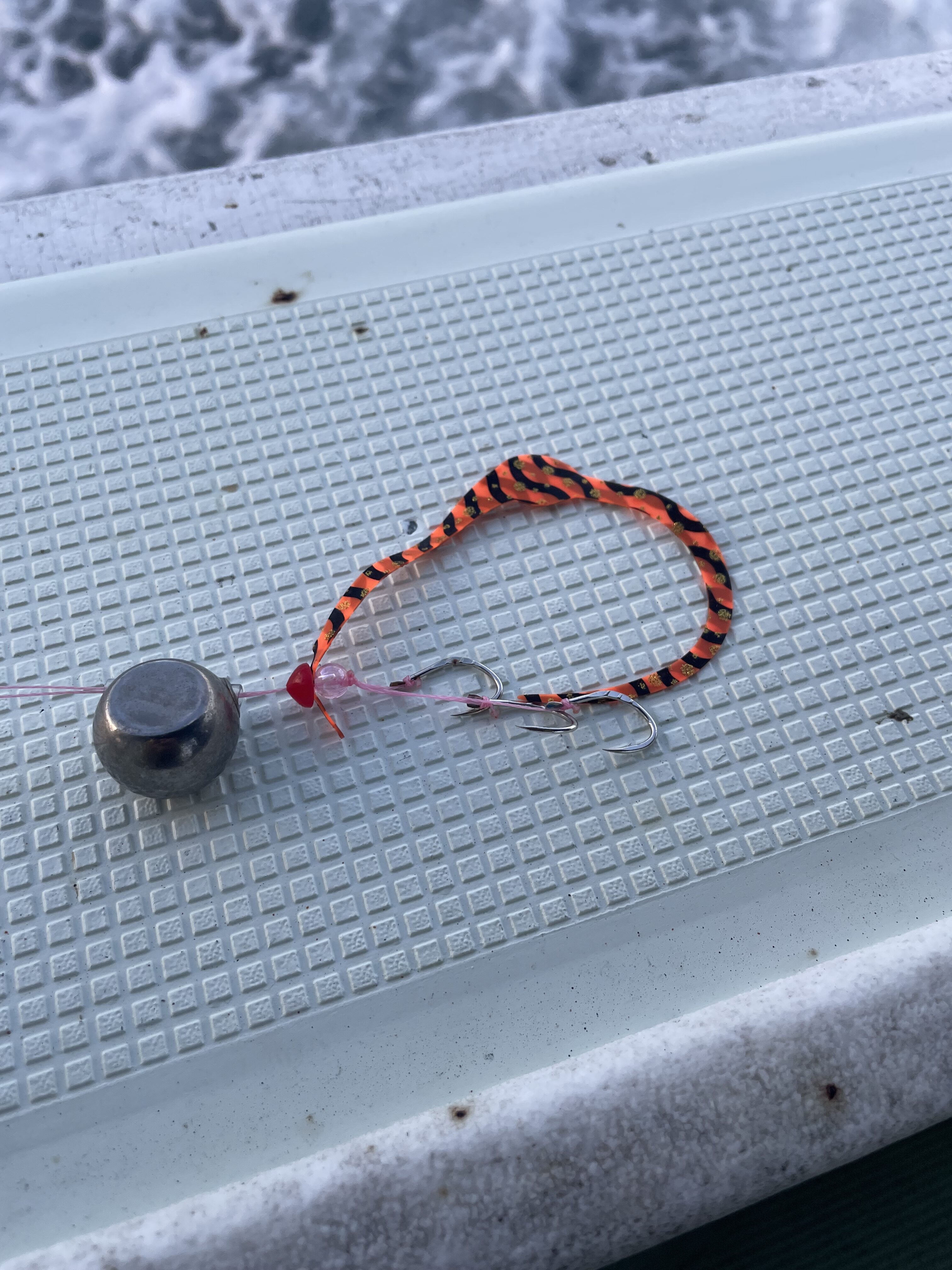 朝一、港を出てすぐのポイントで流し始めます。潮はそこまで早くないとのことだったので、前回好調だったササラボ様のシングルコブラカーリーのオレンジゼブラから‼️🐍