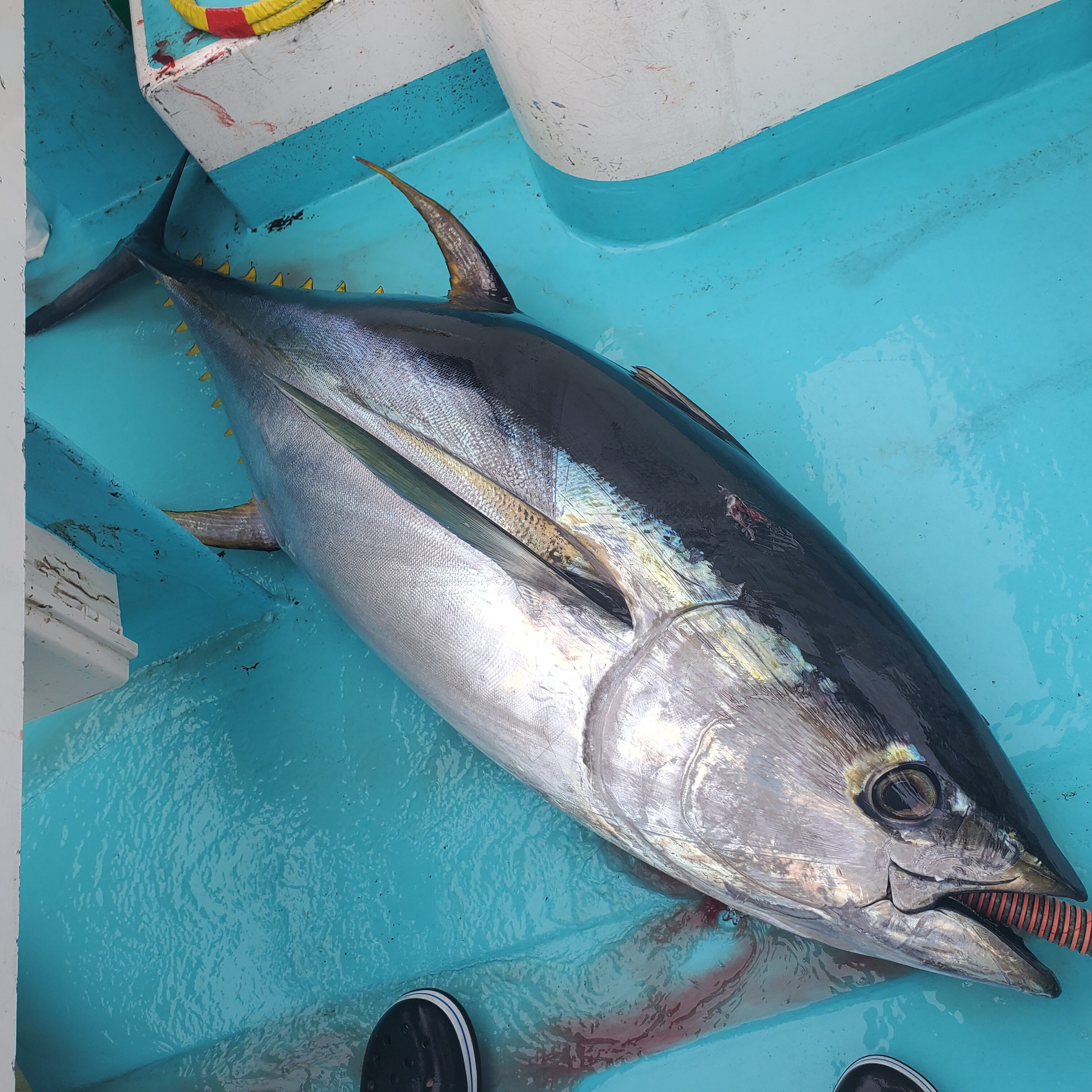 鮪も疲れたのかテンションを少しずつ強めると、徐々に上がり始め船長に手繰ってもらい無事にGET🐟️