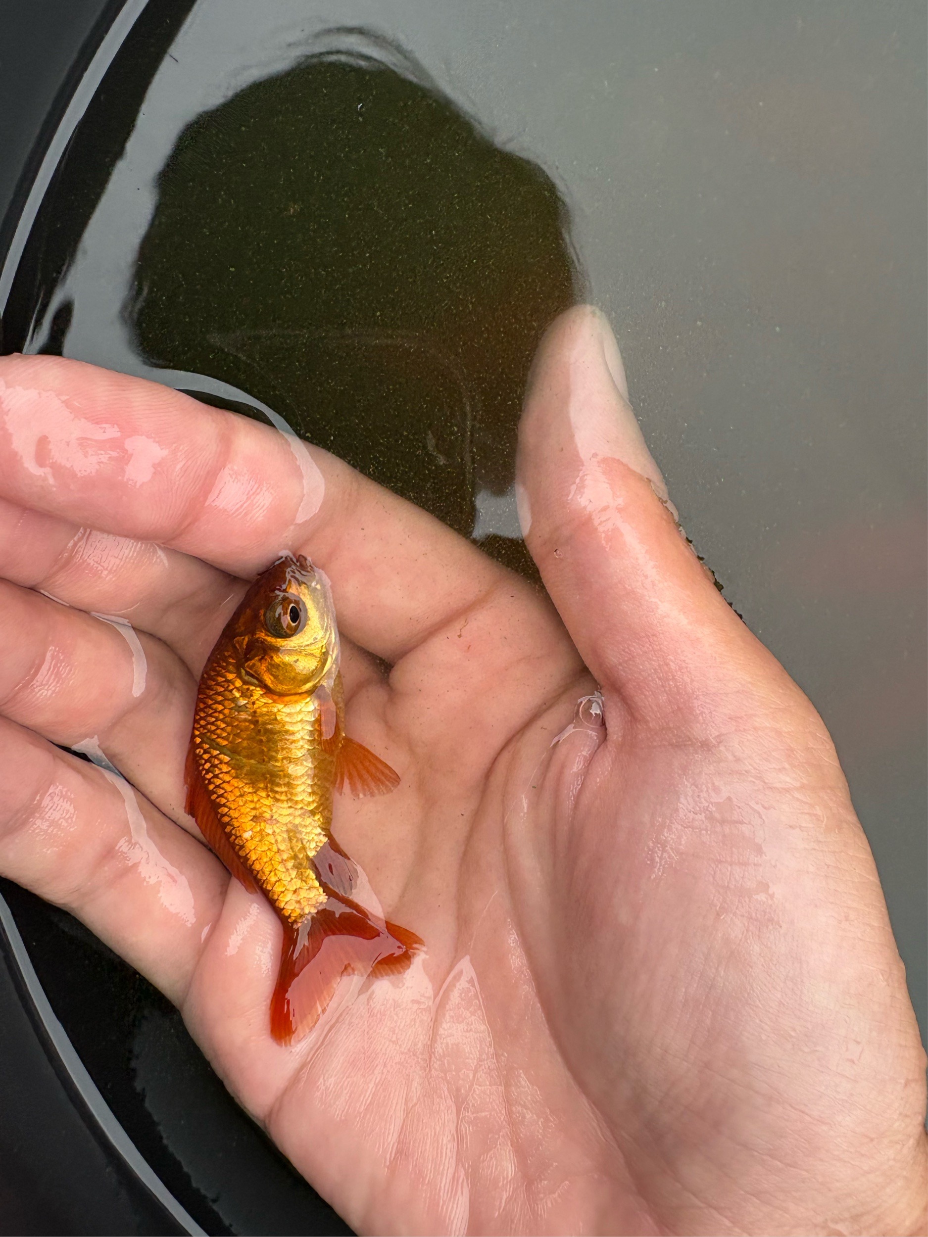 寿々木園さんの金魚池にはいろいろな種類の金魚が入っています。 フナっぽい魚も釣れました。