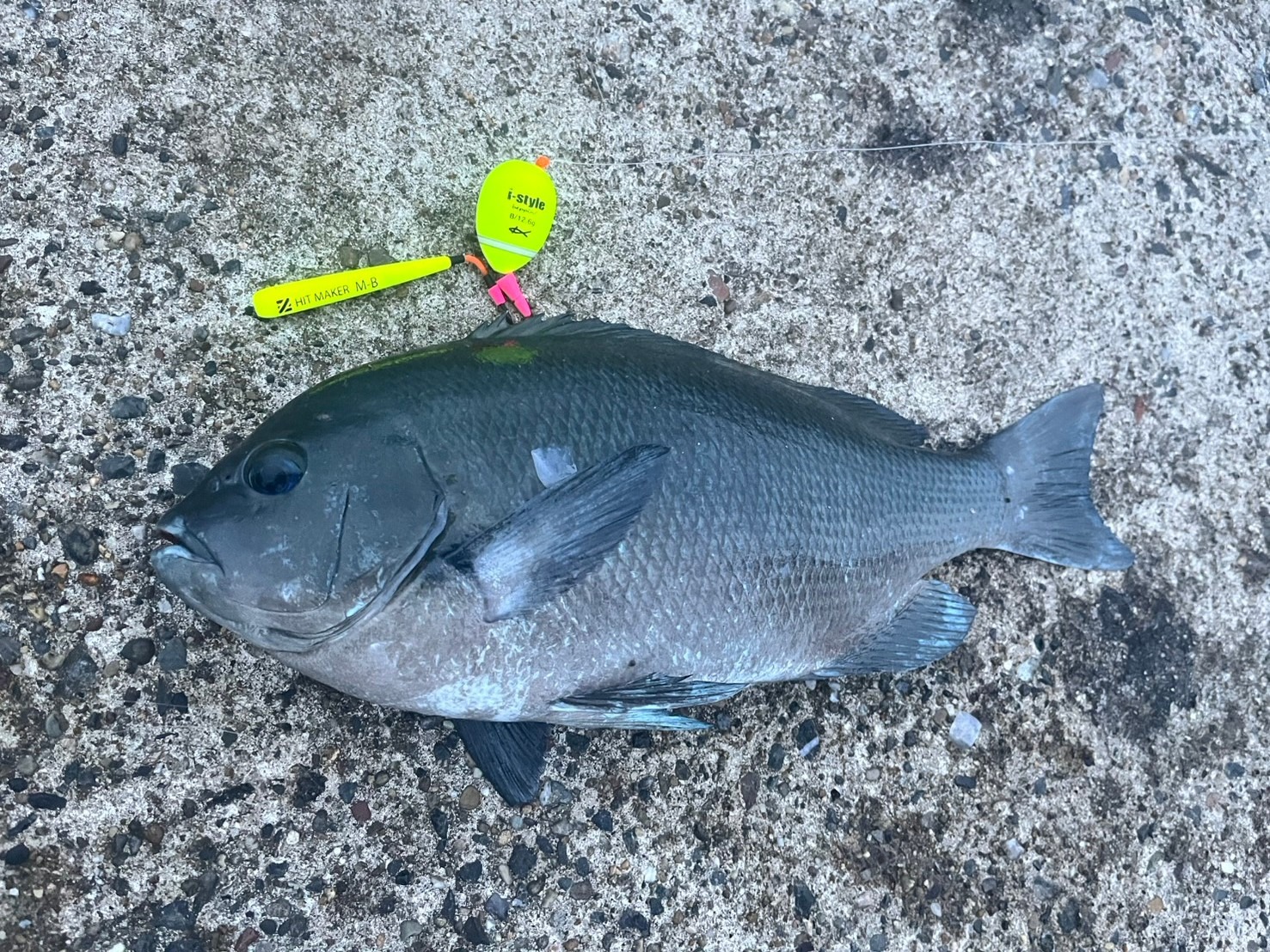 わいている中心に流していると、ウキがスッと沈み、見事40cmの良型メジナを釣り上げました!