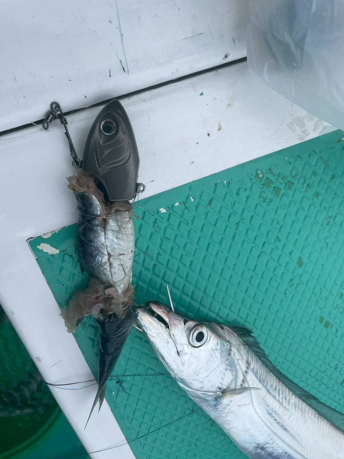 9時過ぎ、竿をしゃくって誘うと、ひったくっていくアタリ!合わせると、過去一重い!電動をゆっくり入れ無理はしないように上げると、水面に出て超デカいタチウオ!が見えた瞬間にリーダーから切れてしまい、テンヤと一緒に海へ。。。もったいなかった。。