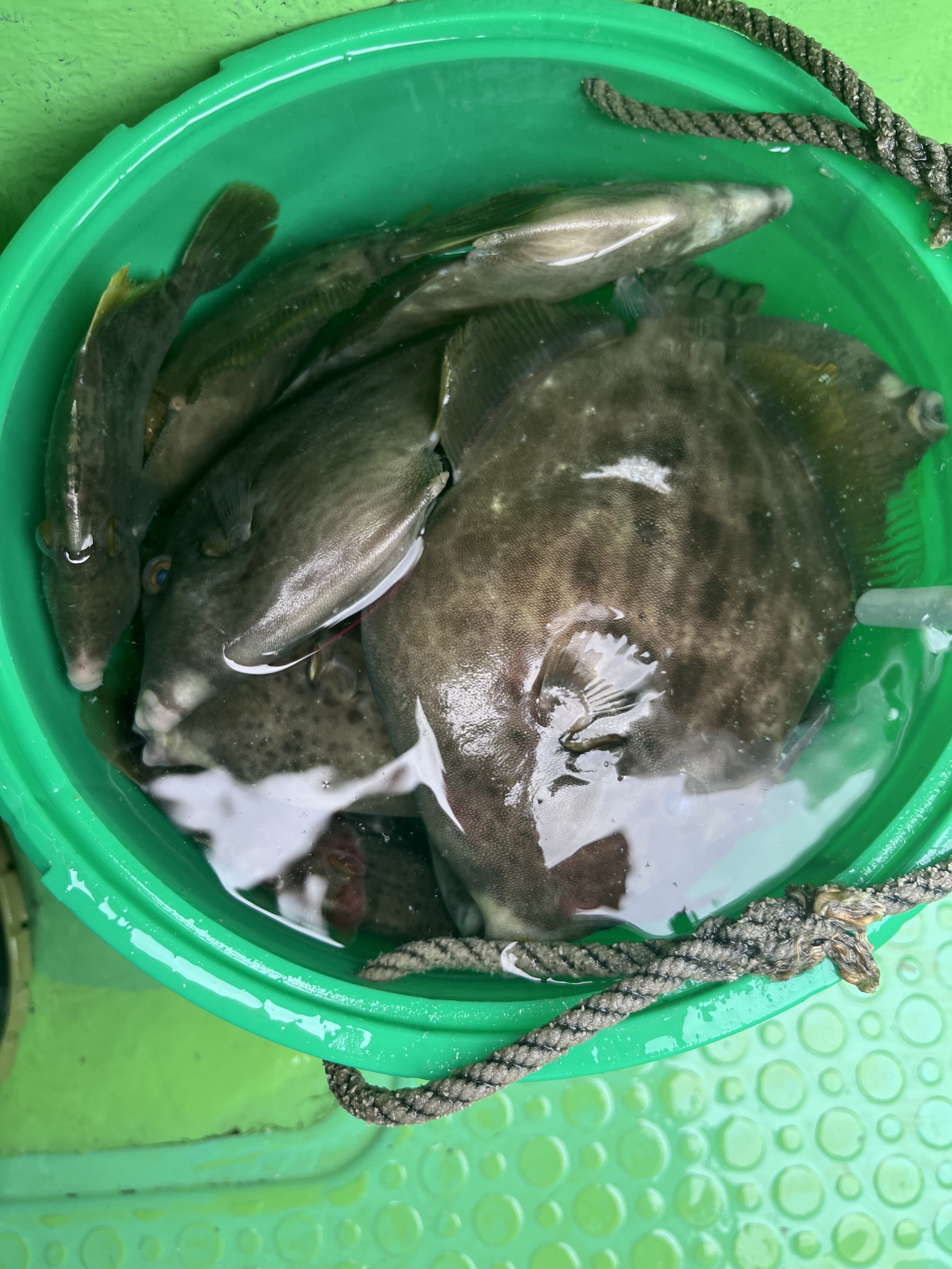 ポイントに到着しいよいよスタート✨最初はバタバタっと回りが釣れ出し少し出遅れて私にも待望の本命カワハギのアタリが…とりあえず坊主回避の1匹目🤣