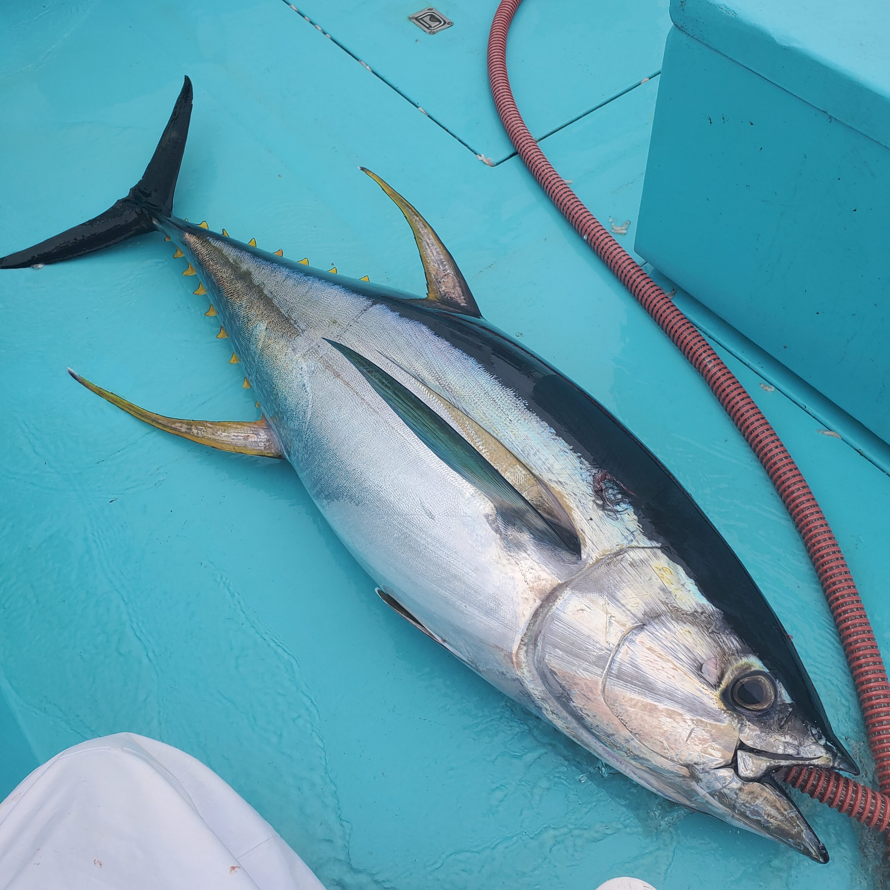 少しずつ船下に入るようになってきたタイミングで、トモ側でキハダがポツポツと二本上がり、次は自分でした🎵