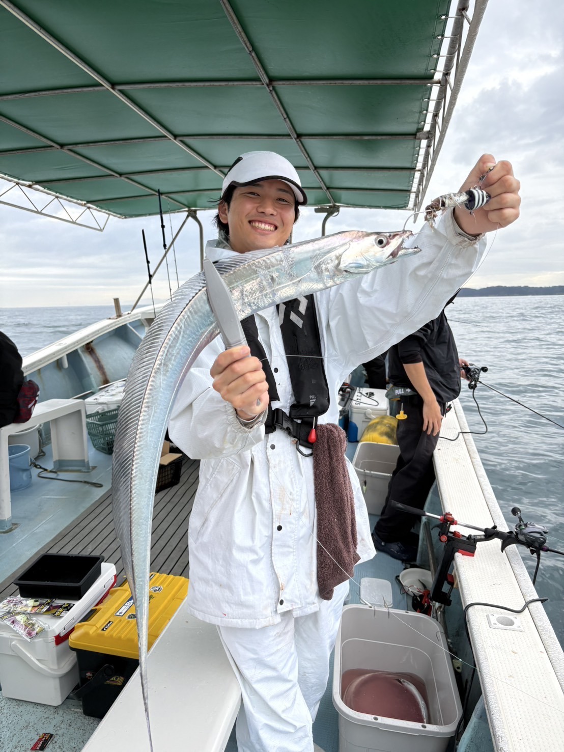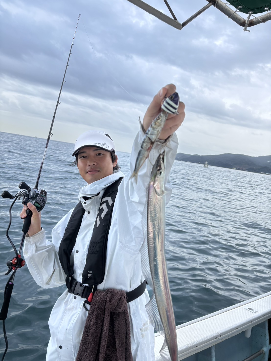 2025.10.22 印刷する 高田釣行便 大阪湾船タチウオテンヤ研修 魚種 タチウオ/太刀魚 サイズ 最大F5 数 タチウオ20~30尾 釣り方 ☆船タチウオテンヤ 場所 大阪府 天候 雨 スタッフ 高田航綺 店舗 名古屋小牧店 釣行日 2025.10.16 コメント 名古屋小牧店スタッフの高田です! 今回は、新卒社員研修の一環として、大阪湾船タチウオテンヤ研修に参加して来ました! 乗船した船は、泉南の岡田浦漁港から出船する『 湊丸』様! 5時半に乗船し、座学を済ませて6時に出船! 洲本沖のポイントへと船を走らせ、7時頃には釣りスタート! 朝イチは2日前から好調との前情報どおり、船中至る所で電動リールのモーター音が🔥 例に漏れず、自分にもアタるアタる✨️ アタリを積極的に合わせていくと、、、 細いけど、タチウオゲット🌟 その後も釣りまくっていると、、 竿が一段と引き込まれ、、、!? オッケー来たよ!! F5!!!! 最高ですね👍 その後、中盤以降は、急に反応渋く、、 アタリが出る人出ない人に分かれだし、、(僕アタらない方😢) 後半に悔しい思いをしながら終了でした……… それでも終わってみれば、20尾以上は釣っただろうと思える出来👍 大成功な部類なんじゃないでしょうか! 名古屋小牧店では、伊勢湾や遠州灘向けの船タチウオテンヤ用品取り揃えております👍 大阪湾との違いは、ズバリ!テンヤの重さ! 大阪湾では40号なテンヤが、伊勢湾や遠州灘では、60号や80号を使用します! それにより、タックルのパワー等1部変わってくるところもございます💦 その辺りの違いも含めて説明しながら最適なタックル相談等致しますので、ご釣行の際は是非、つり具のブンブン名古屋小牧店までお越しくださいませ🍀 使用した釣具 ロッド 25サーベルマスターSSテンヤ82MH180 リール 24フォースマスター601DH