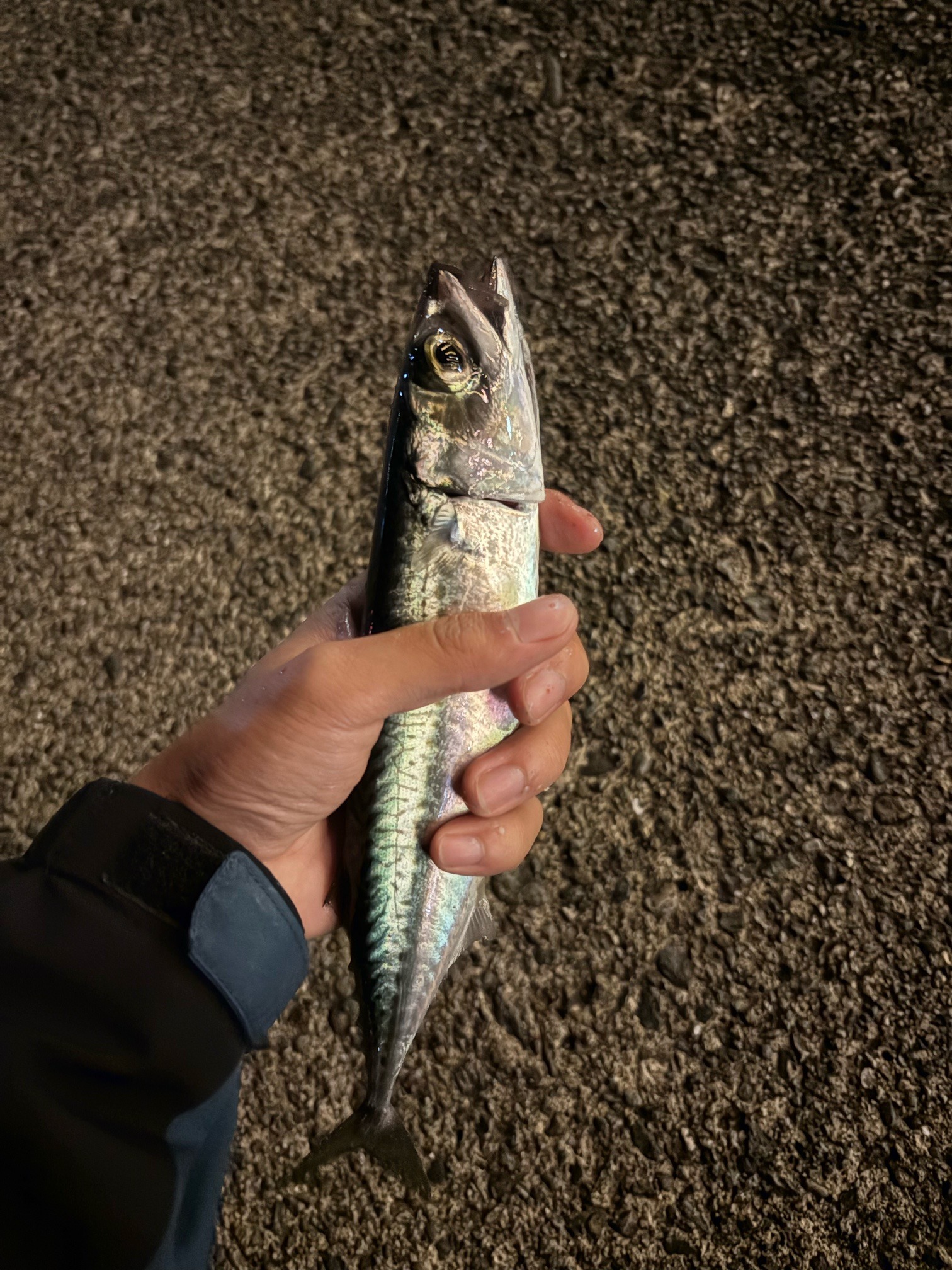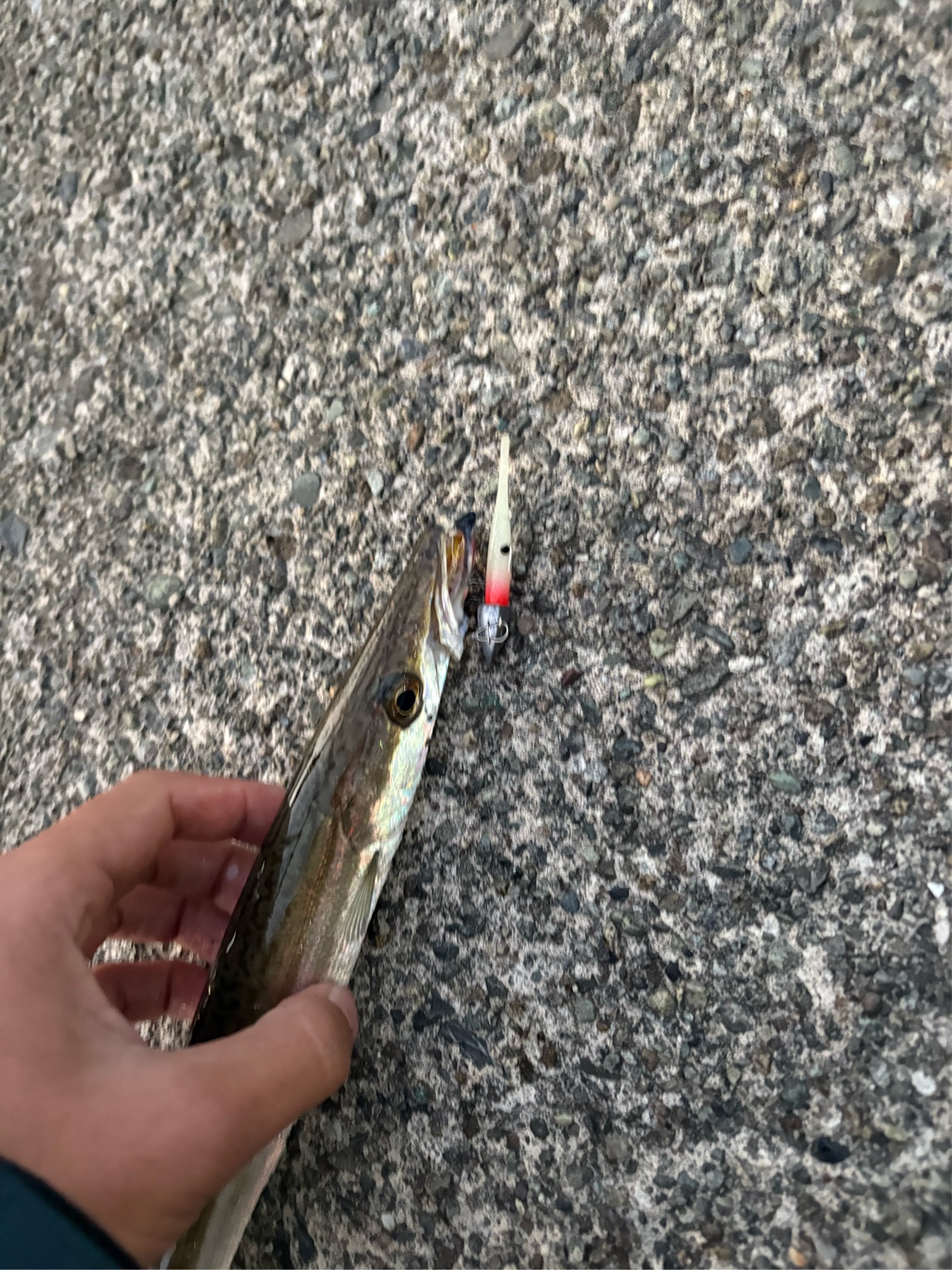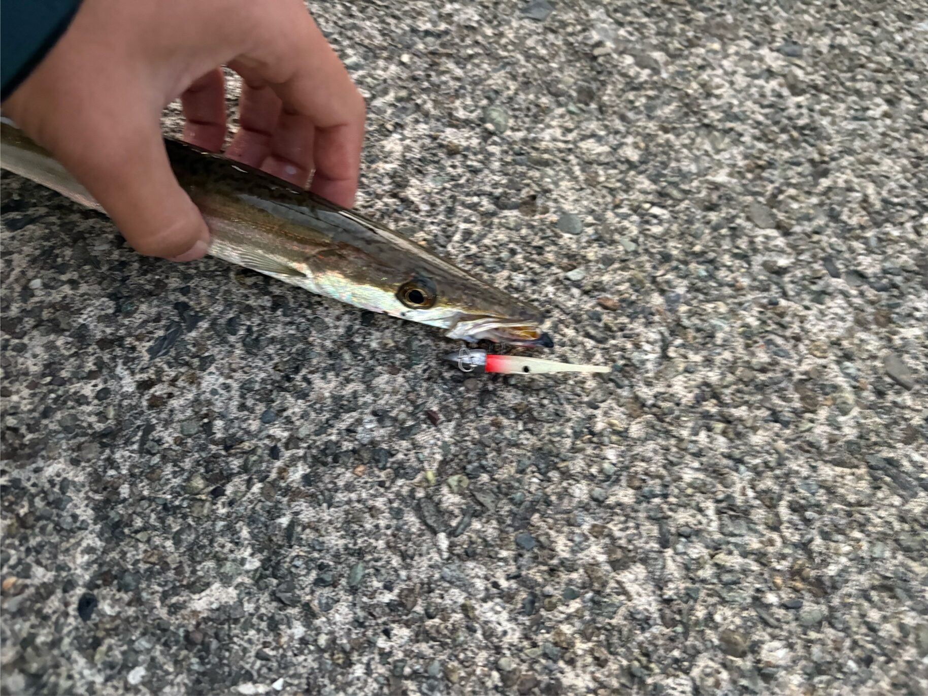 慣らしで足元に沈めダートさせていると1投目からいきなり水面バイト、すぐにちょい投げしてダートで誘うとヤマトカマスが釣れました。