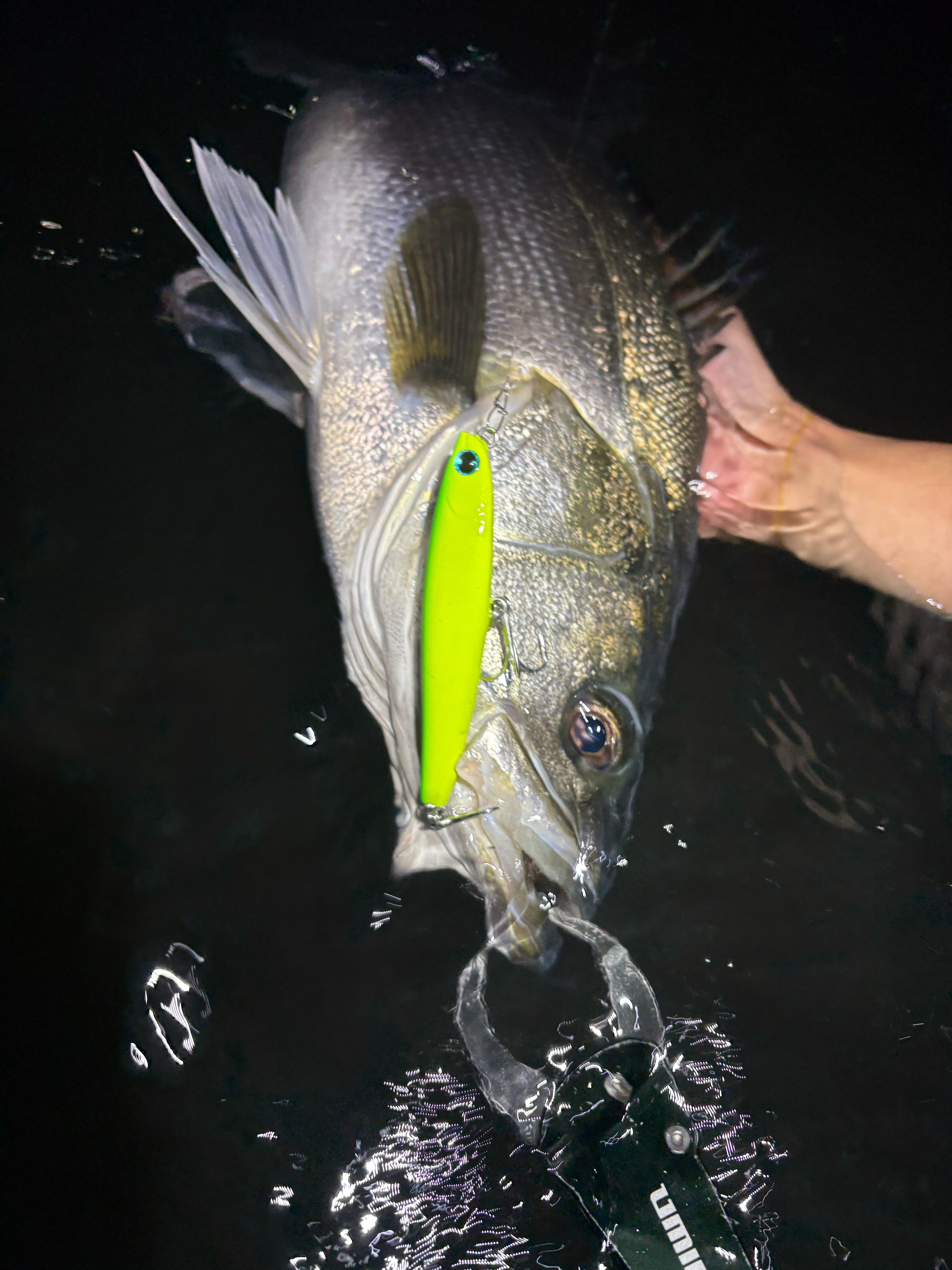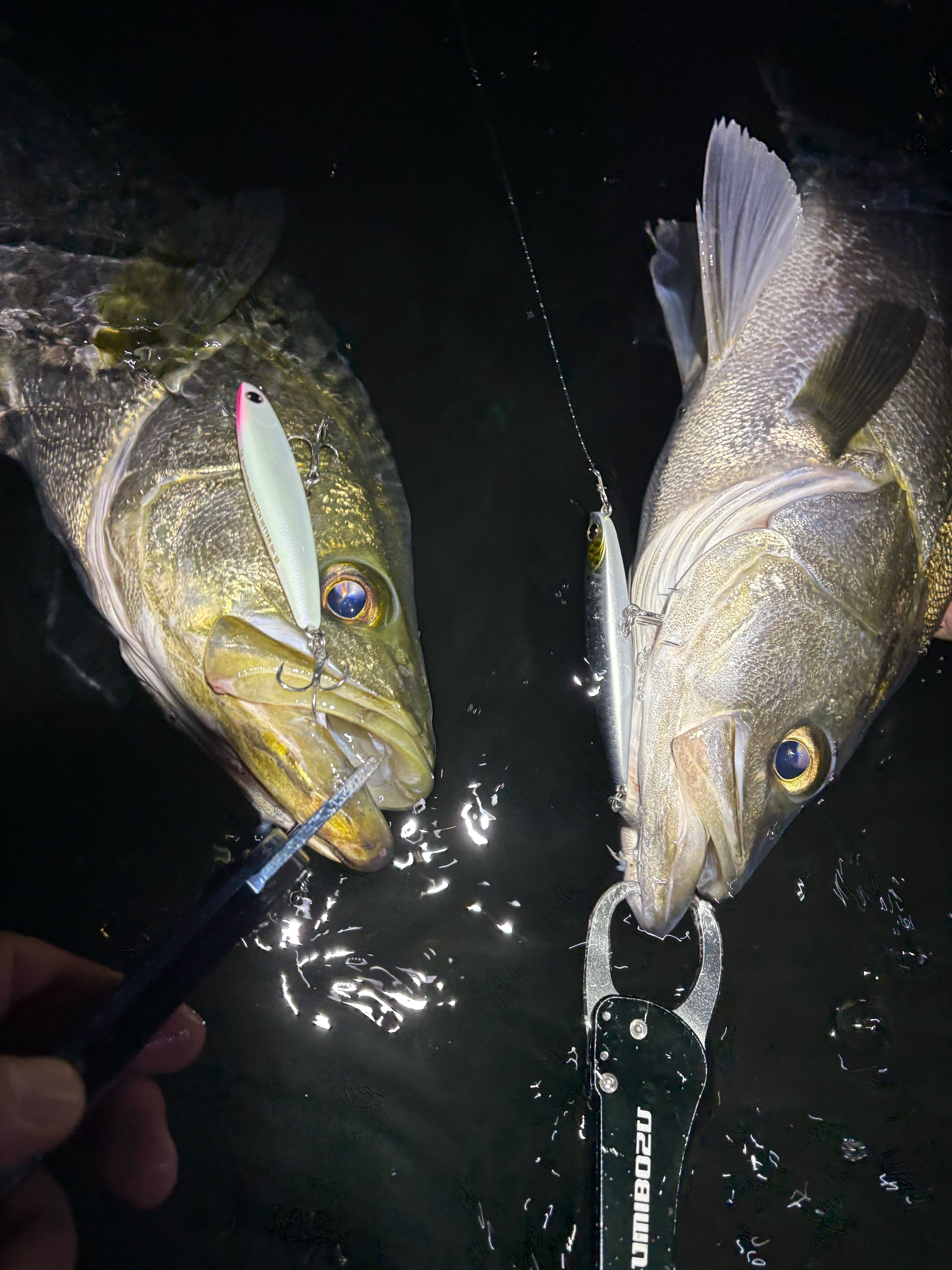 いつもの遠投して巻くだけでは反応が無く、コノシロにぶつけながら短いリフト&フォールをしていると⋯ガッッチンバイト!!同行者とWヒットです‼️