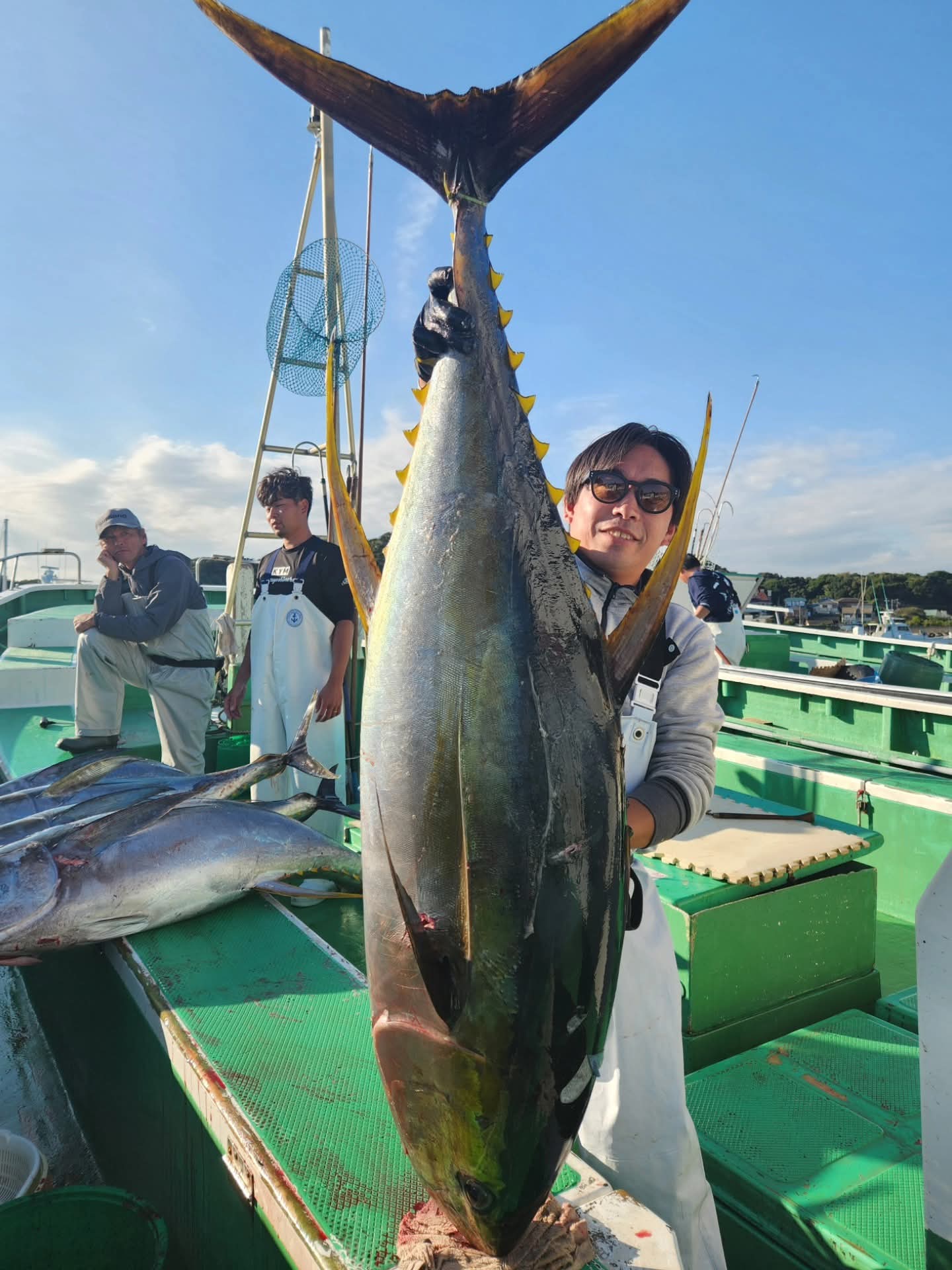 チョイ走り数回。その後は落ち着いてきたので、仕掛けの強度を信じてグイグイ巻いて、船長の神手繰り&ギャフでチョイヒレ長めの46キロGET🐟️