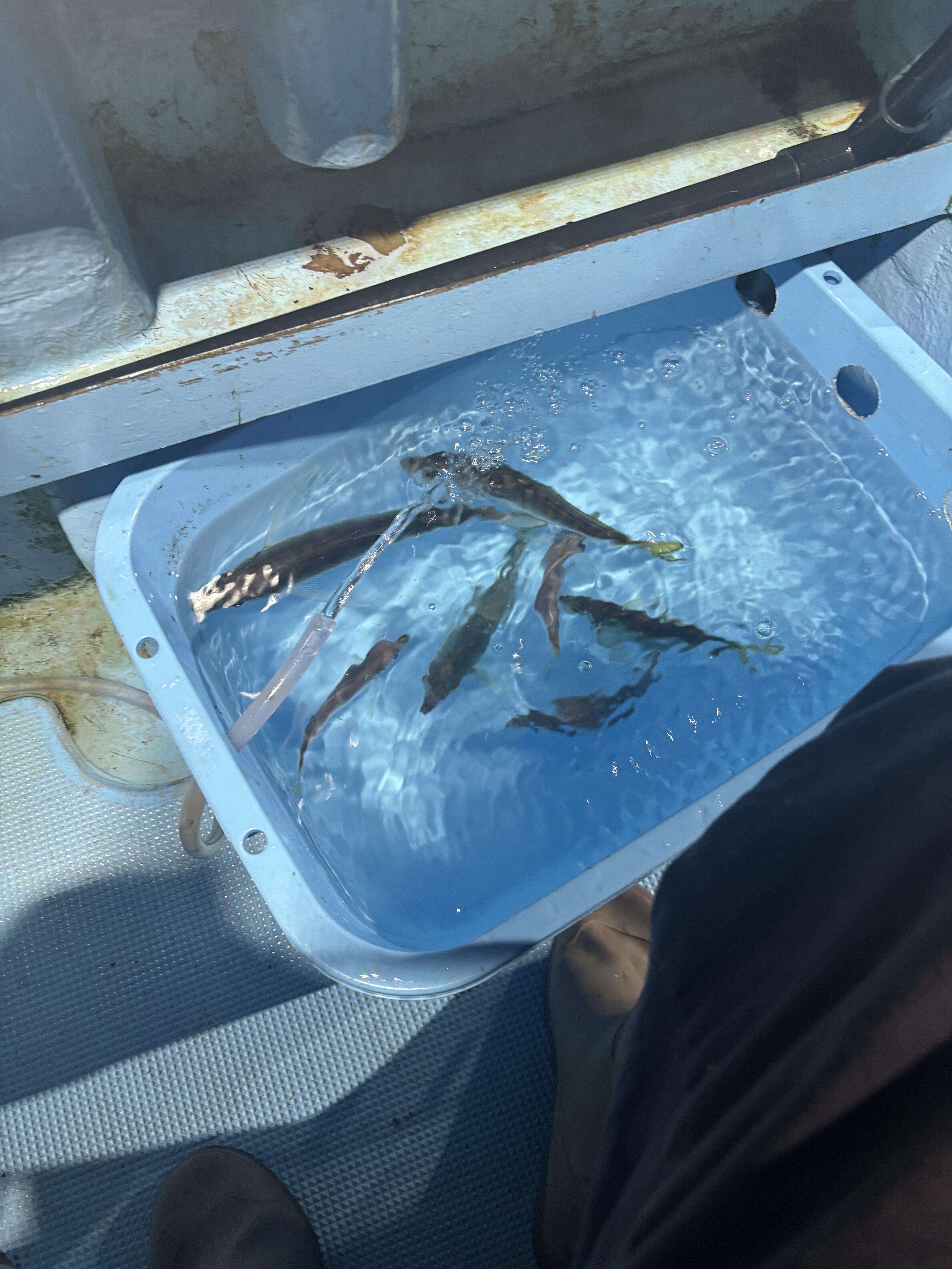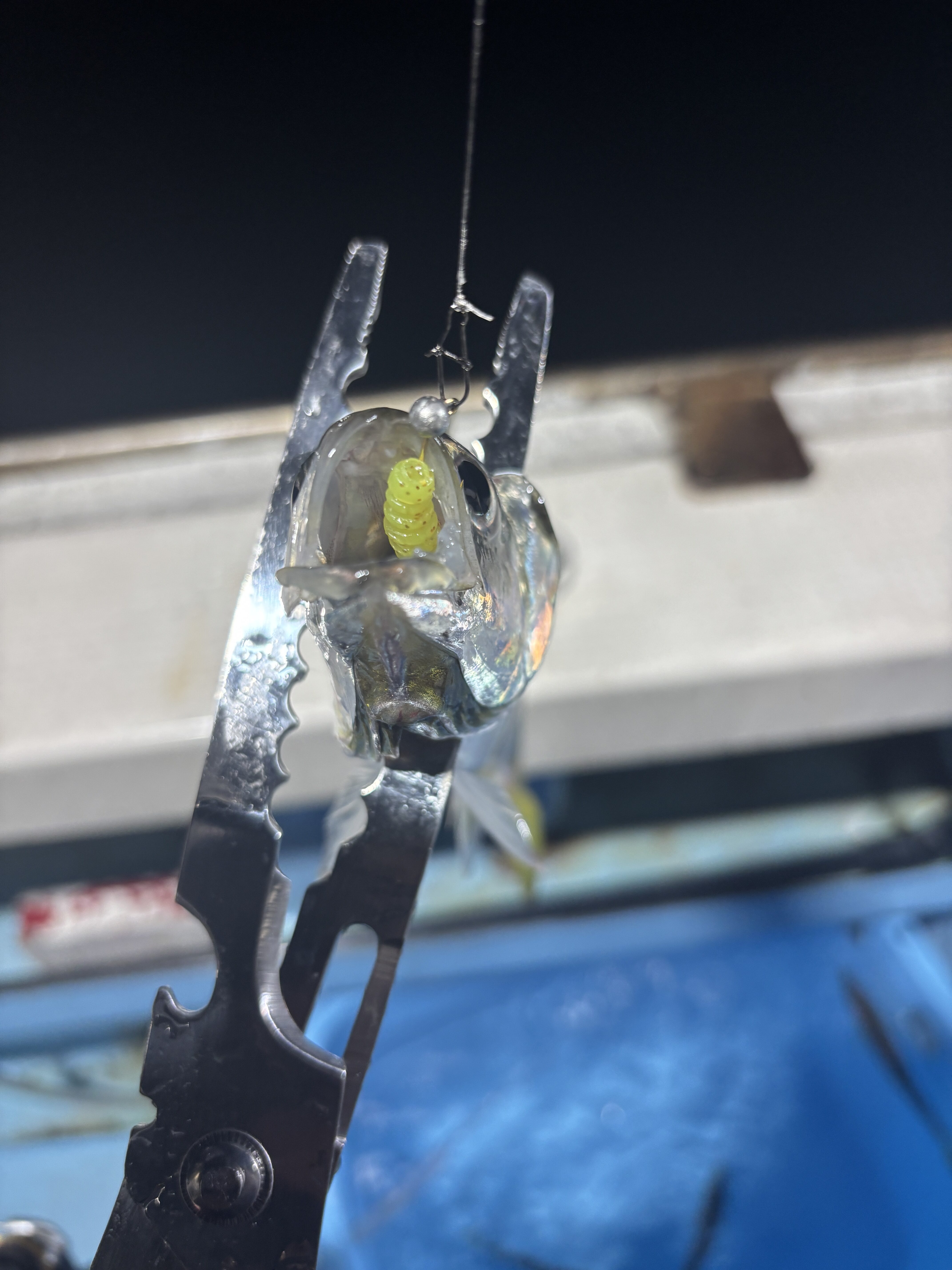船長によると軽い仕掛けだと中層あたりのコアジにかかってしまうとのことで重めの錘で船の真下に落とすと良いと教えてもらいました!
