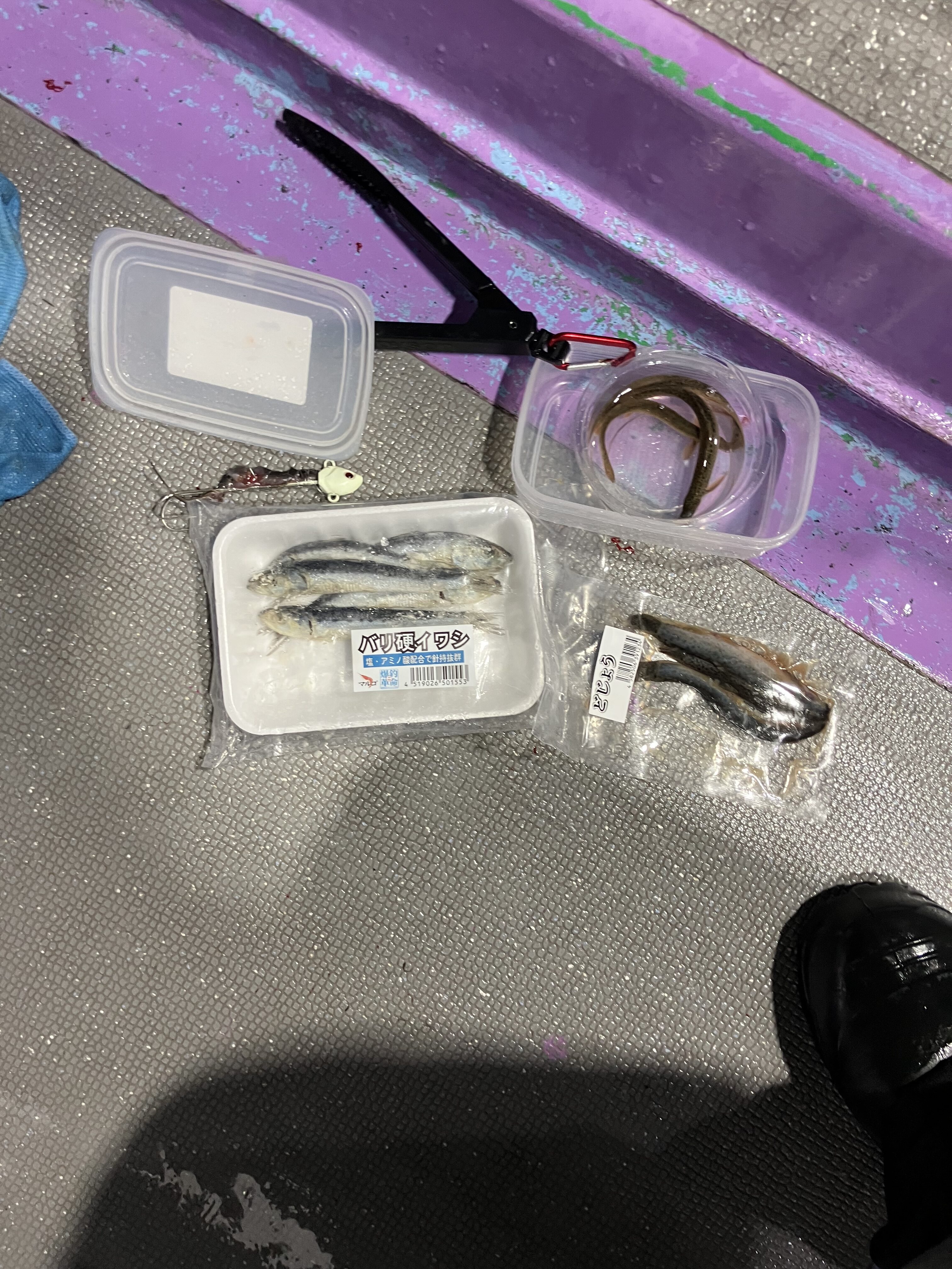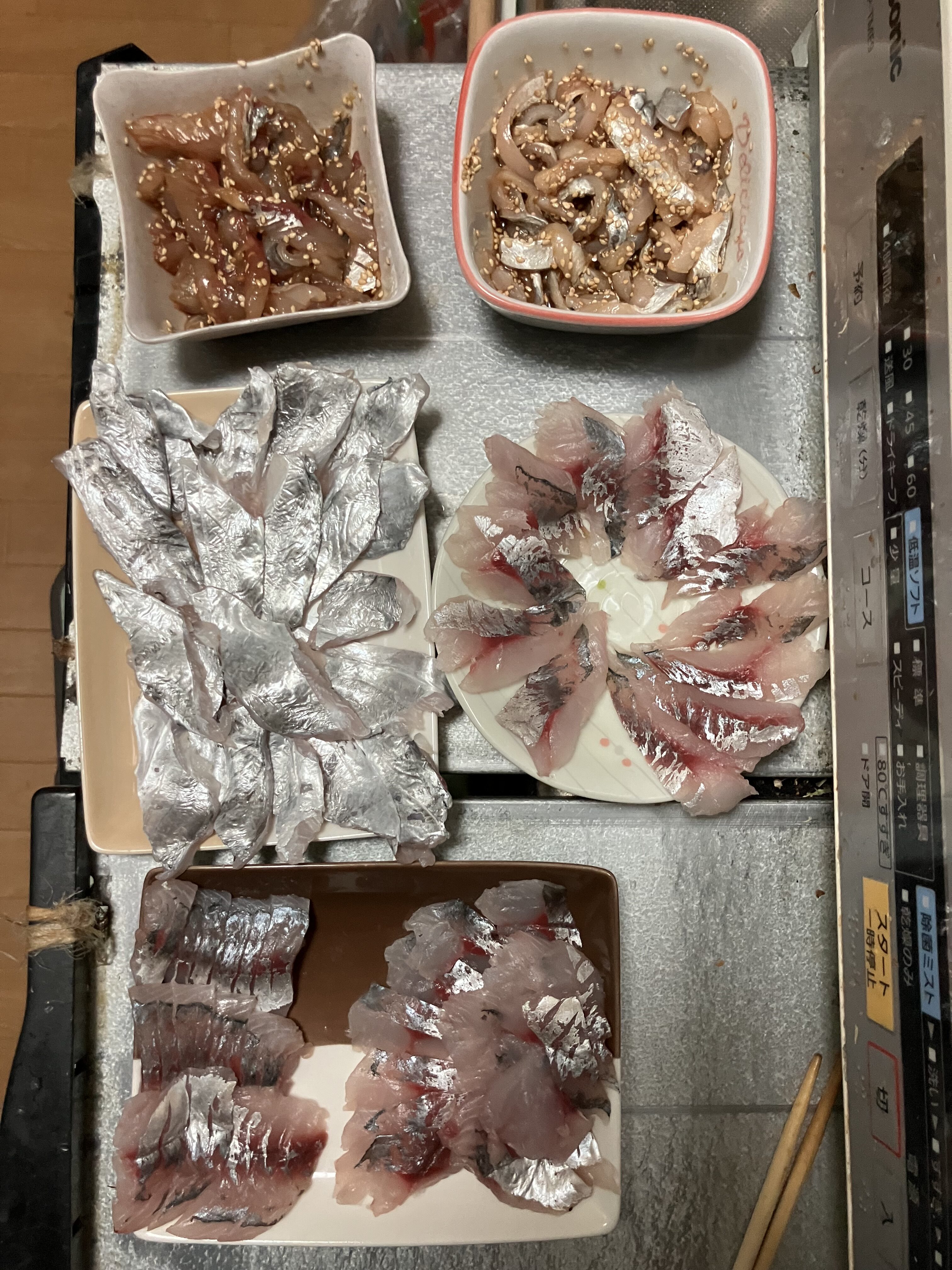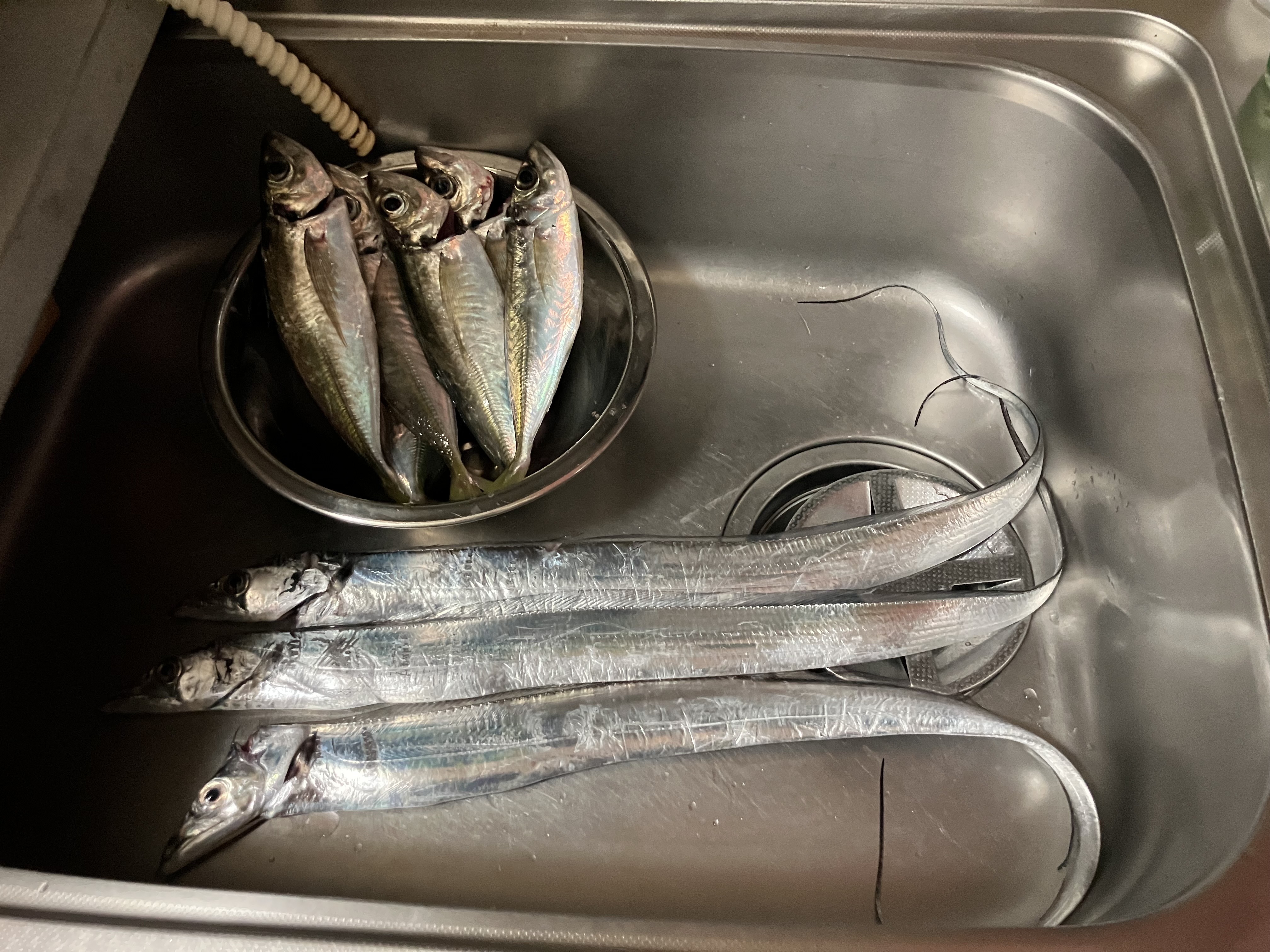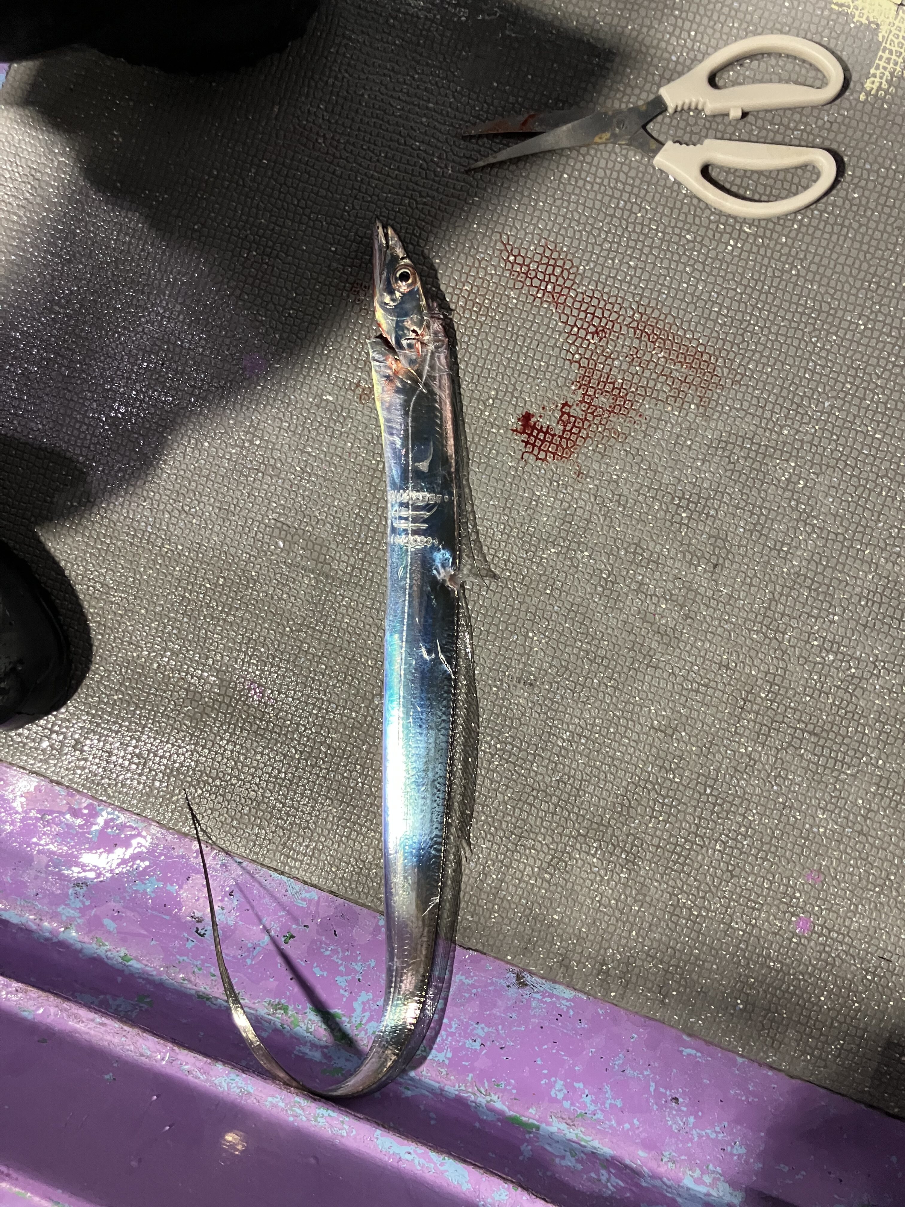 前回がタチウオ0匹と惨敗でしたので余り期待せずに16:30頃に出船20分ほどでポイントに 前回よりやや沖に錨を入れて開始。水深32m、一昨日はポツポツ釣れたとのことでしたが…2時間船中沈黙、前回の悪夢がデジャブならように襲ってきましたが、ボトムを切って2mあげたところで、コンコンガッツと明らかにフグとは異なるあたり、ロッドがしなります。イカメタルタックルなので楽しい。タチウオは上に泳ぐことがあるのでフルドラグ全力で巻きます。上がって来たのは指三本の小タチウオ…ですが待望の一本!続けとばかり狙いますがまた沈黙テンヤ途中我慢ならずバチコンに、中鯵は、ワームのカラー問わず釣れます。家族分のお土産を確保して、後はリリース。タチウオのしゃぶしゃぶしたいので、もう一度気を取り直して、テンヤへ…
