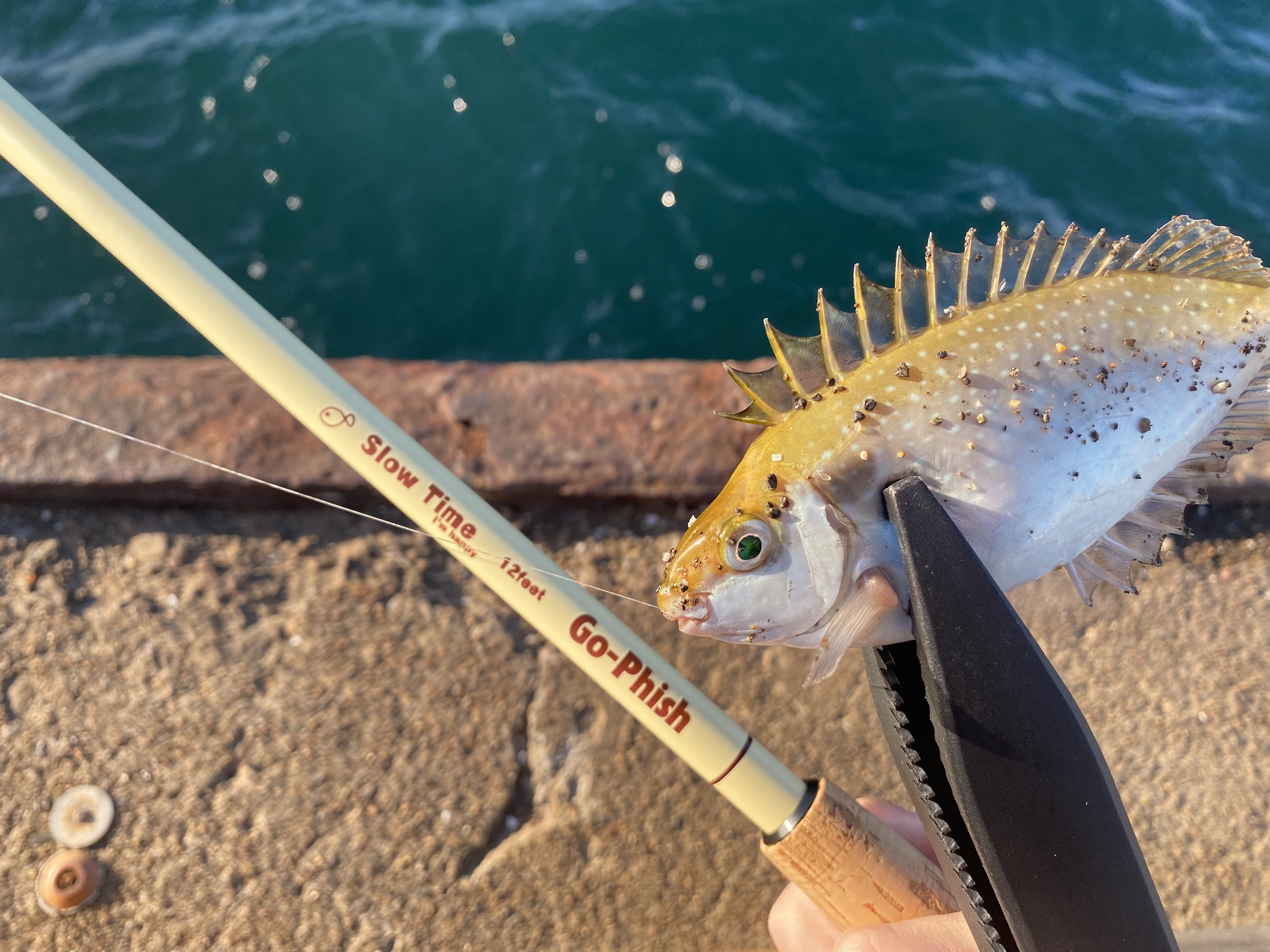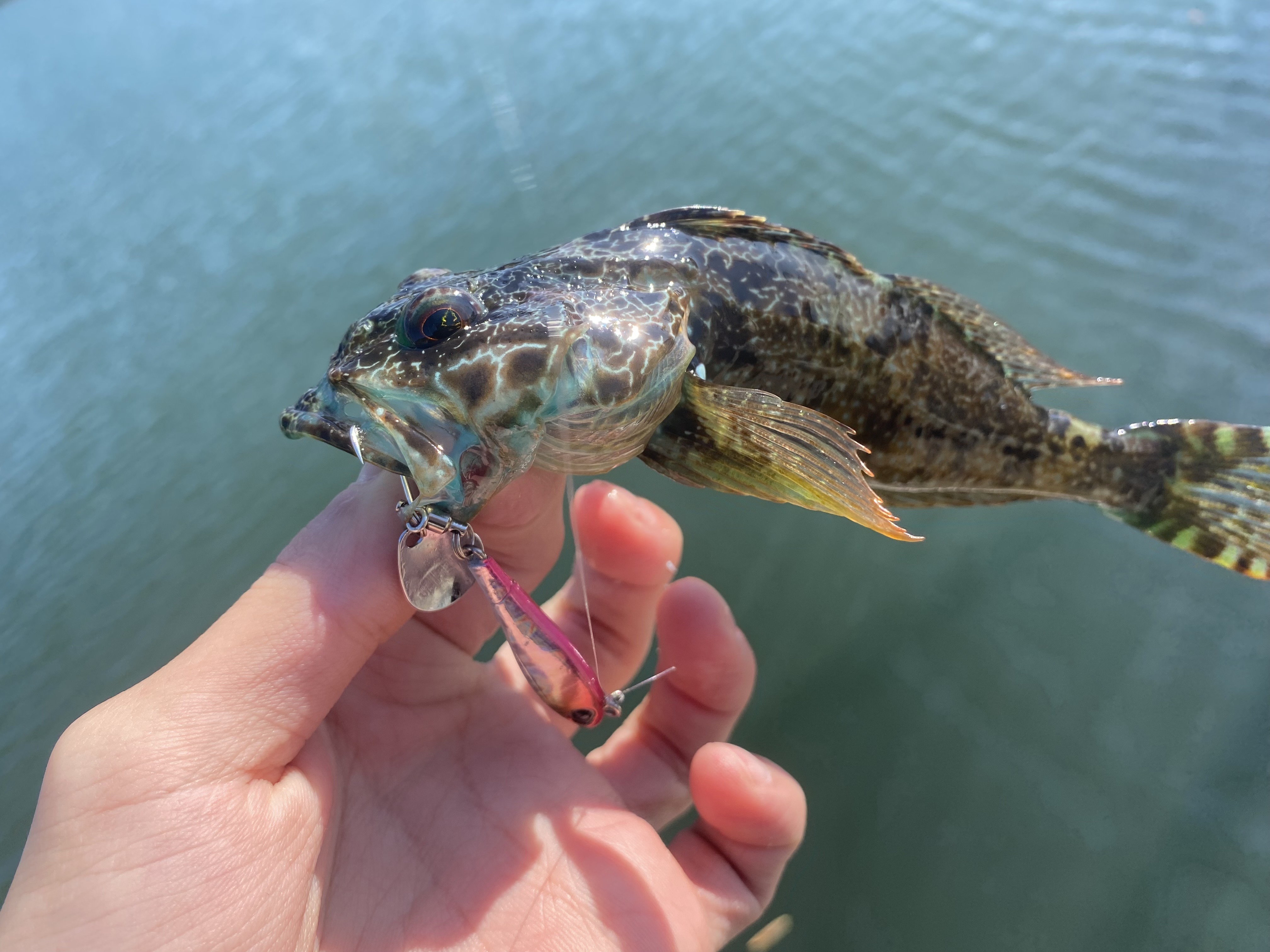 諦めずに攻めているとやっとグレが‼️割合はアイゴ8:グレ2って感じで毒祭りでした笑笑アイゴにオキアミを食べ尽くされ無くなったので、ルアーでメッキ、カマスを狙うことに!すると1投目から回収間際でカサゴのような魚がバイト❗️バラさないように慎重にあげるとアナハゼ😂😂