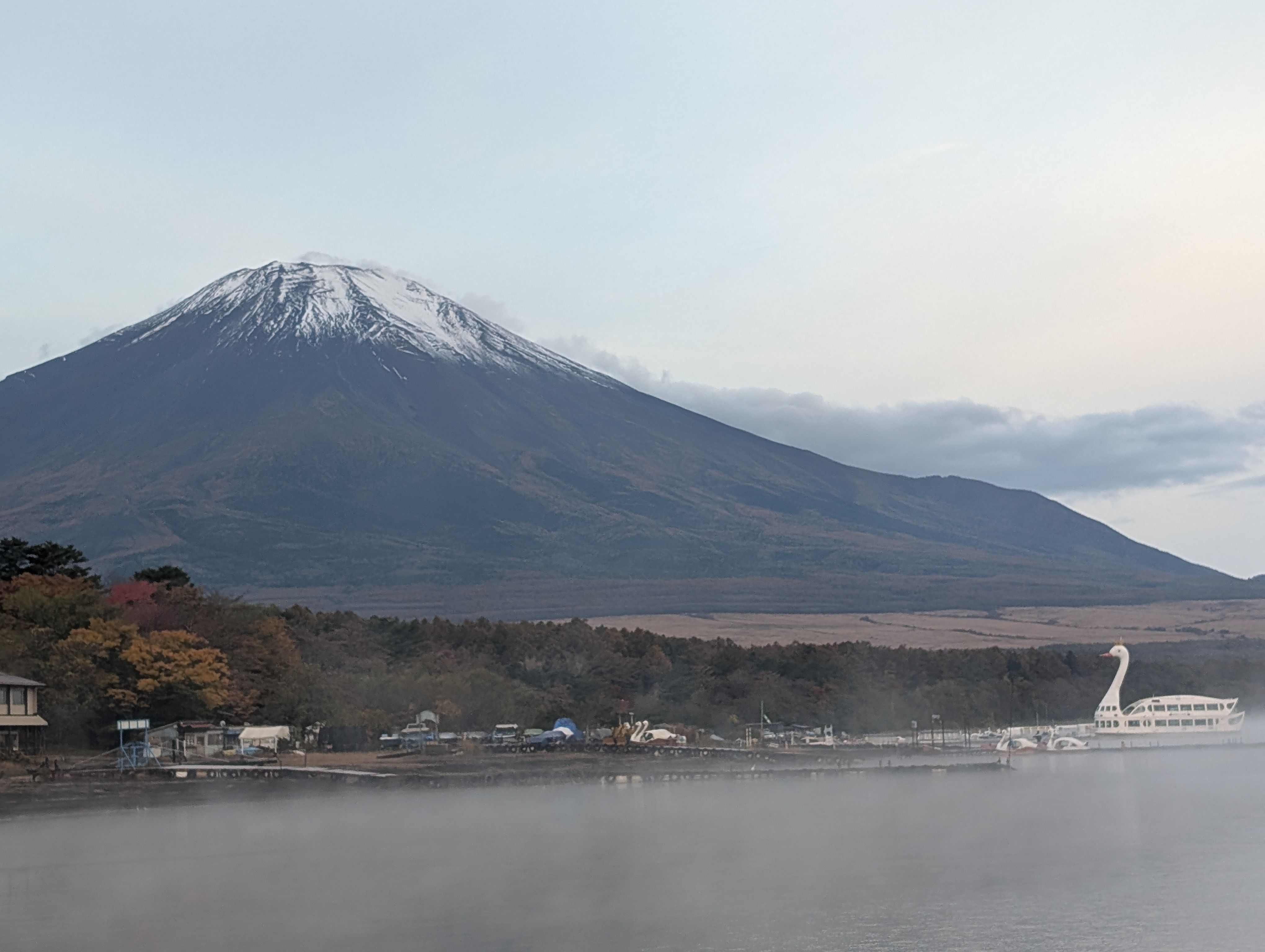 6時過ぎに現地に到着するとめっちゃ寒くて、湖面には朝もやが発生。富士山と薄っすら紅葉も見えて絶景です。