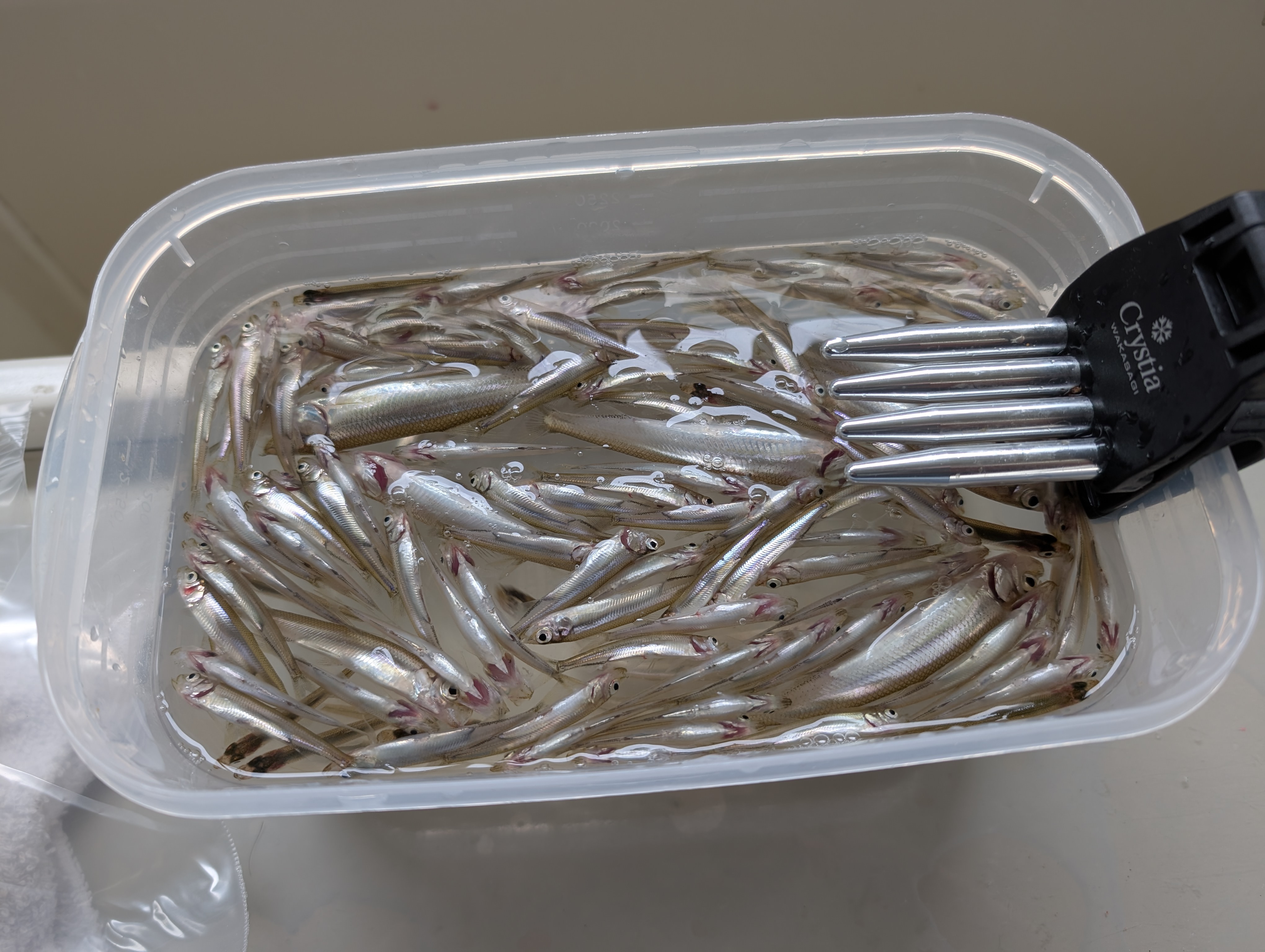 7時に出船してすぐにポイント到着。事前の情報では昨年同様サイズは小さめとのことだったので、鈎1号の6本鈎でスタート。開始からすぐに掛かりましたが、サイズはメダカサイズ。アタリはずっとあり、3匹、4匹掛けも良くありますが、全部4cm前後です。さらに鈎を小さくすればもっと掛かるとは思いましたが、小さいのばかりではな~という感じなので、鈎サイズはそのままで続行。