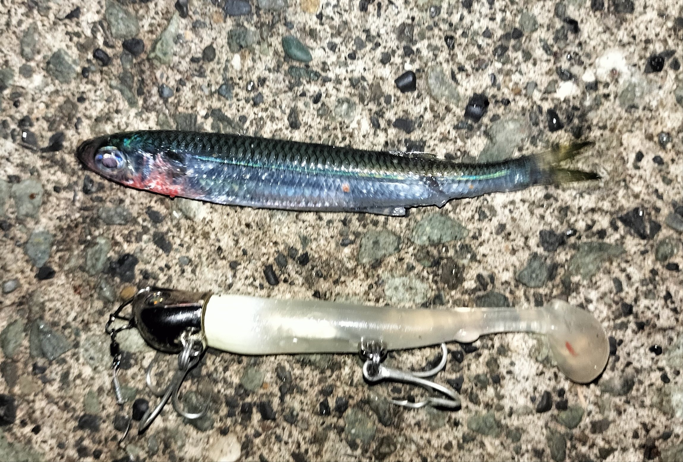 あくまでも本命はカマス。シーバス狙いの深追いは諦めて下田港に移動すると、ここでもトウゴロウイワシにシーバス(セイゴ〜フッコ級)が追い回しておりカマスの姿は無し。