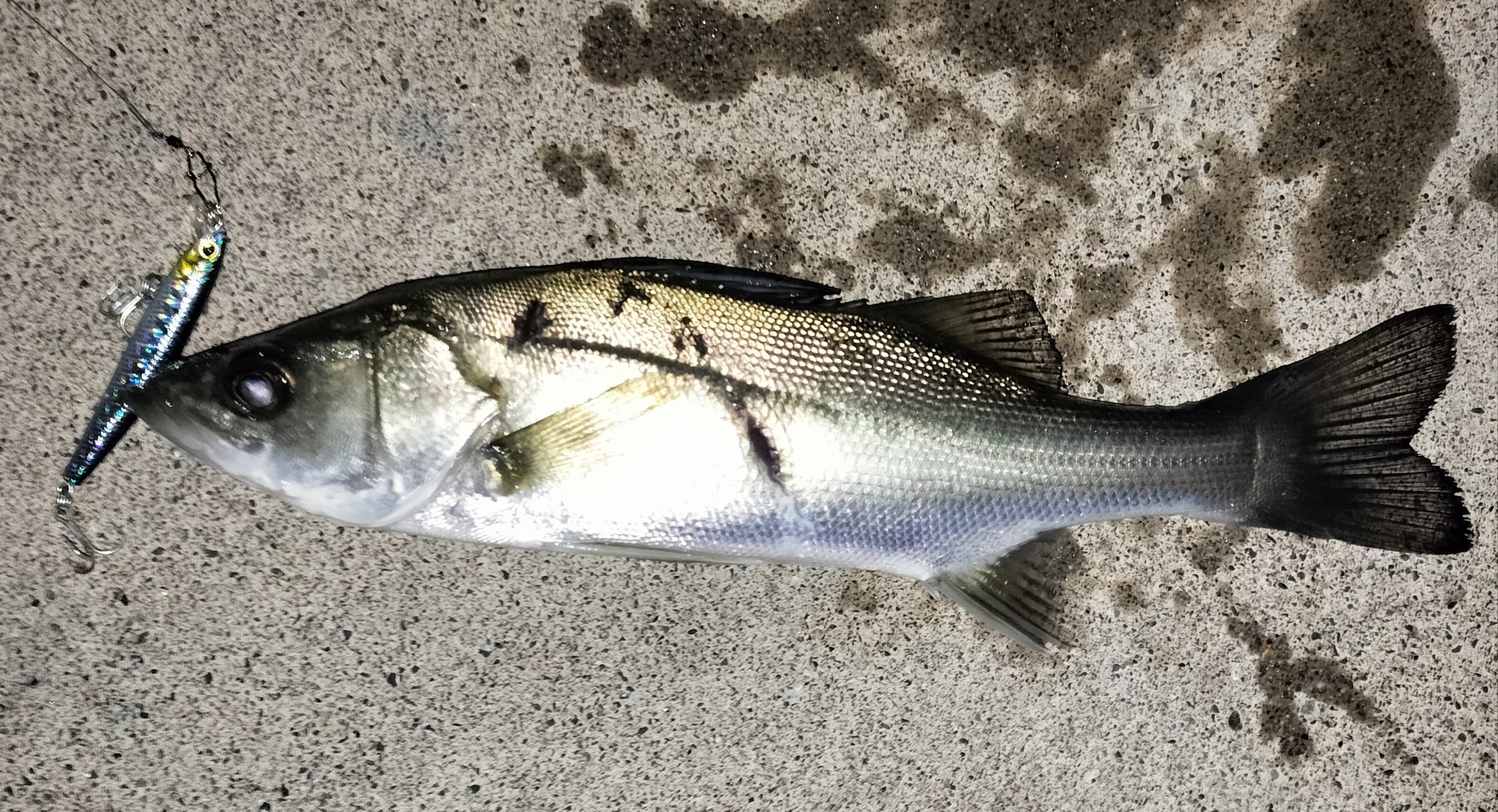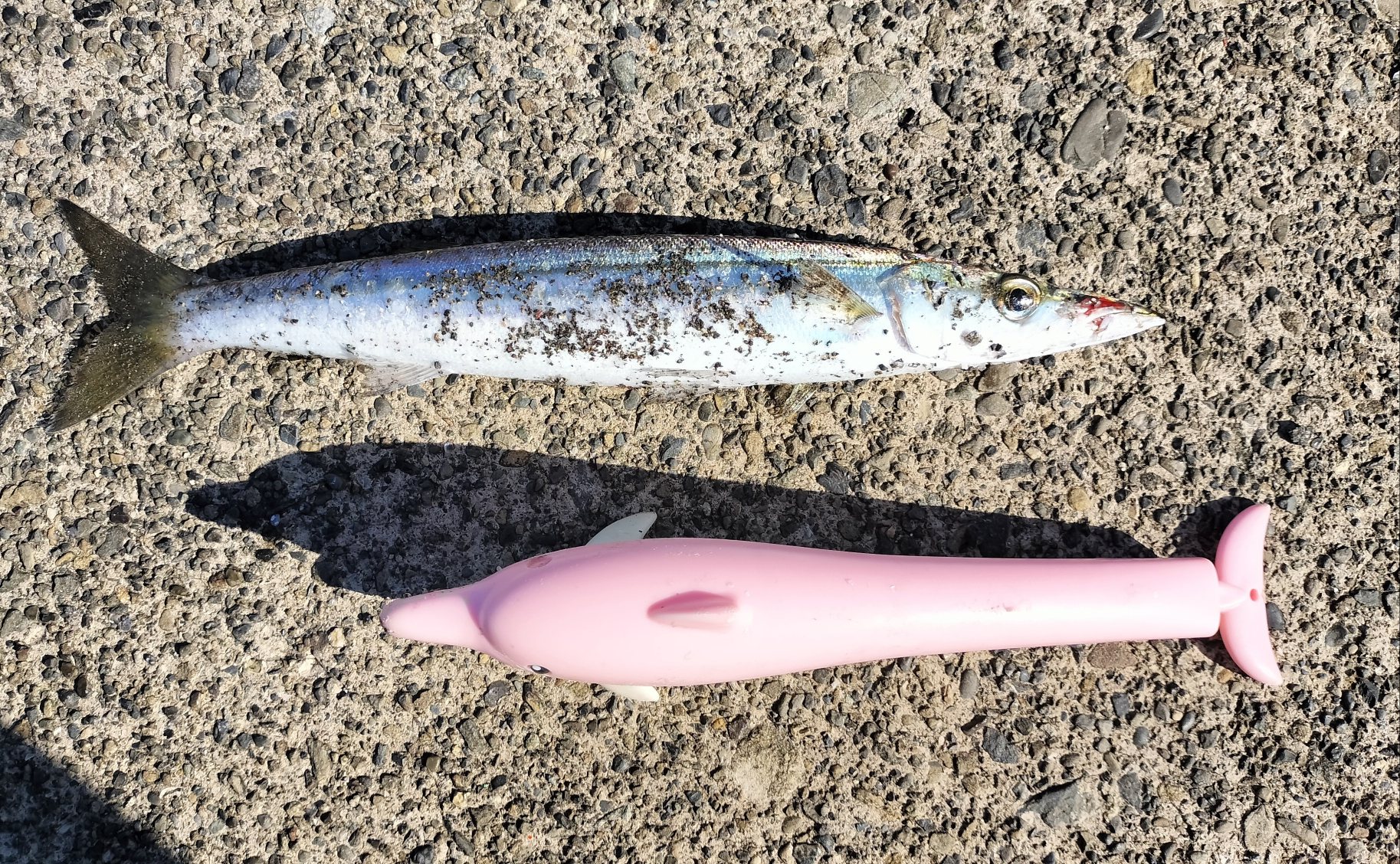 残念ながらカマスの魚影は無く、フッコ狙いに切り替えて手持ちのジョルティーをキャストするも相手にしてもらえず、スレ掛かりしたベイトをフックに掛けタンデム状態にしてキャストしてみたら、まさかのバイトが出る。