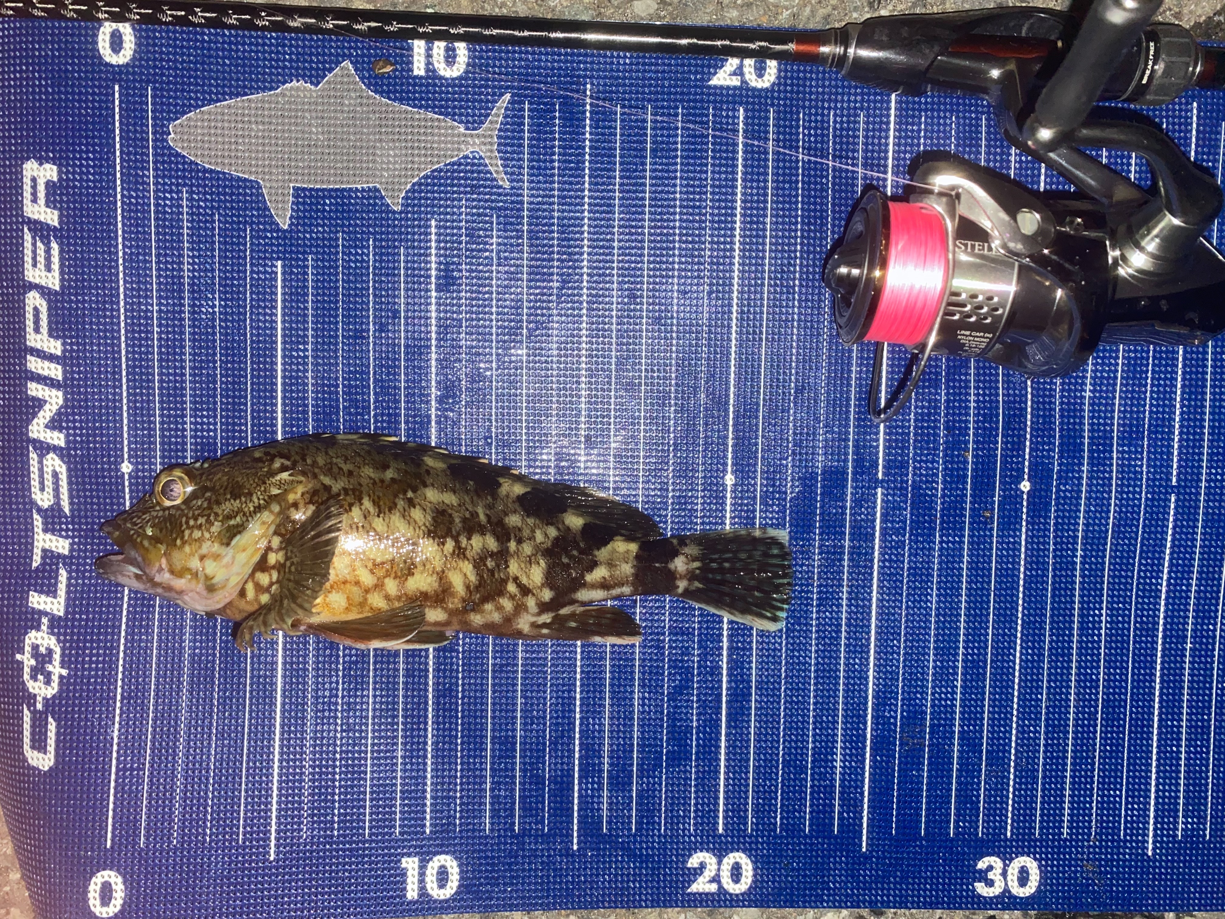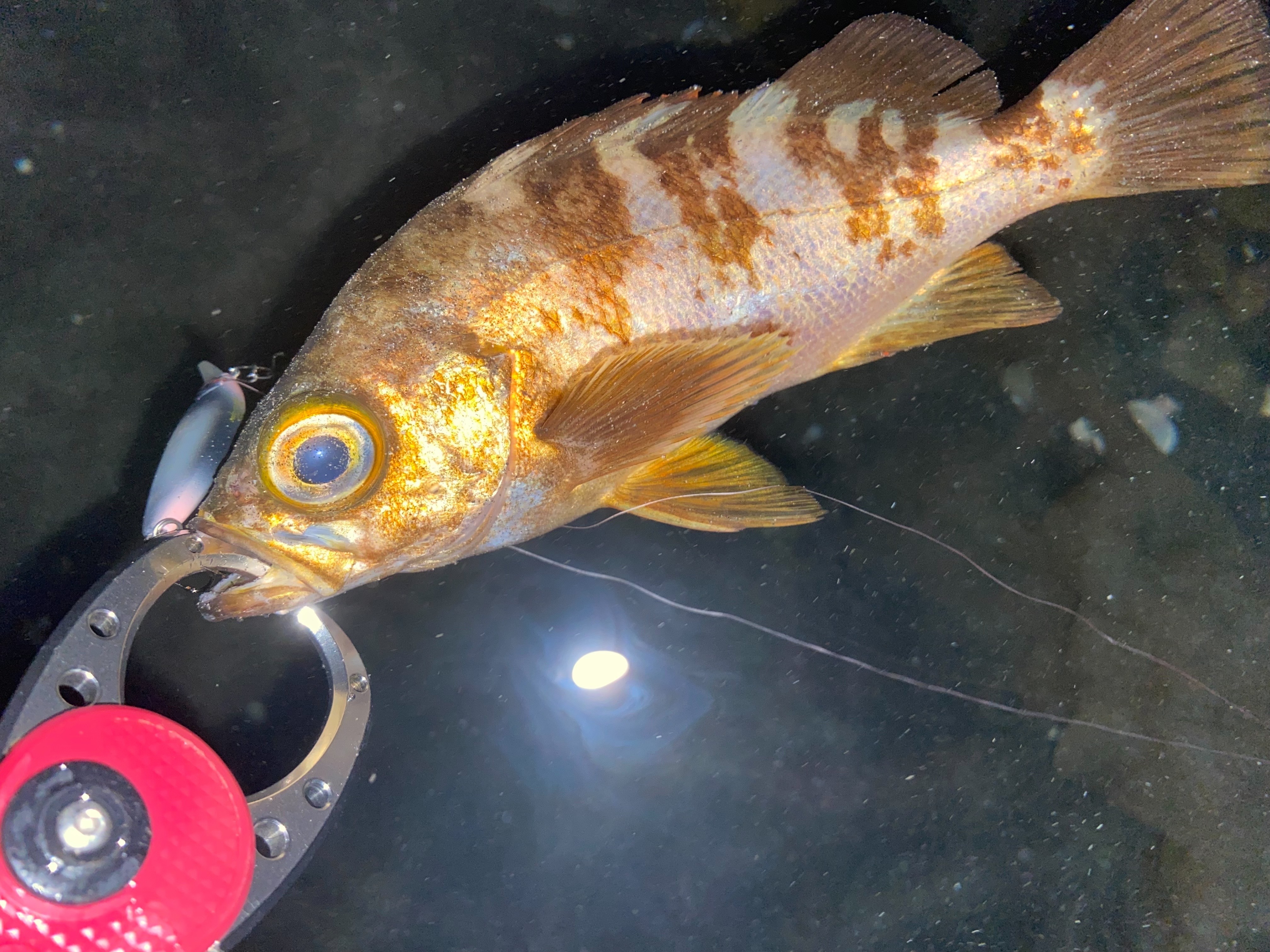 根に入られるとまずいので、リールゴリ巻きで水面を滑らせながら18cm前後くらいのメバルをキャッチ😁