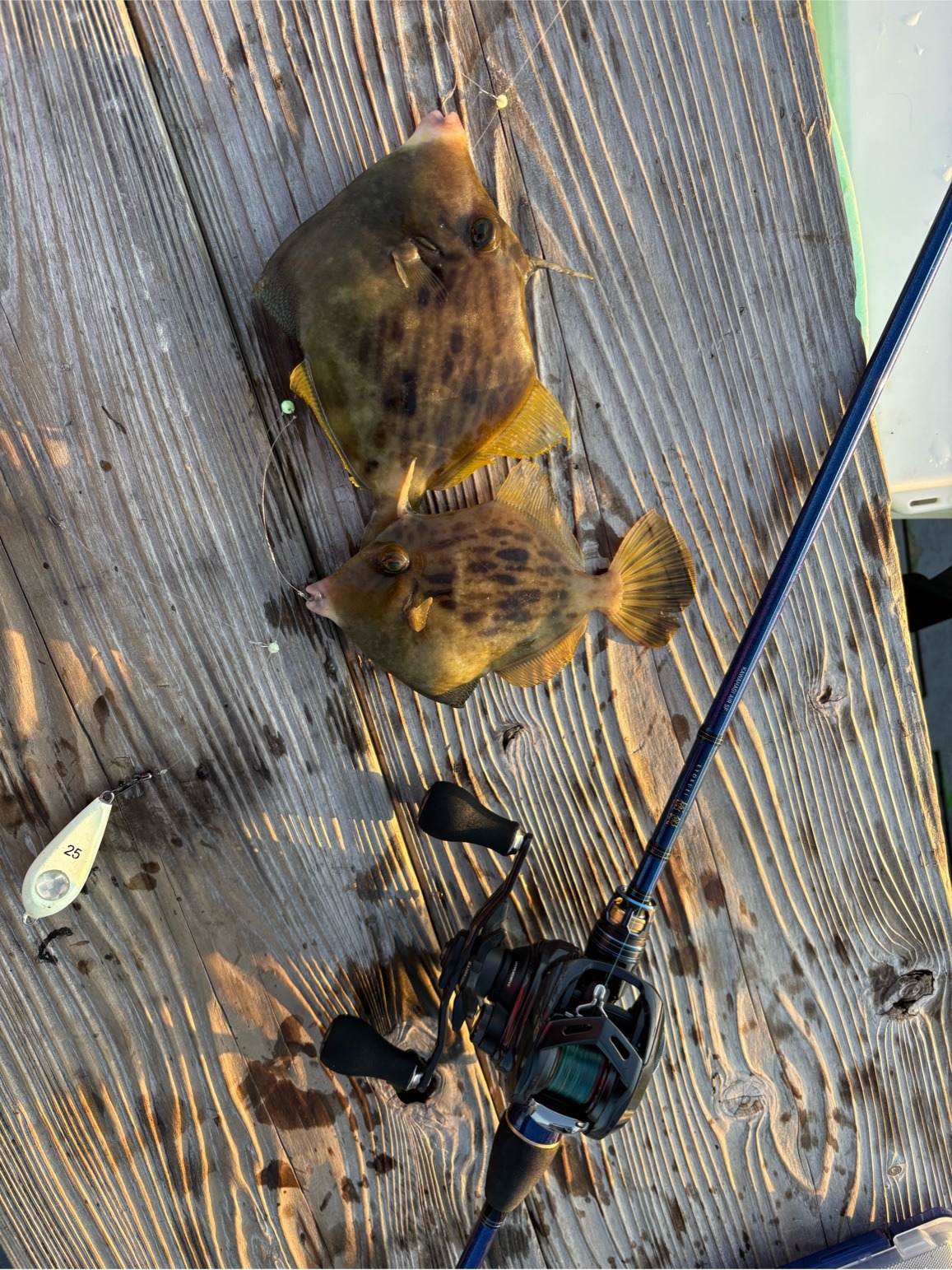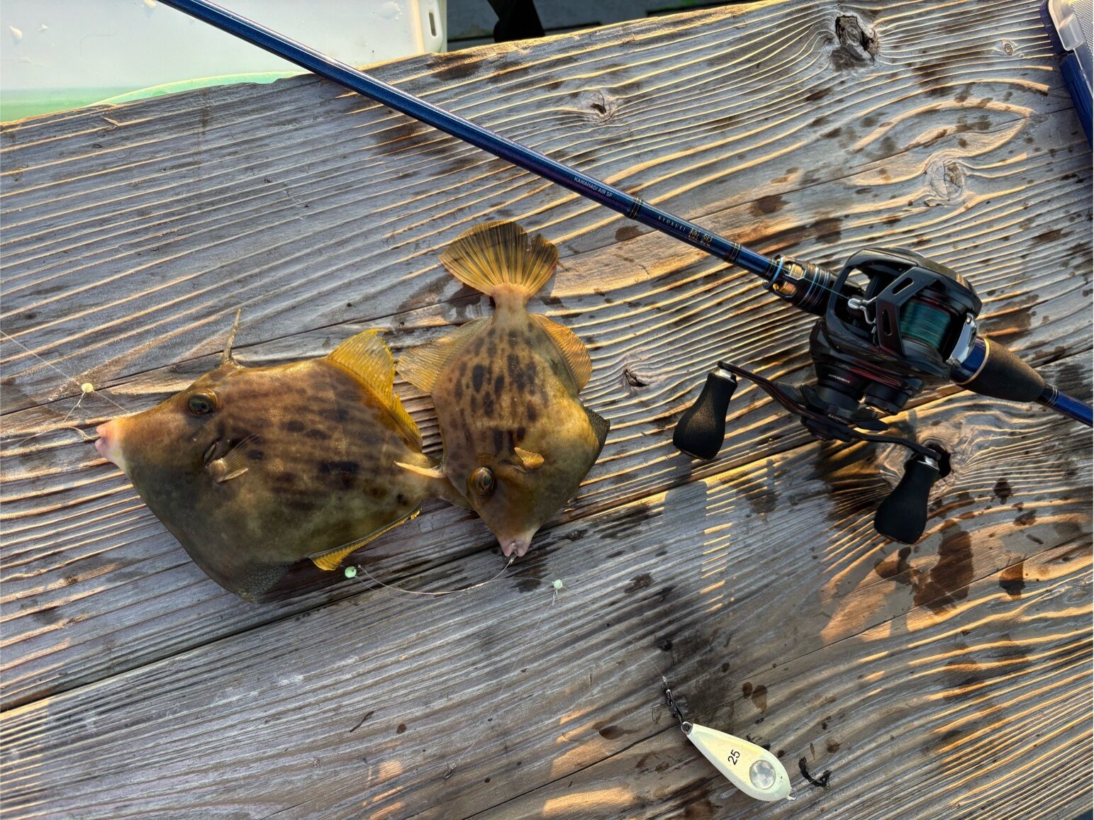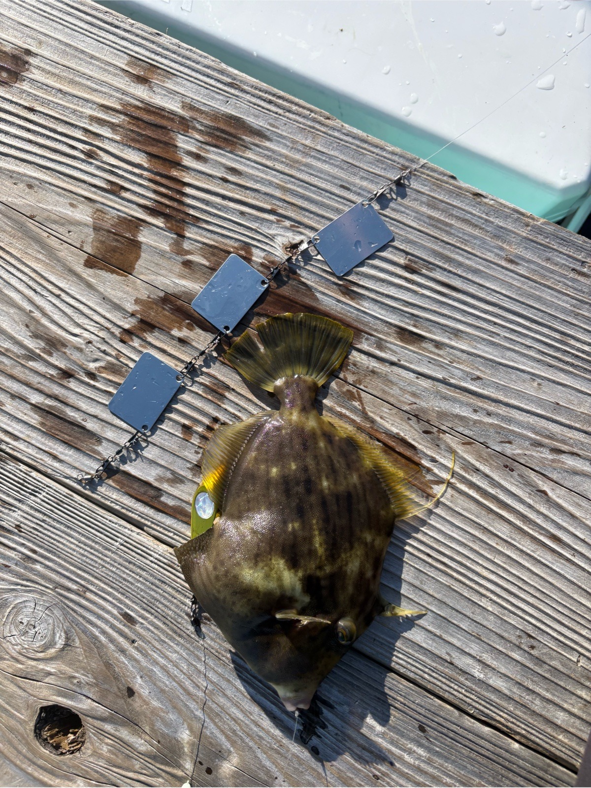 アオリとカワハギはおそらく似たような場所にいると思われるので、ちょこっとカワハギ仕掛けを落とすと1枚釣れました!