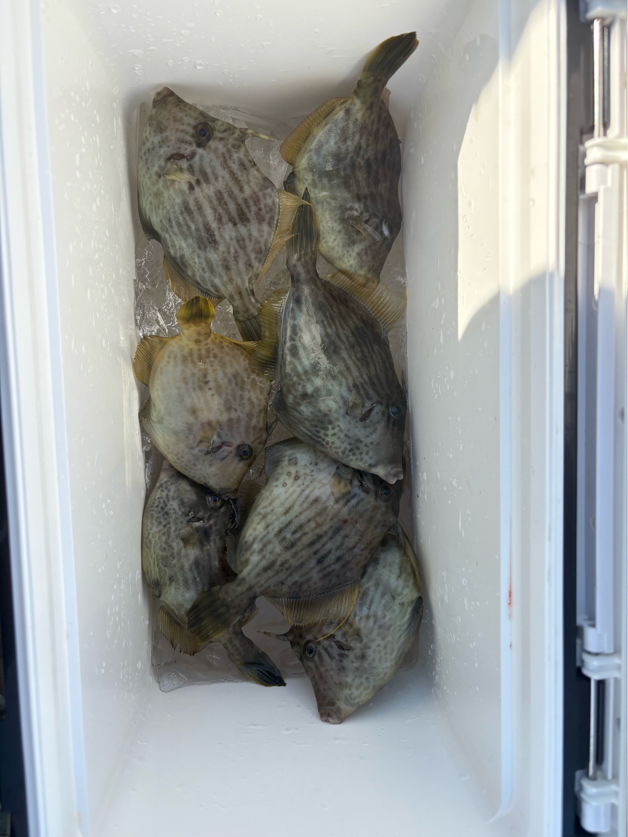 同じような海域をやっているであろう周辺船宿さんの釣果を後ほど見てみると、予想通りアオリは厳しく0〜3杯程度、カワハギもトップで7,8枚といった感じです。 結果的にカワハギの枚数は悪くなかったようですが、型がすべて小さいので揃っていました。