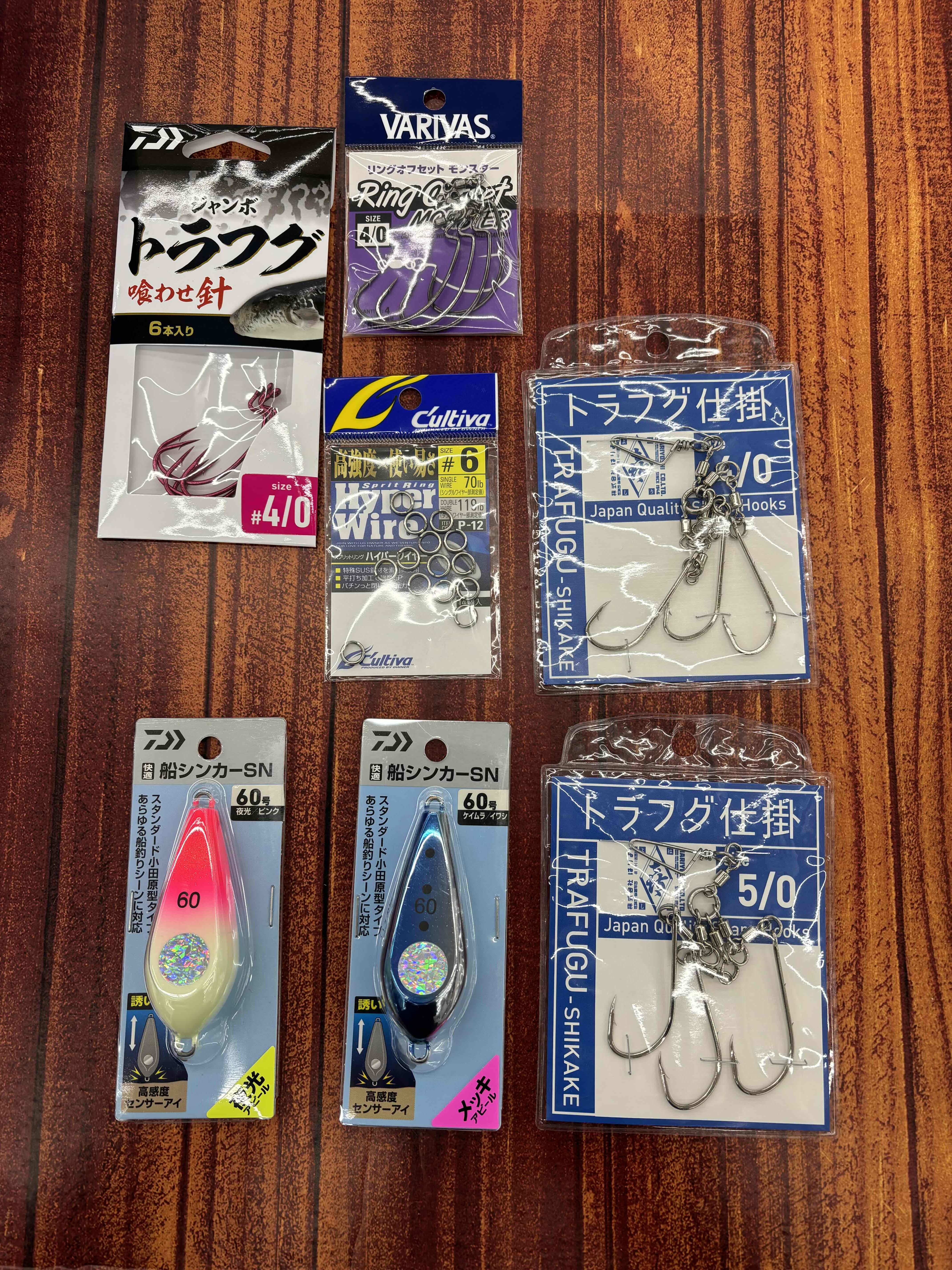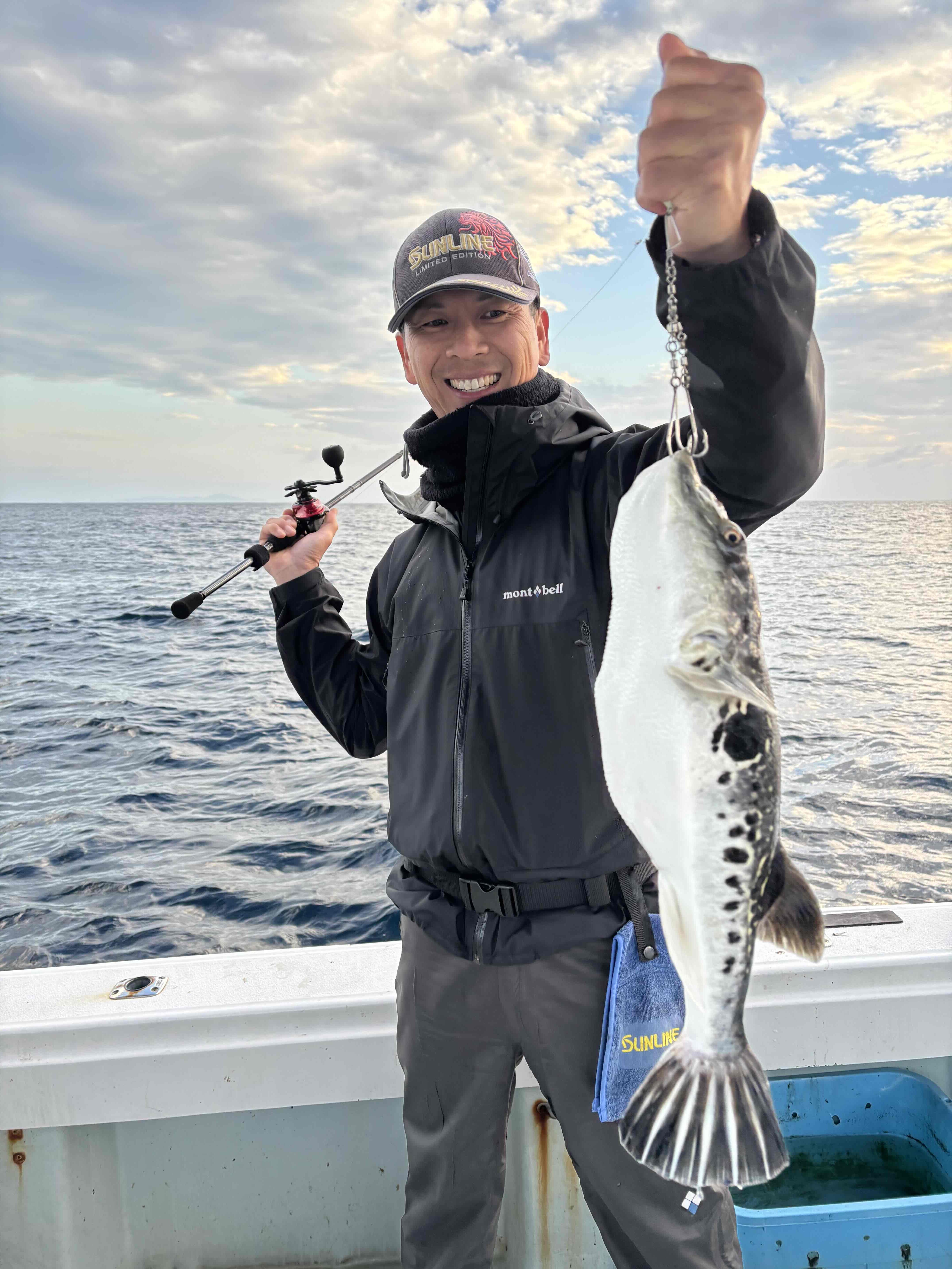 初めてのトラフグ釣行に行ってきました。昨年から情報があり行ってみたいと思っていたので楽しみな釣りです。大型トラフグを狙って釣れるのが珍しい釣り場。三重の魚堪丸さんでの出船 6時出船12時までの釣行 ポイントまでは約20分 船はアンカーをうってのカカリ釣り トラフグ専用仕掛けでエサは塩サンマ 生サンマ 生イワシを用意 ロッドはタチウオテンヤロッド 7:3調子8:2調子でも柔らかめが前アタリなどわかりやすく良かったです。電動リールに(手巻きリールでもよい PE 2号~1.5号 リーダーは8~10号でセットしました。 ダイワ快適船シンカー60号スタート 追加の錘はオーナーカットウシンカーで足していきます。 仕掛けを投入して底とり 底から50cm~3mまでを待っている感じ ゆっくり誘っても良いがエサ取りアタリが良く出ます。エサのサンマがグジャっとなっているとトラフグの仕業 アタリが合って即アワセでも良い、持っていくアタリが出るまで待っても良い感じ 後ろではヒット 大型トラフグ