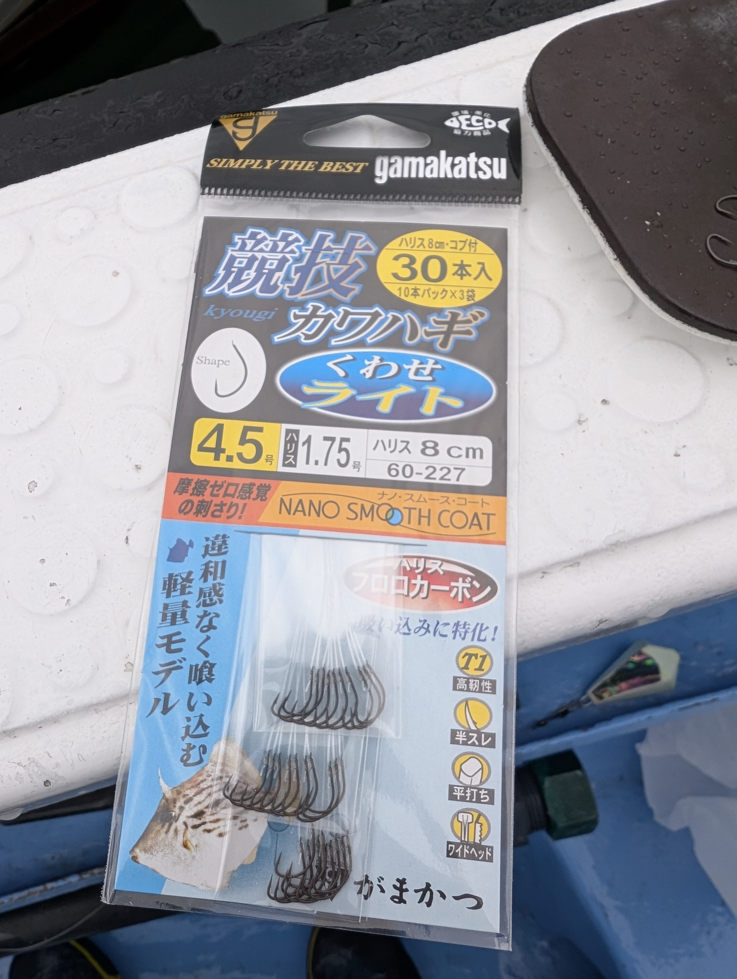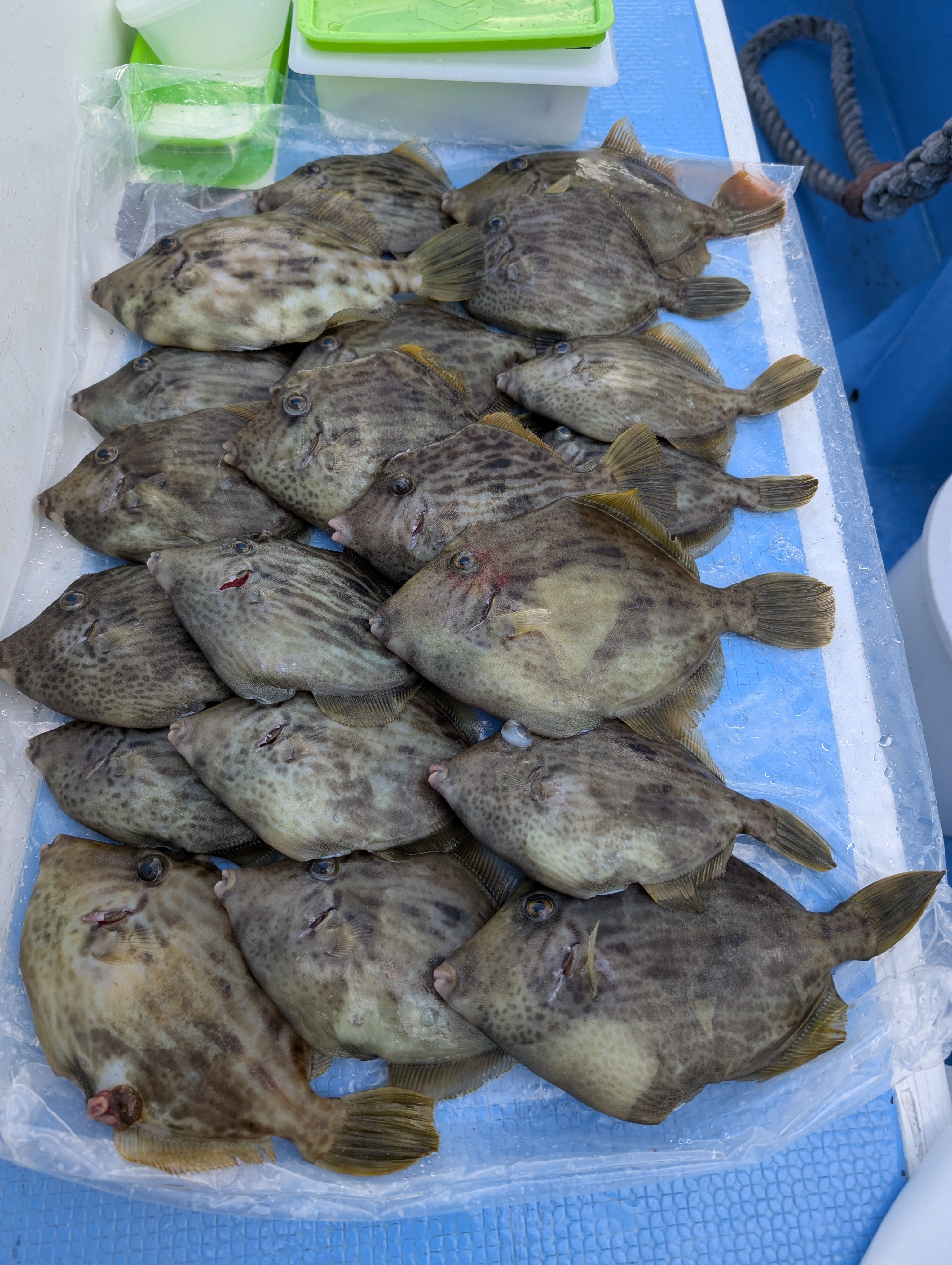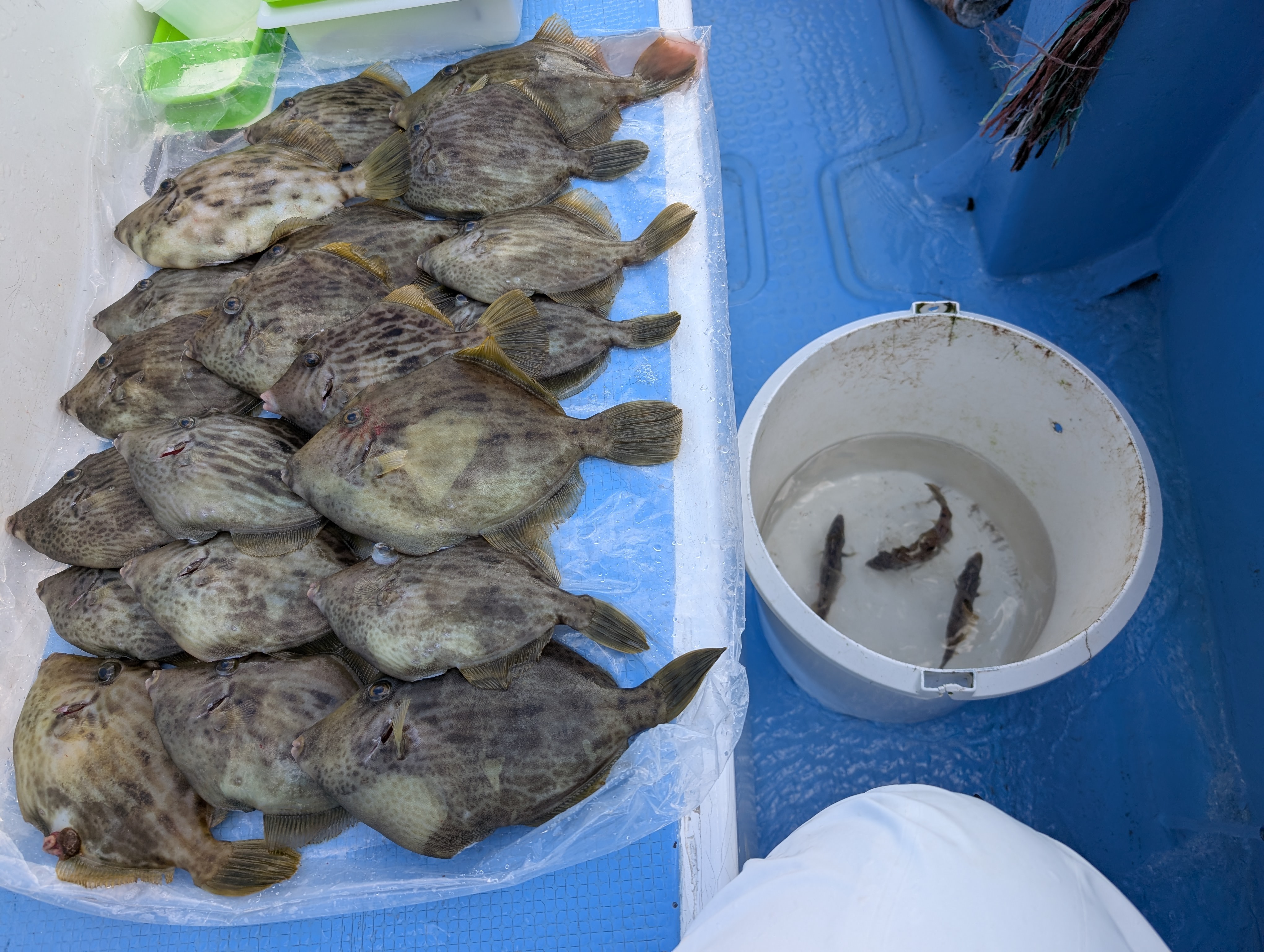 1投目、底に着いて糸を張るといきなりコツコツとアタリ。誘い合わせるとカワハギらしいカンカンという引き、でもちょっと重い?な引き。上がってきたのはカワハギのダブル!幸先のいいスタートです。そこから10時ぐらいまでのモーニングサービスタイムは順調に数が伸びて、あっという間にツ抜け。少しづつアタリが少なくなって、たまにアタリが止まることもありましたが、ゼロテンと遠投でポツポツ釣れ続きました。後半、フグの猛攻にあって鈎を食いちぎられることが多発して、風と波も出てきて釣り辛くなりましたが、それでも最終的に24匹とまずまずの釣果になりました。