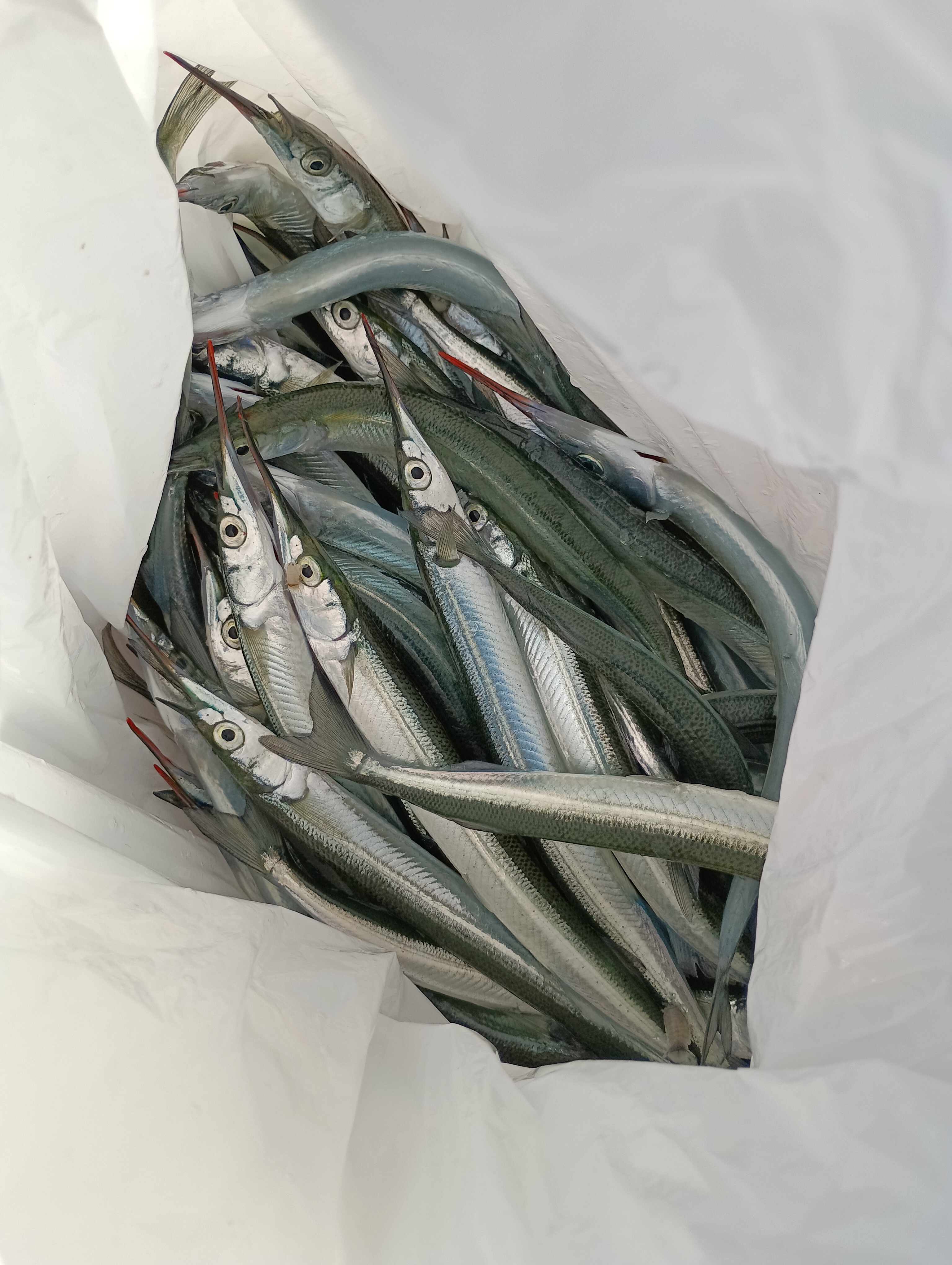 全く釣れる気がせず、どうしたものか海眺めていると、サヨリが沸いており、とりあえずサヨリ釣ってお土産にするかと、めちゃくちゃ久しぶりにサヨリ釣り。