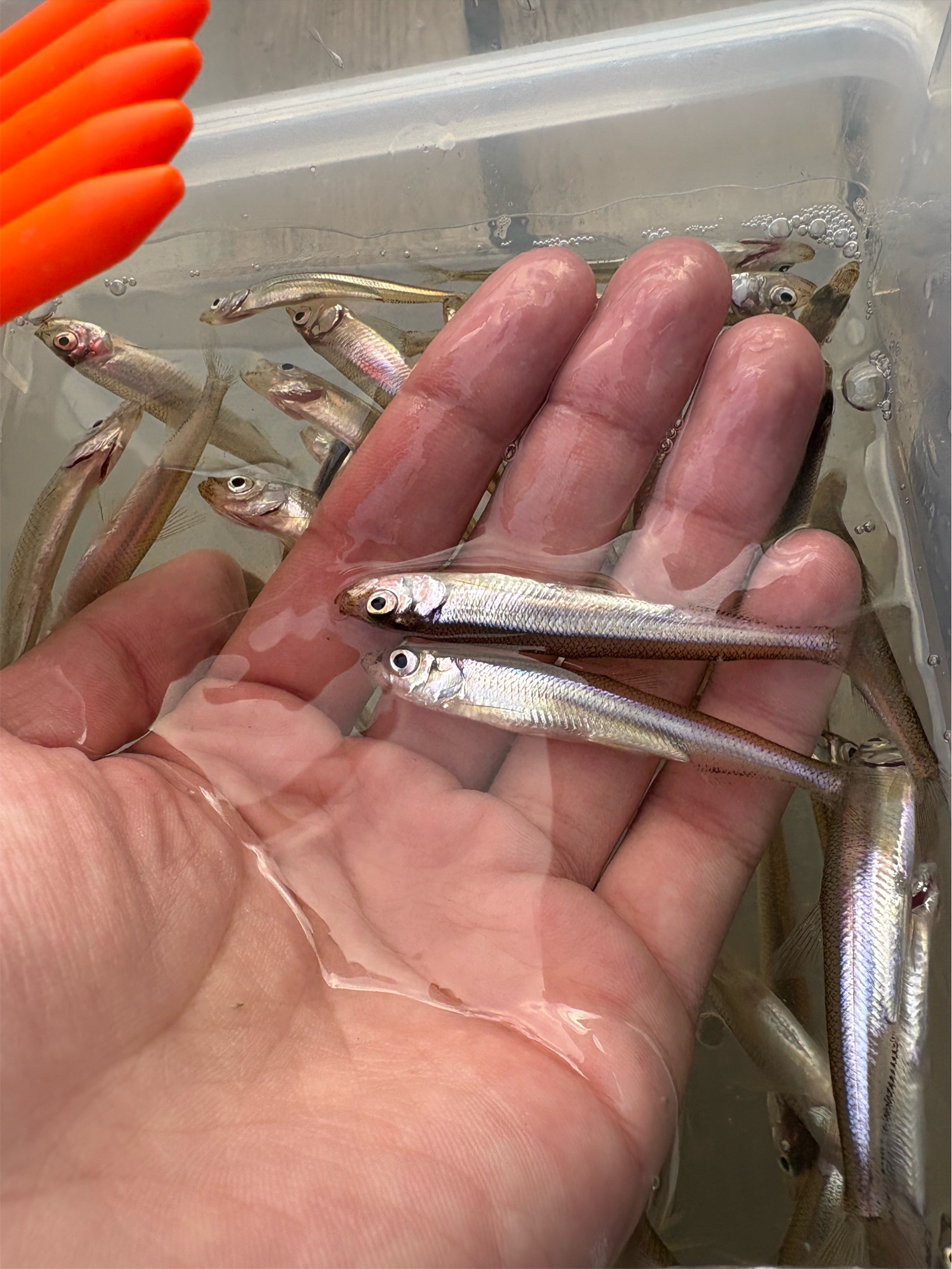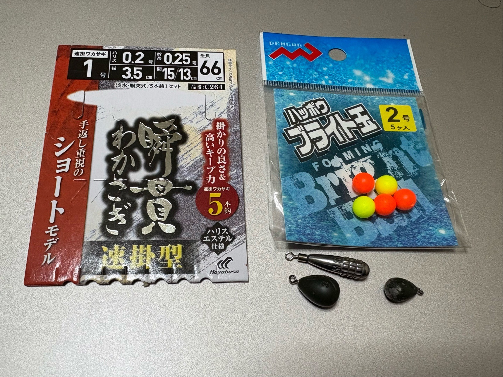 はじめは5gシンカーを使用していましたが、風で船が回ったり表層が流れたりの影響で、仕掛けが張ったり引っ張られたりして食いが落ちたので、途中から7,10gとウェイトを上げました。 流れなければ水深も浅いので軽くていいのですが、こういった時のために重めのシンカーも用意しておくといいと思います。