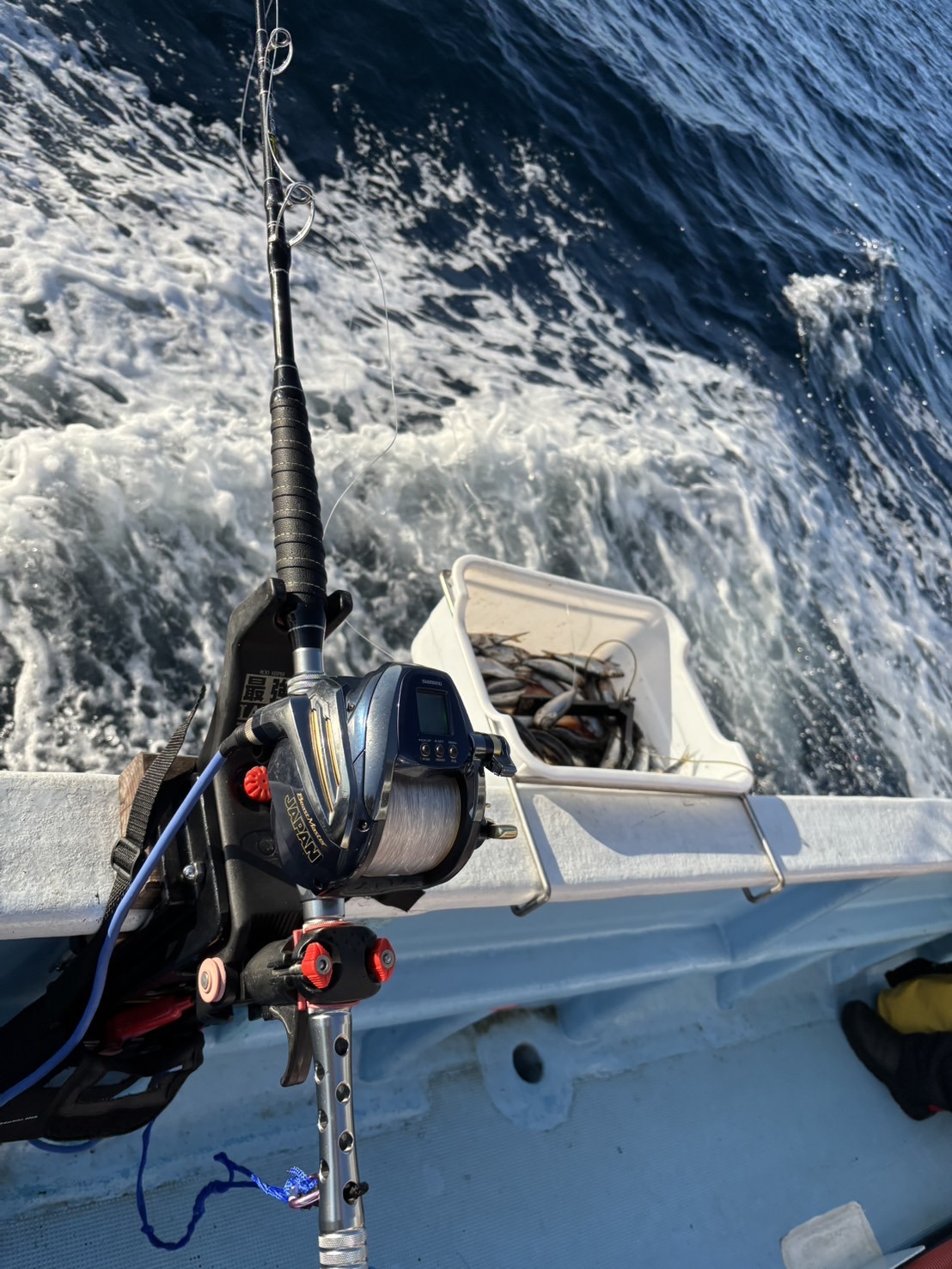 このアタリは間違いなく「アイツ」で喜びもつかの間、いやーな予感が漂います。電動リールを全開でまきあげてきますが、魚も何度となく抵抗を見せます。