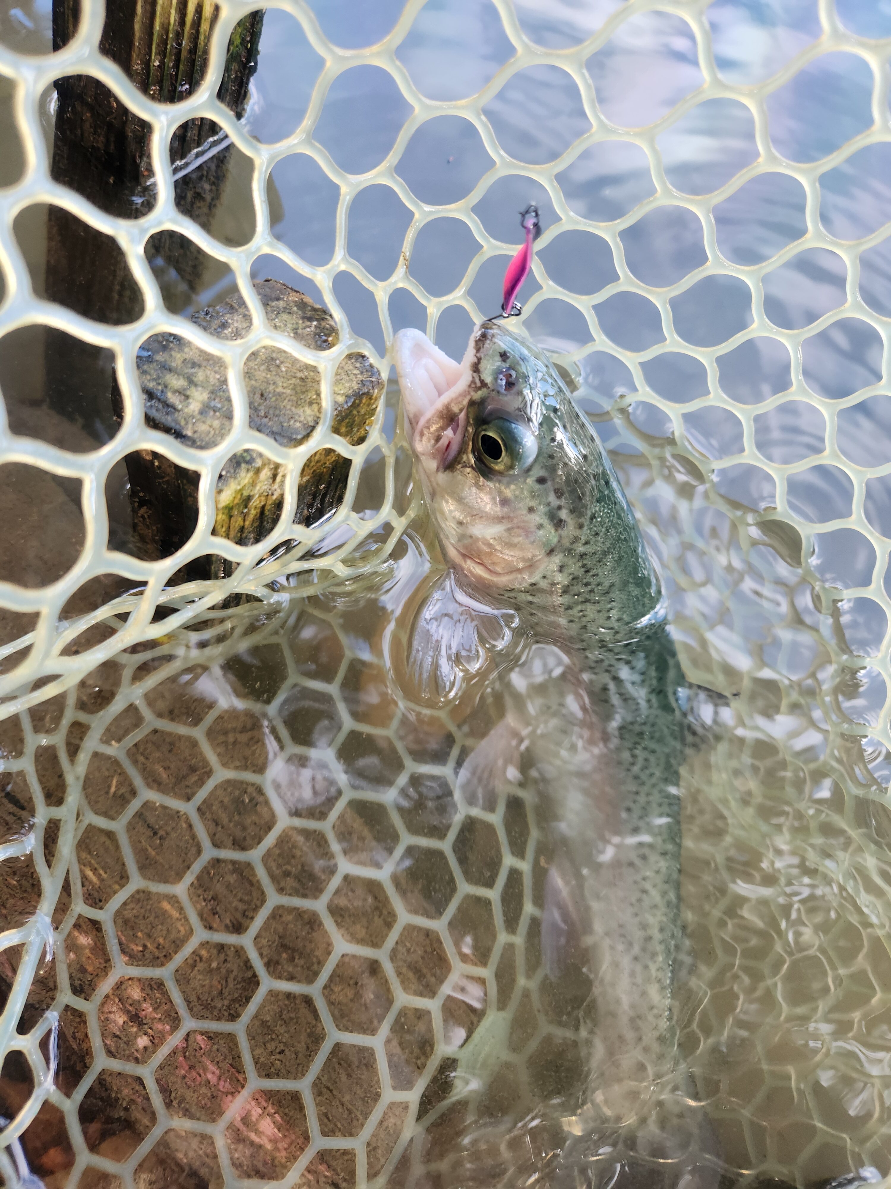その後はポンド中央部の止水エリアも攻めましたが、流れに付いてる魚は上を見ておりレンジ浅め。