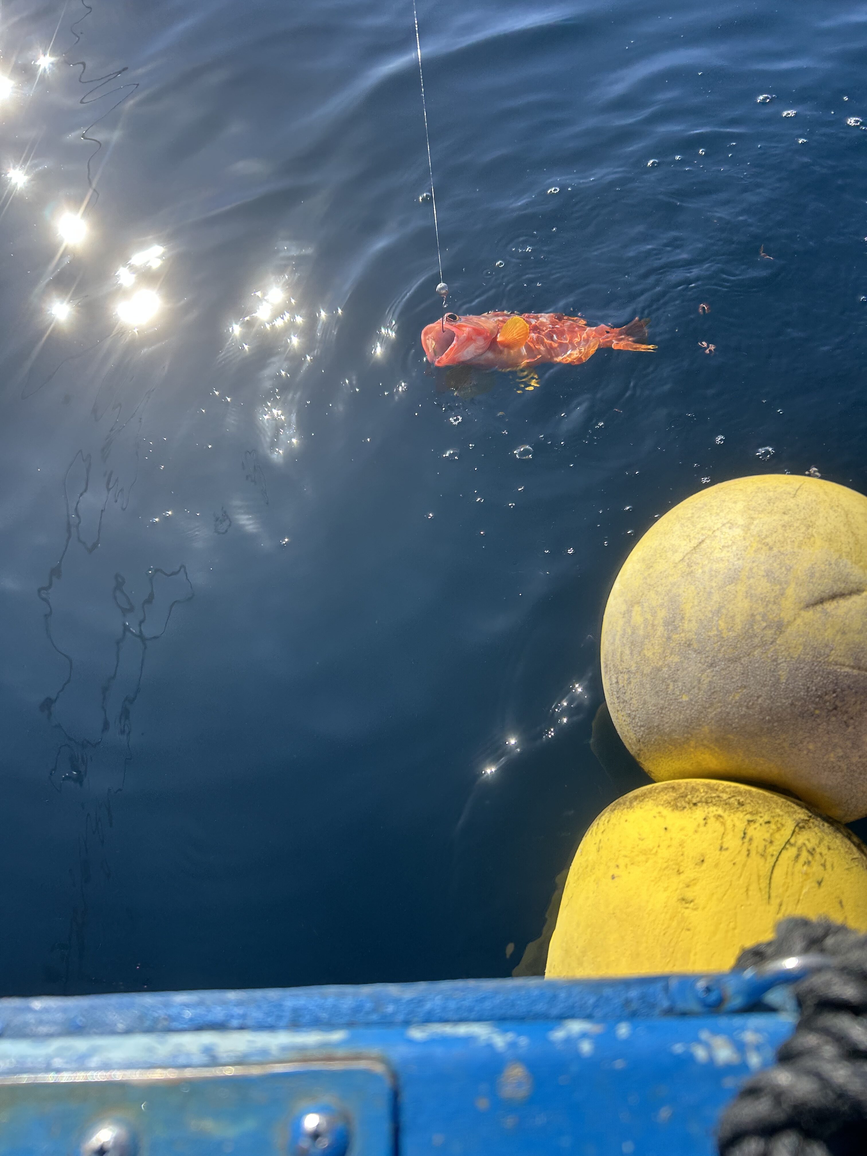 フカセ釣りではオキアミを撒き続け、本命が回ってくるのを待ちますが、突然リールのラインがバチバチと強烈に引き出されます。今日は海上釣堀用の3mの柔らかめな竿で釣りをしていますが、海中に穂先が引き込まれ、ギリギリのやりとりをするのが非常に楽しいです。上がってきたのは、50cmのスマガツオで今日の本命をゲットです。でっぷりと太っていて大満足の1匹です!