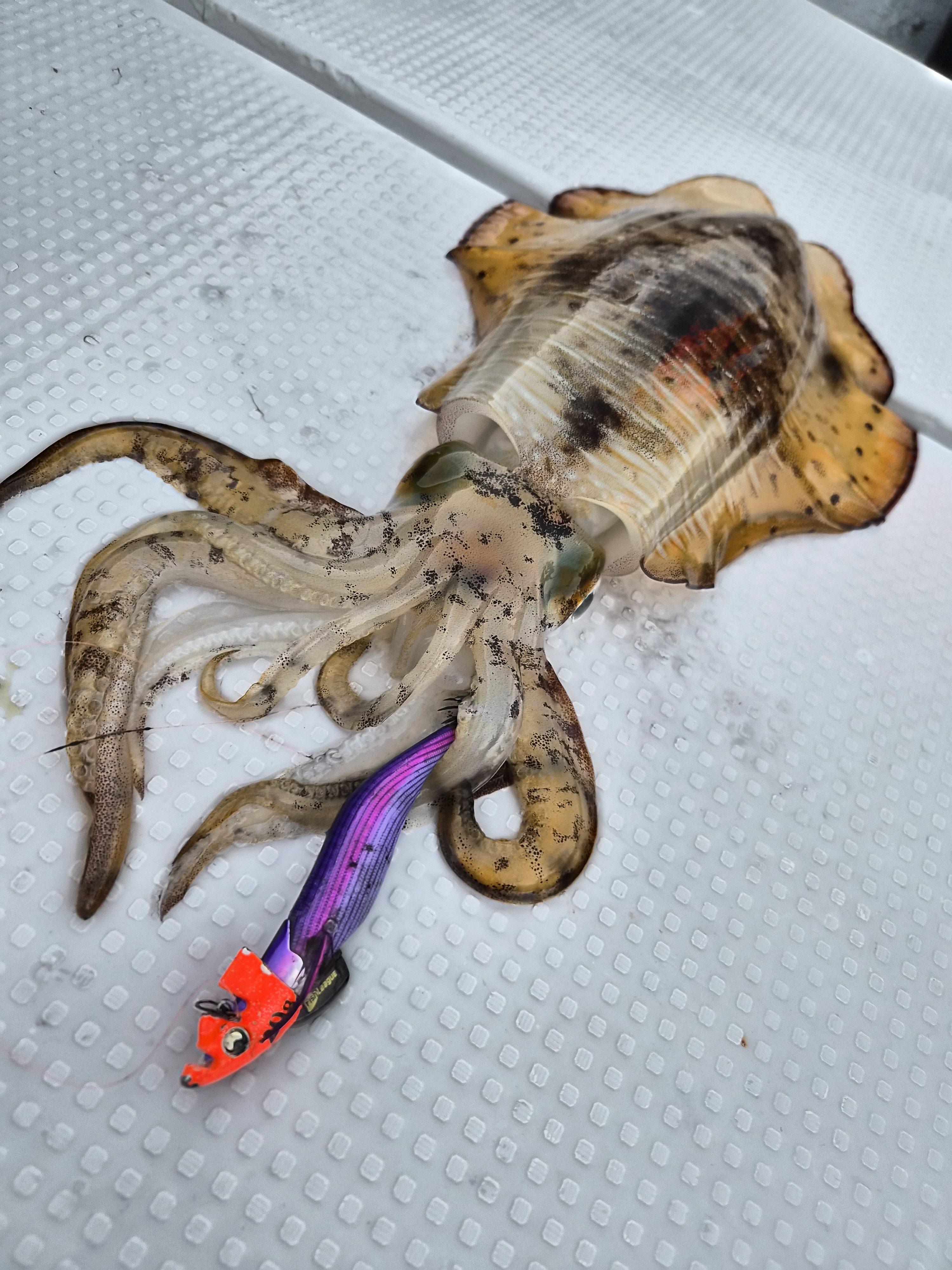2025.11.25 印刷する キロUPキャッチ📍志摩沖ティップラン 魚種 アオリイカ サイズ 最大1330g 数 あおり/5 こう/1 釣り方 ☆ティップラン 場所 三重県 スタッフ 吉田 店舗 中部 岐阜店 釣行日 2025.11.20 コメント 岐阜店スタッフの吉田です 三重県志摩市のR3.(アールスリー)様にてティップランを楽しんできました R3の船長さんは釣りも大好きで、分からないことがあれば優しく教えてくれますので初心者の方にもおすすめです 当日は5:30集合、荷物を積み込み出発 釣座はミヨシになりました 30分ほどでポイントに到着し釣りスタート 水深30m〜50m シンカーは40gまで使用 前日の釣果はTOPで3杯 その前もあまりパッとしない釣果でしたが、、、 ひと流し目すぐにアタリが! 船中ファーストヒット その後すぐに着底ヒット キロアップキャッチ(1330g) その後もポロポロ釣れて 風が吹いたタイミングでは連鎖連鎖で4人同時ヒットもあり、乗り合いの方々と楽しいひととき 午後はベタ凪で厳しい時間でしたが、、、 アオリイカ×5、モンゴウイカ×1 最近は釣果が厳しくボウズも覚悟していたので、大満足の釣行となりました 今回は、しっかりシャクってしっかり止める。が複数キャッチの鍵になったと思います 船長さんの手が空いてれば、干物もしてもらえますよ♪ 次は2キロを狙って、また志摩沖に遊びにいきたいと思います 使用した釣具 ロッド ダイワ エメラルダスEXボート 511MLS-SMT リール シマノ ヴァンフォード C3000HG ライン PE0.6号、リーダー フロロ2.5号