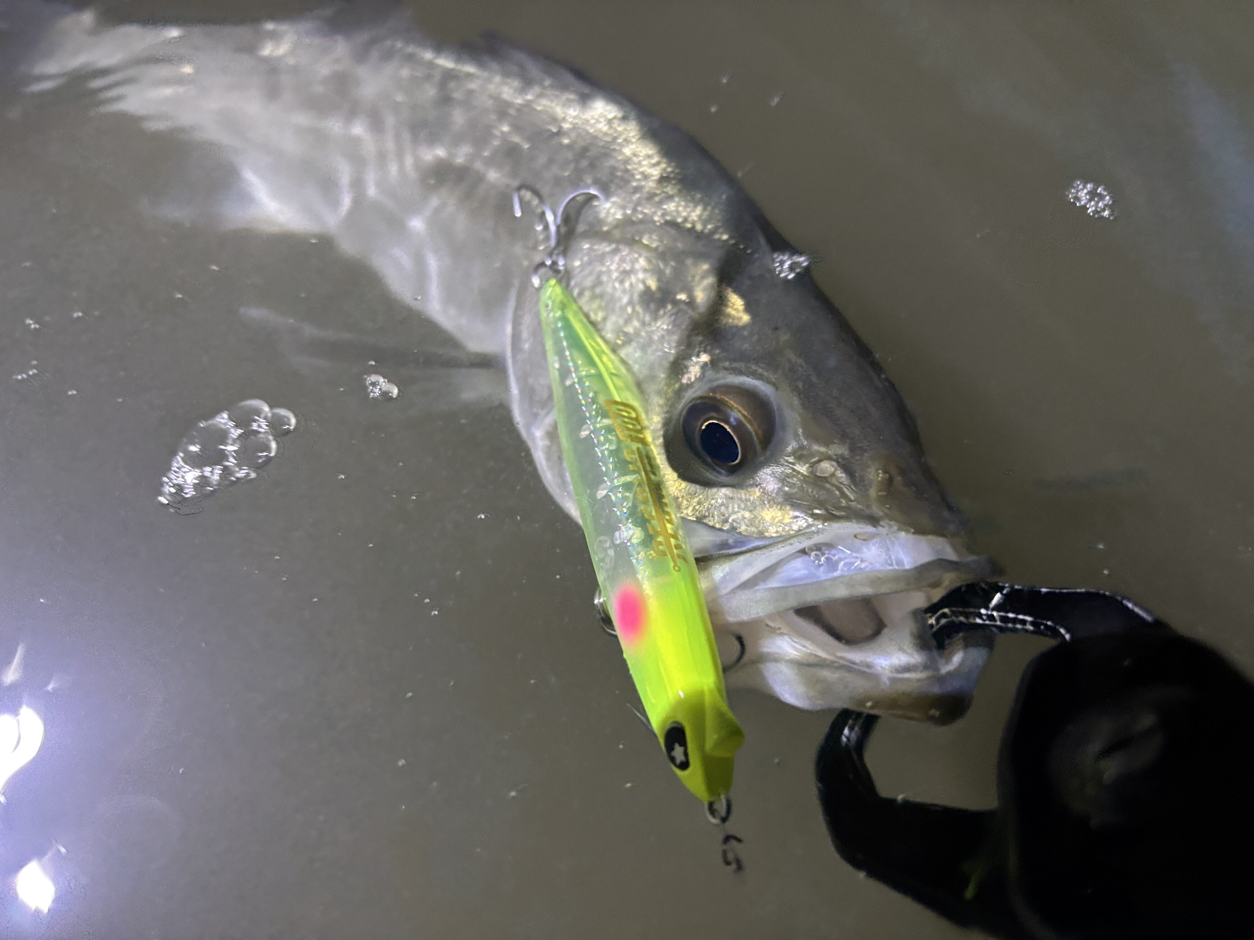 2025.11.26 印刷する 兵庫シーバス調査!2 魚種 シーバス/スズキ サイズ 50cm 数 シーバス/1匹 釣り方 ☆シーバス 場所 兵庫県 天候 晴れ スタッフ 木村直哉 店舗 リンクスウメダ店 釣行日 2025.11.20 コメント こんにちは😃リンクスウメダ店の木村です。 今回は前回同様、兵庫県の河川にシーバスのナイトゲームに行って参りました! 前回と同じ川ですがポイントについたタイミングが下げ7分だったので一番河口に近い明暗を選択してかろうじて残っている魚を釣っていく作戦。 潮位はかなり低く、ベイトっ気もほぼなしのなかなか渋そうな状況です。 手前の方はかなりシャローが続いていて流心の掘れているポイントにはしっかり魚がついていそう🧐 そこで小粒ながらしっかり飛距離が出てくれるレガーレさんのレガリア100を選択。明暗に入れ込み境目を出るか出ないかの弱々しいアクションを演出すると、 出てくれました!サイズはそこまで大きくないですが狙い通りのタイミング、ルアーで釣れてくれる魚は嬉しいですね😊 その後はすぐに干潮になり、魚もいなさそうなので終了としました。 それではまた! 使用した釣具 ロッド フージンRS93M リール 22イグジスト 4000XH