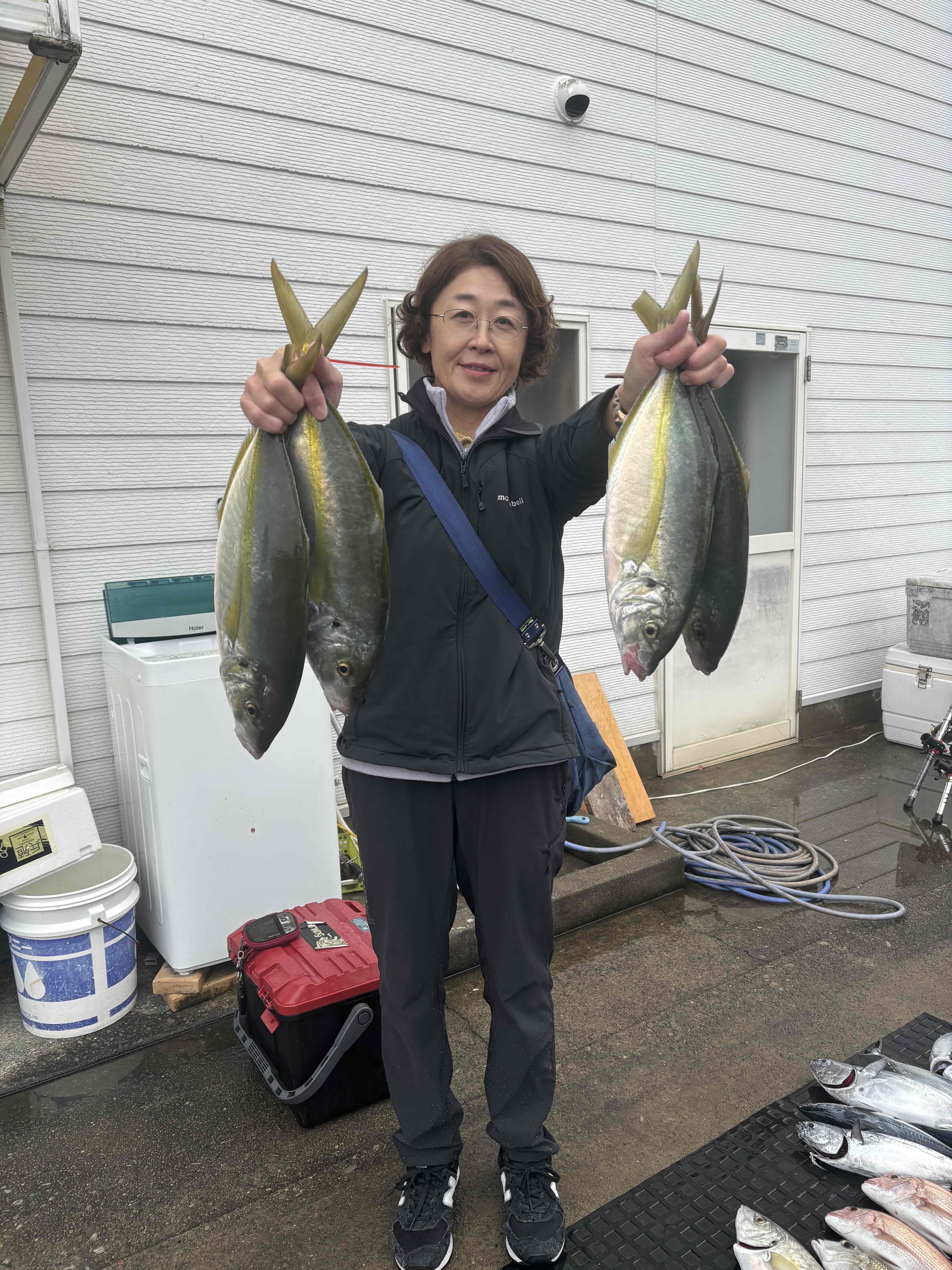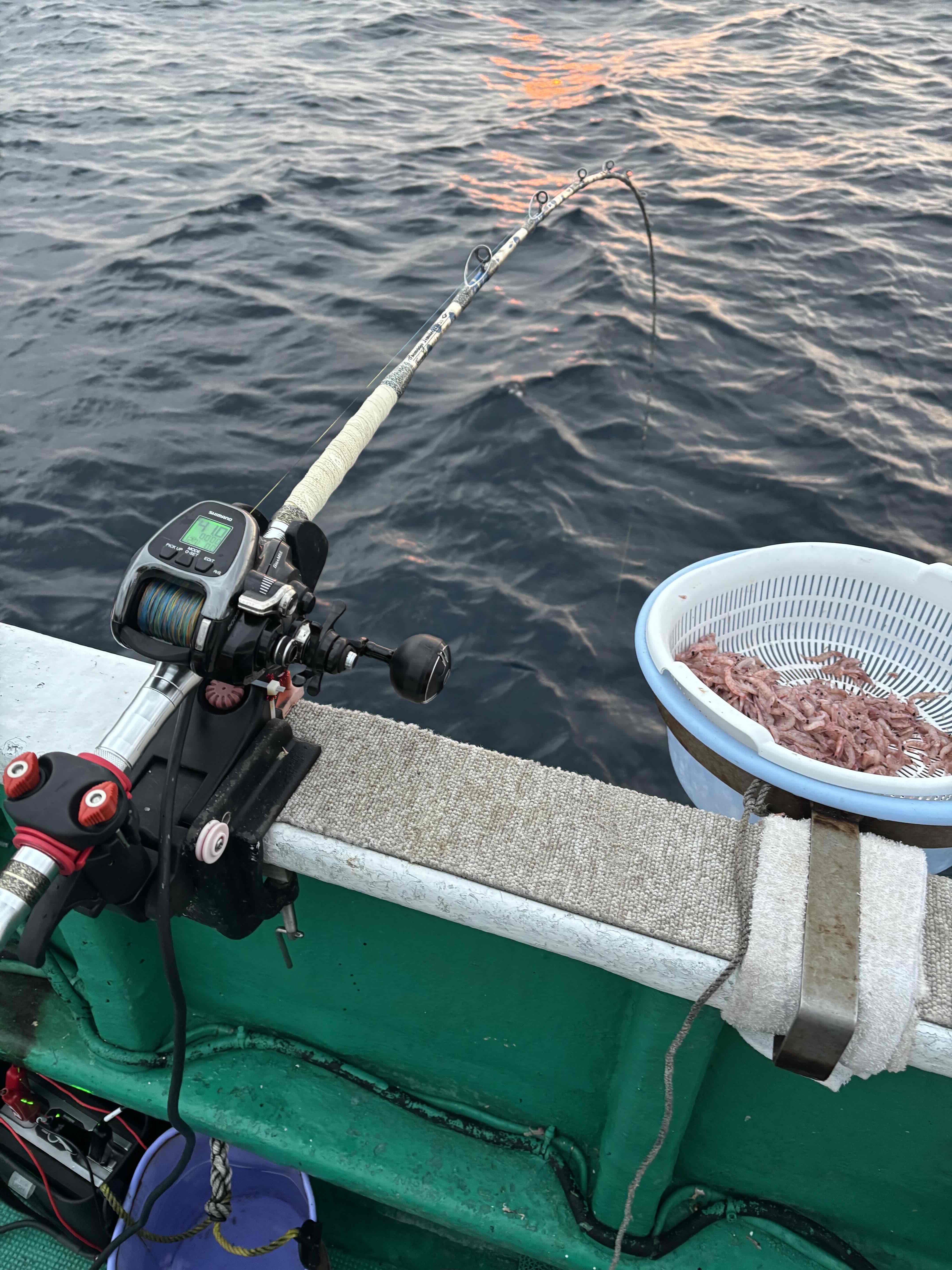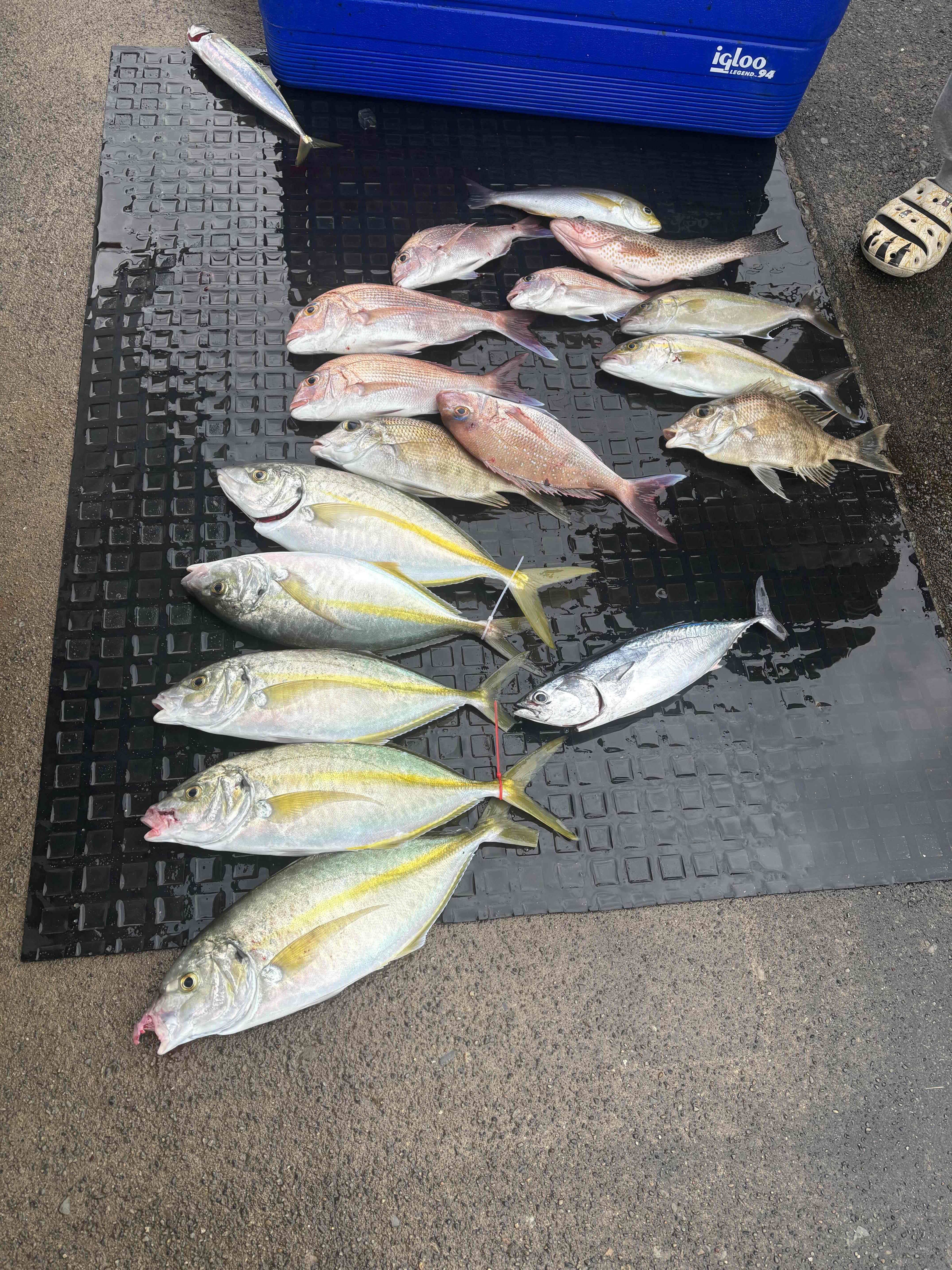 やっとシマアジが回遊開始しての釣行が出来ました。急遽決まりお客様との釣行 いつもの久美丸さんでシマアジ狙いです。今季のシマアジポイントは前年とポイントが違い見老津に近い為久美丸さんからは近い 水深も40m前後 ポイントに着くと探見丸にも反応が映ります。仕掛けを投入して底で待っていると隣の竿が一気に入り電動リールから糸が出ていきます。シマアジは底で頑張るのでなかなか上がってこない引き ゆっくり手でサポートしてあげてきます。上がってきたのは良型シマアジ かなりの期待が持てる感じ 天気が悪いので雨が降り出しやりにくいですが船中シマアジが上がっています。僕も魚はヒットしますが真鯛 鯖 ムロアジと外道ばかり 仕掛けも長さ2m 4m ウイリー仕掛けなど変えていくもシマアジからの反応が無く苦戦 隣は4匹良型が釣れています。持っていた細い仕掛け 小針に変えて投入 コマセを打って待っているとヒット ドラグがなり上がってこないゆっくりやり取りしながら上がってきたのはシマアジゲット やっとシマアジを釣りあげることできました。 今季はシマアジ回遊が遅かったですが終わるのは例年と同じ感じ?釣果があるタイミングでの釣行をお勧めします。