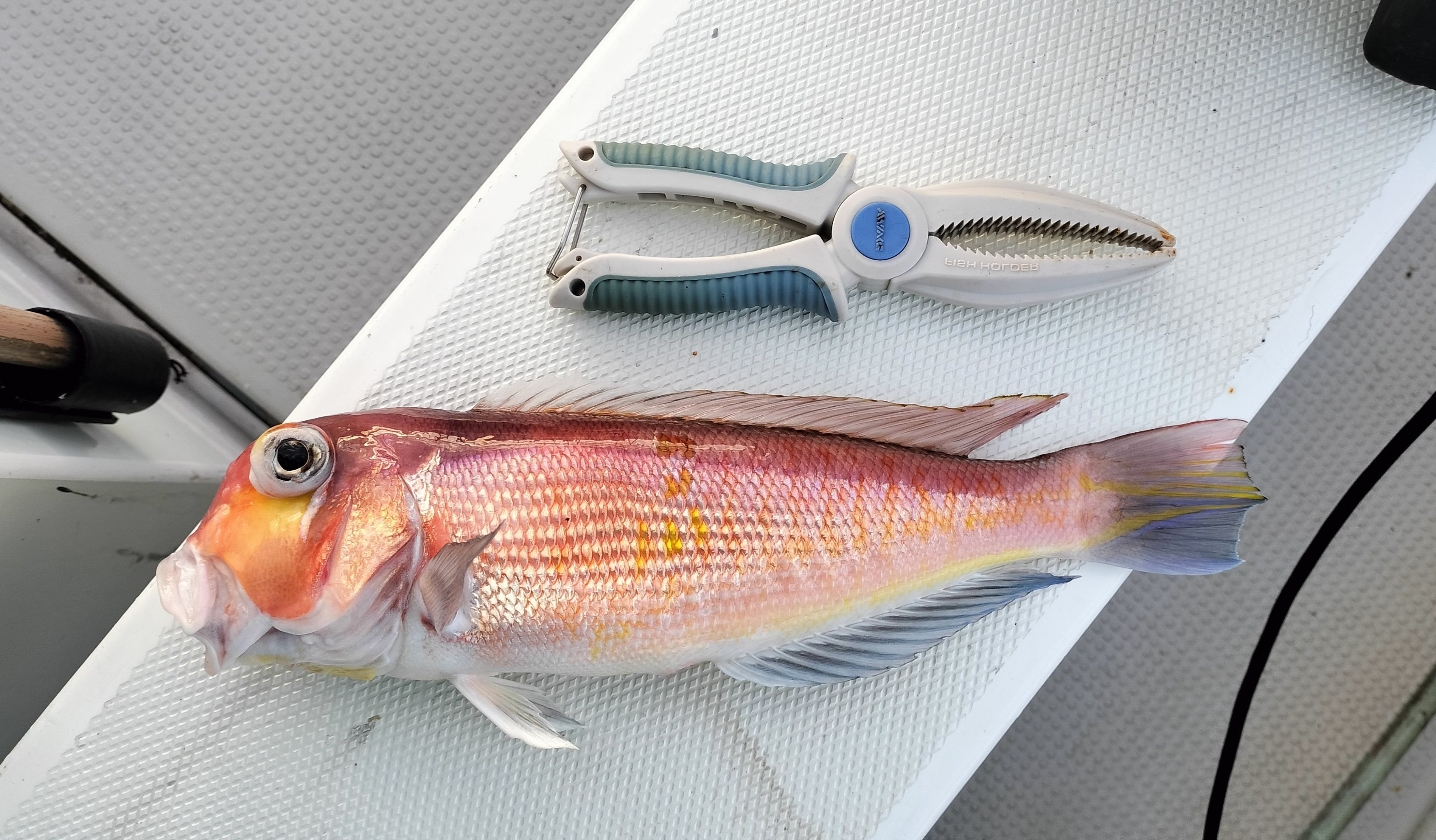 アマダイらしい引き込みを数回かわし、船長の差し出すタモに収まったのは後検量35センチアップの良型。