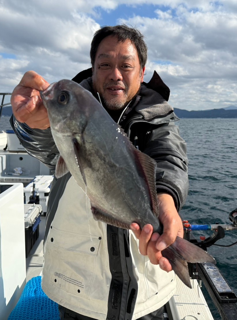 それでも底から5mの範囲を3本バリの胴突き仕掛けで探っていると小さ目ながらも明確なアタリが出て、G氏ともども良型のシロムツをゲット。