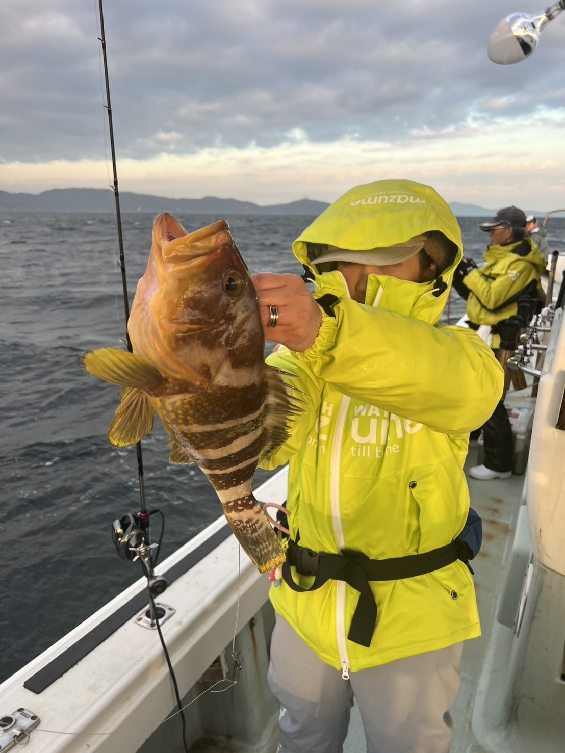 2025.12.05 印刷する 第2弾 トラフグ釣行!! 魚種 フグ 数 サバフグ…3匹 アオハタ…1匹 釣り方 ☆その他船釣り 場所 三重県 天候 晴れ スタッフ 田中麗香 店舗 堺店 釣行日 2025.12.01 コメント 先月に引き続き、トラフグ釣行へ堺店スタッフとお客様で行ってきました! 今回も三重にある「魚勘丸」さんです! 明け方5時過ぎに旅館で受付を済ませ港まで。港に着き乗船準備をしていざ出発!!。ポイントに着くまでにエサの用意や仕掛けを取付て、すぐ釣りが出来る状態にしておきます。 ポイントに着き仕掛け投入。底まで落として少しだけ巻いて待ってみます。。。が、反応なし。誘ってみますが反応なし(´;ω;`) たとえトラフグが釣れなくても何か魚を持って帰りたい。。。 始まったばかりなので焦らず頑張ろう!ってな感じで続けていきました。 そんな感じでやってると誘ってる最中にグッと重くなり「何か掛かった!」と。電動リールを巻こうとしますが加減がわからず早いスピードで巻いてしまい結果スンと軽くなり魚はゲットできず。 そんなこんなで当たりをまってると またグイっと重い感触、巻き上げてみるとサバフグが✨ とりあえず1匹釣れたので安心。 その後も掛かってくれるのを待ちますが 、厳しい時間も多く……。エサを確認しても全く触られてない状態、エサのイワシやサンマにプラスしてアルゼンチン赤エビを付けて試してもどれも触られてない。 などの時間を経て、後にサバフグ2匹、アオハタ1匹のトータル4匹の結果で終了しました。 今回のトラフグは、一緒に行ったお客様が見事に釣り上げましたよ👏 船中で1人だけ!! すごっっ🙌 また行ける機会があれば頑張りたいて思います😊 使用した釣具 ロッド サーベルマスターエクスチューン リール シーボーグ300j