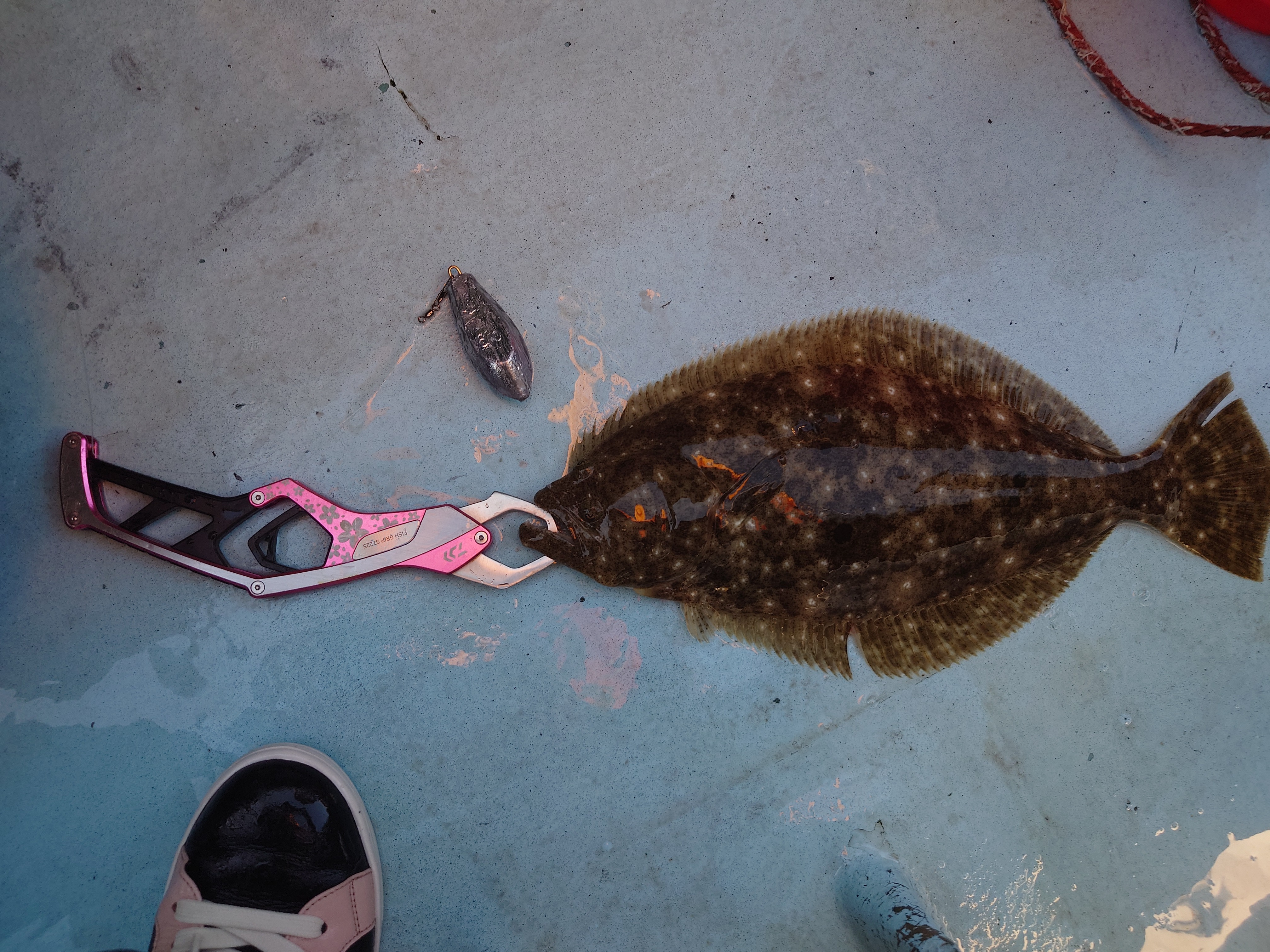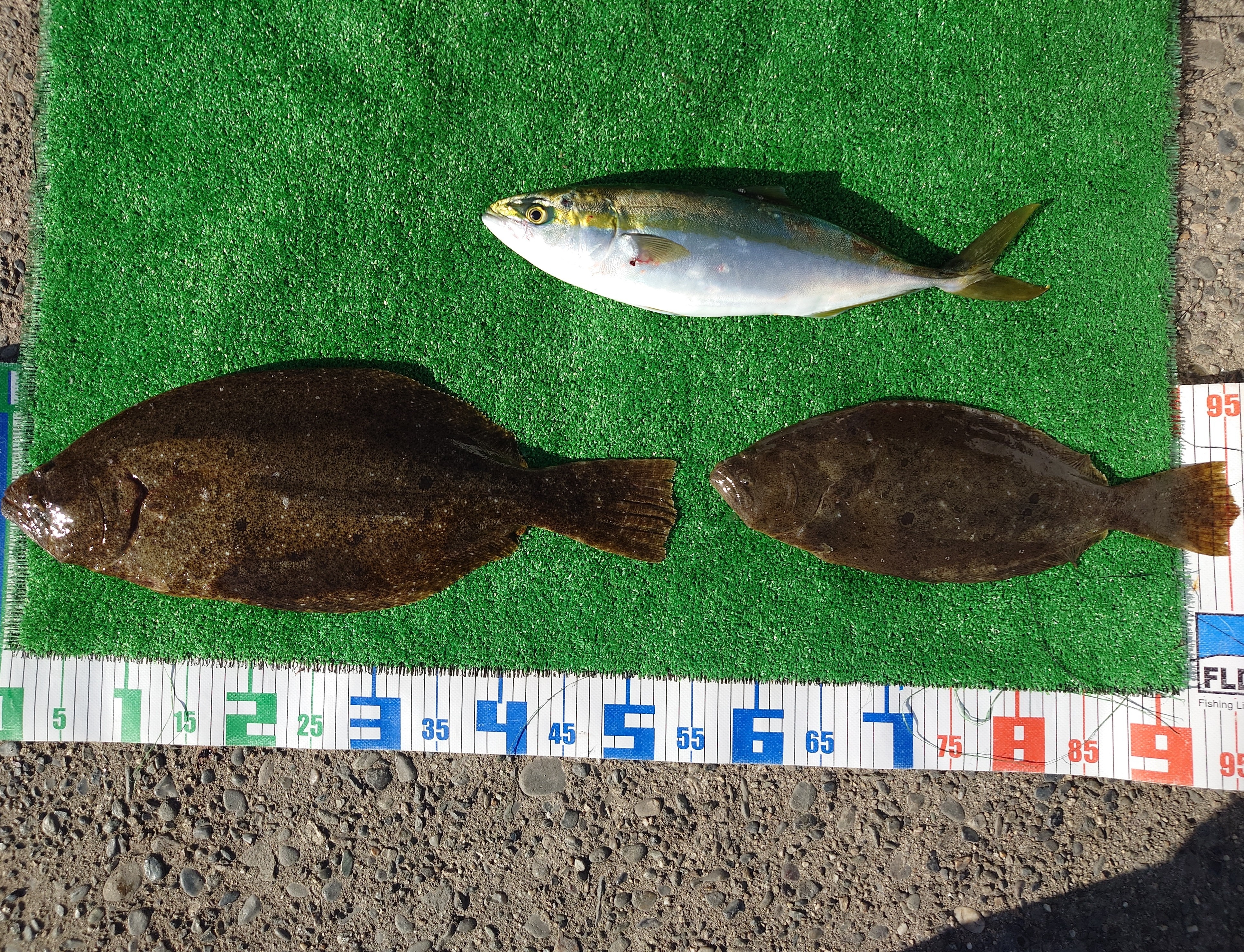 2025.12.08 印刷する 美味しいヒラメが食べたくて 魚種 ヒラメ サイズ 54㎝ 数 ヒラメ/2匹 ハマチ/1匹 釣り方 泳がせ釣り 場所 愛知県 スタッフ 丹羽 かおり 店舗 名古屋小牧店 釣行日 2025.11.30 コメント こんにちは、つり具のブンブン名古屋小牧店の丹羽です! 先週食べたヒラメが美味しすぎて・・・笑 また食べたくて、2週連続、伊勢湾泳がせ釣りに行ってきました。 今回も、お世話になったのは竜宝丸さん。 そして、前回43メートルほどでなかなかしんどく、周りの方も8割が電動リールでしたので、 今回はフォースマスターに頑張ってもらいました。おもりは60号。 今回のポイントは25~10メートルと、前回よりだいぶ浅くやりやすかったです。 同じく根がありますが、反省点と思い気をつけて・・・底を感じたらすぐに巻いて慎重に・慎重に・・・ なかなか当たりは無く、1時間過ぎた頃に、ゴゴン!と。あぁエサだけ持っていかれたかなぁと巻き上げると、ググッと生命反応を感じ!?まさかまさかの居食いをしていたようです。 うれしい1匹目は40㎝程のヒラメでした。 その後はハマチが船内あちこちで連れだし、私も1匹ゲット。 隣の同行者は青物フィーバーしていました。 そして、隣でよく引く青物らしき反応。うわぁまつりそう・・どうしよか・・と、 避けながら、1回、2回と巻いたところでドンッ!! うわぁ、こっちも青物かかったかも汗、まつる!大変!と思って全力で巻き上げると・・・ なんと、54㎝のひらめです。これはうれしいぃぃぃ!!! その後は静かな時間が過ぎ、たまに歯形が付くだけで、喰いきらない・・・で終了となりました。 結果は全部で3匹。もう一匹は追加したかった、ちょっとだけ残念、でもおっきいの釣れてうれしい。 なんだかんだといいながら、今回も楽しい一日になりました。 そして今回は、刺身、昆布締め、ムニエル。 初の試みで、骨・皮せんべい。これがまた大人気であっという間になくなる程美味しかったです。 どこ食べても美味しいなんて、ホントにヒラメは素敵です! そして、そんなヒラメ釣りの仕掛けが、なんと只今セール中です!! 種類もたくさんそろってますので、是非見に来てくださいネ! そしてそして、雪もチラついたりで、ホントに寒くなりましたよねっ。 私は今回、上から下まで光電子インナーと、あったか防寒着で震える事無く、楽しい釣行になりましたよ! 皆様も、寒さ対策万全で、冬の釣りを存分に楽しんでくださいね! 使用した釣具 ロッド リーディング リール フォースマスター600