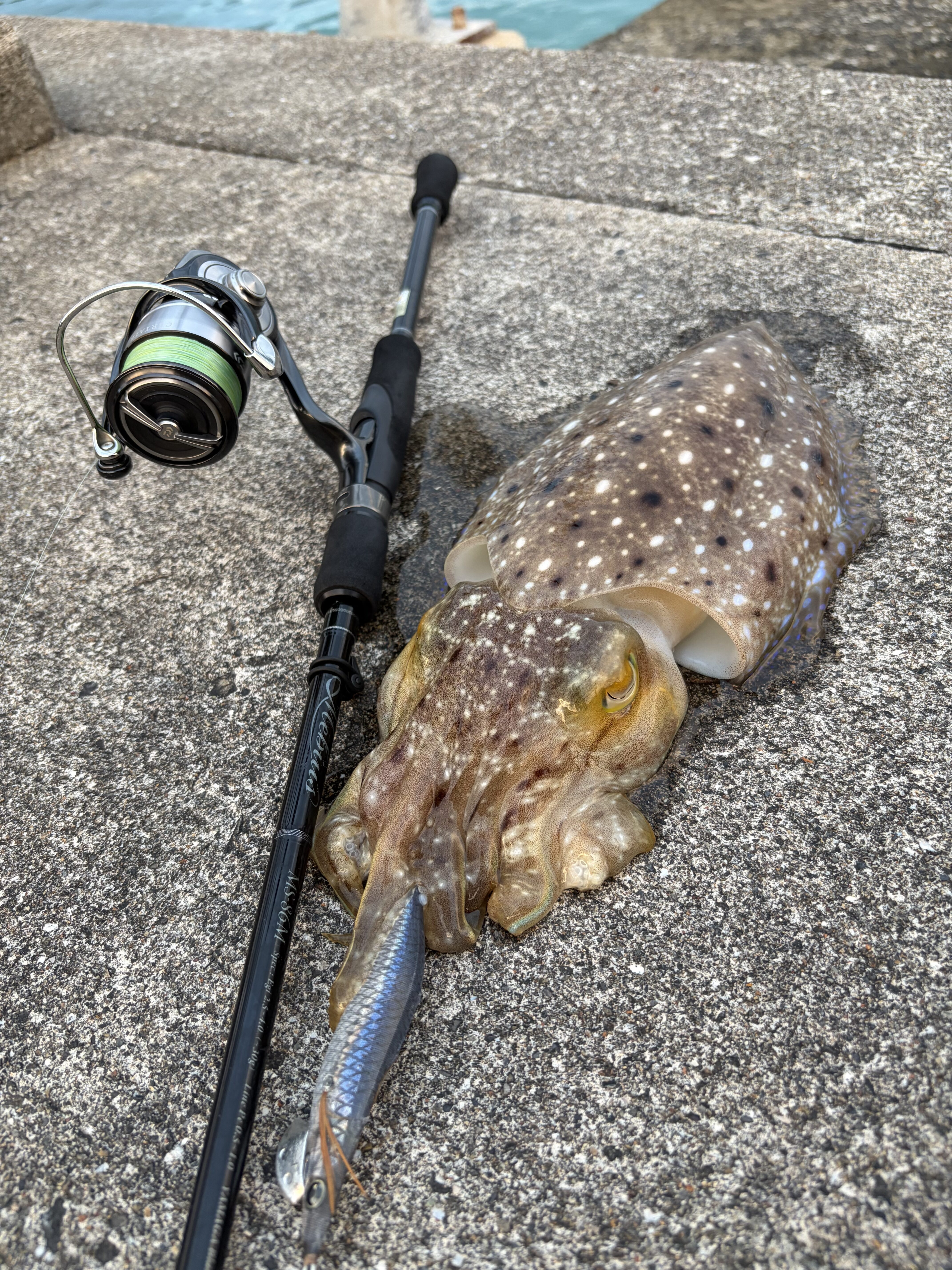 2025.12.08 印刷する 奄美遠征1日目 数 コブシメ、クワイカ 釣り方 ☆エギング 場所 鹿児島県 スタッフ 今中颯 店舗 イオン相模原店 釣行日 2025.12.02 コメント お疲れ様です。今中です。 4連休いただき、奄美大島に行ってきました。 伊丹空港から奄美空港まで行き、向かったは先は加計呂麻島 夕方頃に着き、さっそく釣りへ。 スーパーライトジギングをしましたが、反応はなし。 エギングに切り替え、一投目でヒット‼️ 上がってきたのは南西諸島ではお馴染みの800gのコブシメ いわゆる「コウイカ」ですが、ここのコウイカは10kgを超える個体もいるそうです。 早速、夕飯ゲット‼️ 気づい時には日が暮れ、黄昏時。 釣りをしていたところは桟橋でしたので外灯が点き始め、小魚が寄ってきました。 ひき続きエギングをしていると、イカヒット‼️ 上がってきたのは、クワイカ。アオリイカの一種で大きくはならないイカですが、ほぼ最大サイズに近い個体でした。 暗くなってき、風も強くなってきたので 1日目はこれにて終了。 明日はビッグゲームです😎 使用した釣具 ロッド ヤマガブランクス メビウス86M リール 24セルテートLT2500