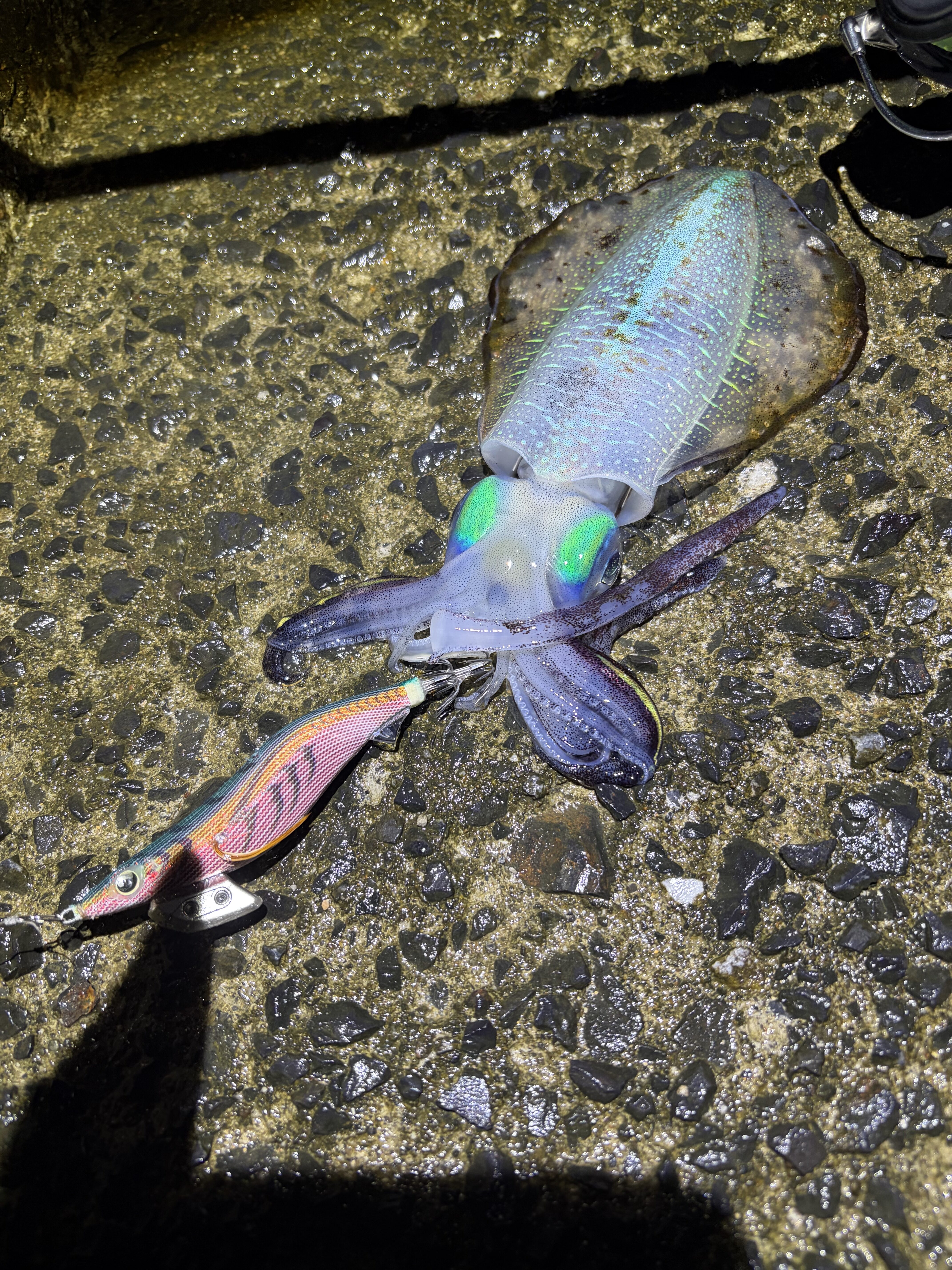 上がってきたのは、クワイカ。アオリイカの一種で大きくはならないイカですが、ほぼ最大サイズに近い個体でした。