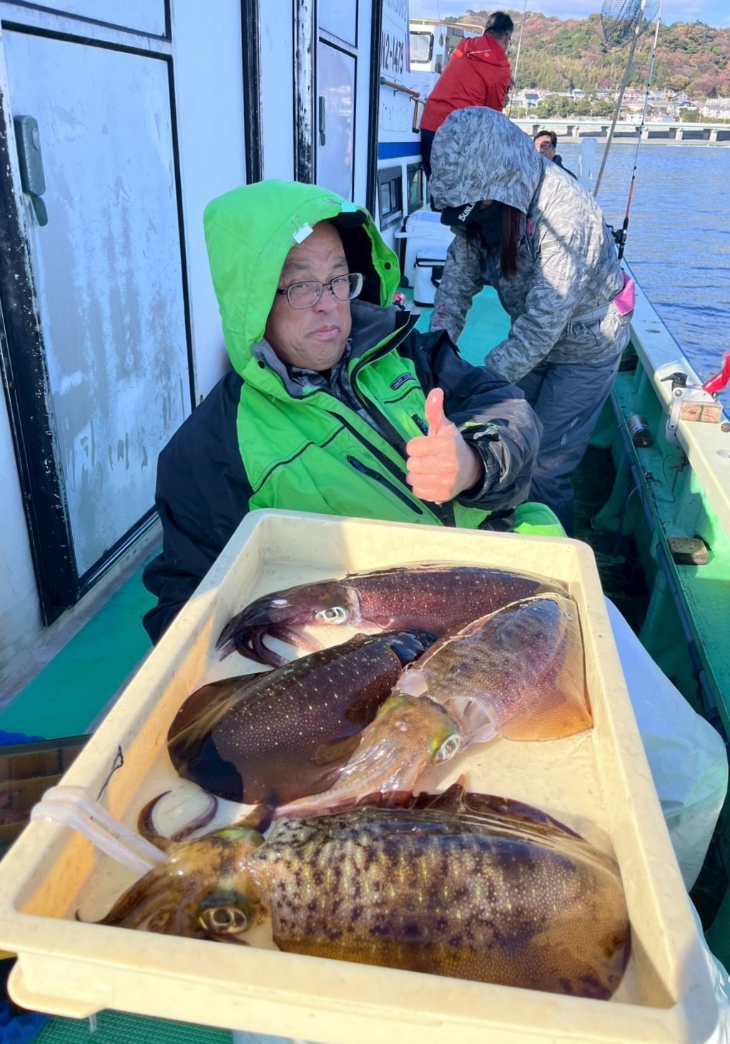 更に相模川河口の好ポイントでは左舷ミヨシのアオリイカ名人と石井さんとでダブルヒットが出て、石井さんはキロ弱の良型をゲット!!