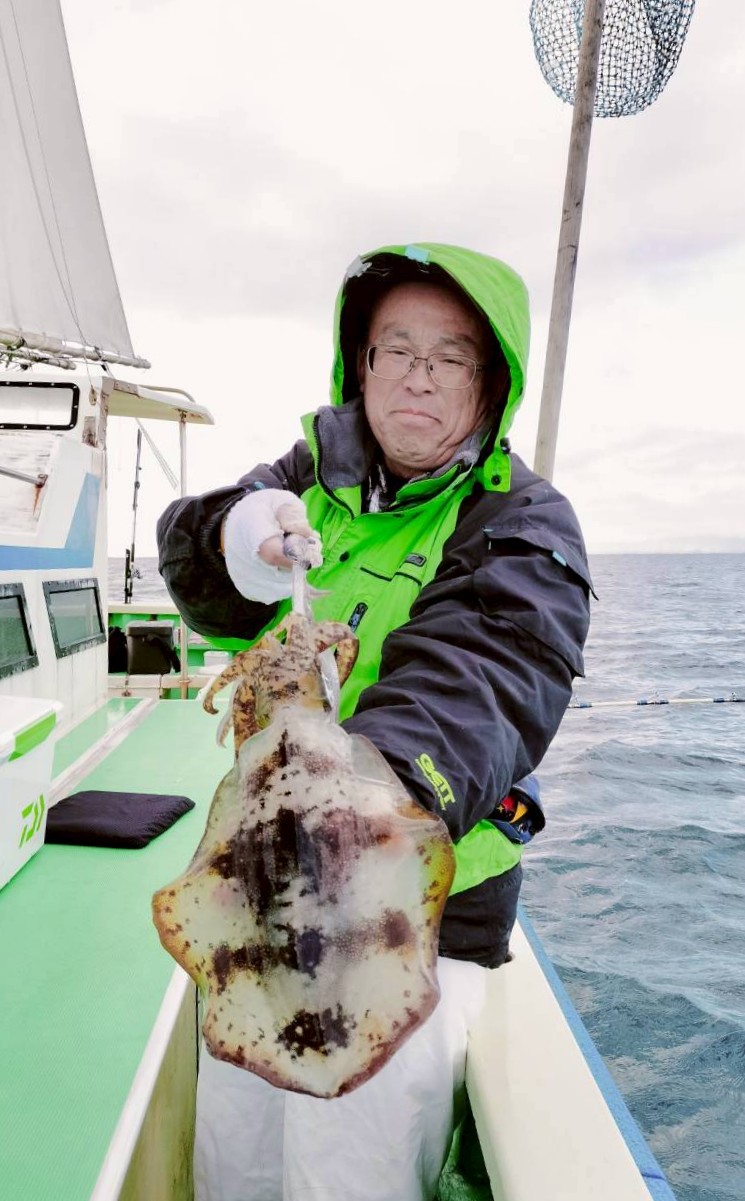終盤戦は風向きが180度変わってしまい、アオリイカのヒットは両側のトモに偏る結果となり定刻の13時半にストップフィッシング。