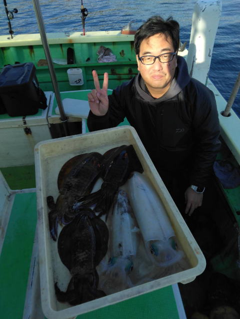 更に相模川河口の好ポイントでは左舷ミヨシのアオリイカ名人と石井さんとでダブルヒットが出て、石井さんはキロ弱の良型をゲット!!
