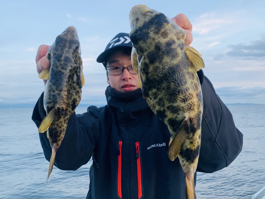 2025.12.17 印刷する 冬の大阪湾フグ釣り12月10日 魚種 フグ 数 ベラ、ショウサイフグ、アカメフグ 釣り方 ☆カットウフグ 場所 兵庫県 スタッフ 厨 宏樹 店舗 関西 西昆陽店 釣行日 2025.12.10 コメント こんにちは。西昆陽店の厨(くりや)です。 今回は今シーズン初のアカメ狙いで 垂水漁港の虎ノ介さんにてフグ釣りに行ってきました。 午後便で1時出船。水深10メートル前後の浅場で激しい岩礁エリアを攻めますので根掛かりしても、掛け針だけなくなるようにハリス止め仕様の捨てカットウの仕掛けで狙います。 水深浅くオモリは10号で繊細なアタリをとれるようにショウサイフグ狙いとは違い、湾フグの竿で狙います。 まだシーズン序盤で水温が高いからかアタリは多くもリリースサイズのショウサイフグと磯ベラのアタリが激しく本命があたる前にエサが取られます。 しかしなんとか小型ですが本命を釣ることができました! 寒波で水温が落ちると磯ベラや小型のショウサイフグは動きが鈍くなりますが、本命のアカメは厳寒期がベストシーズンですので、今シーズンも通いこんでいきたいと思います。 こんな大型も狙えます。※この写真は去年のものです。 使用した釣具 リール アドミラA100XHL 竿 湾フグFT170 道糸 PEライン1号 ショックリーダー フロロカーボン6号 仕掛け 自作カットウ仕掛け オモリ 10号 エサ アルゼンチン赤エビ